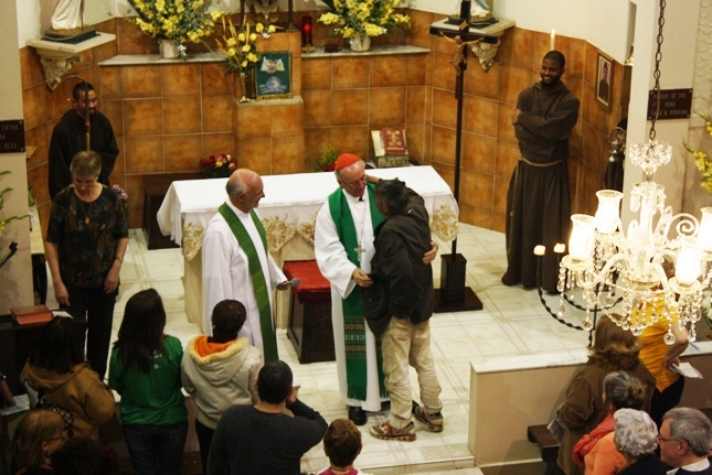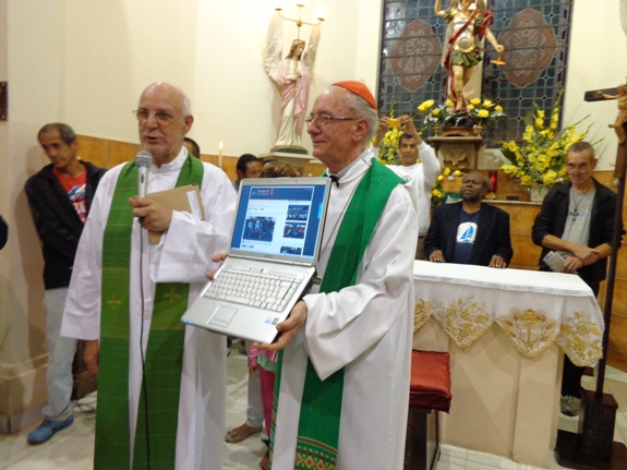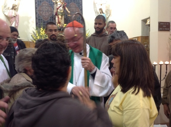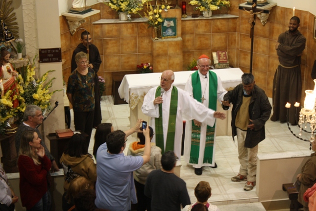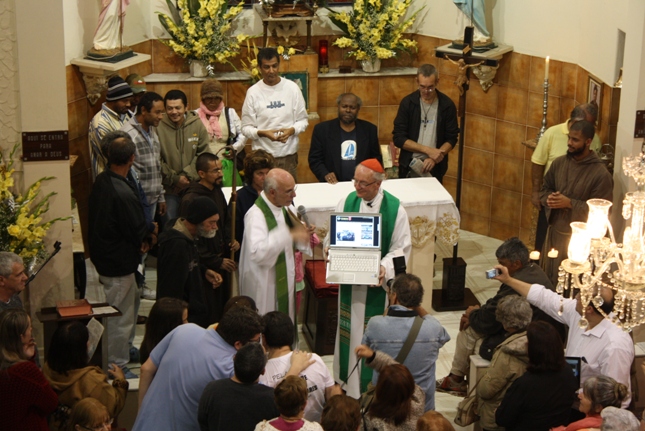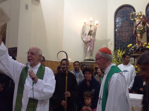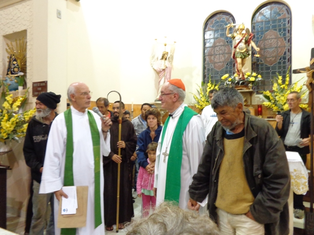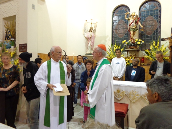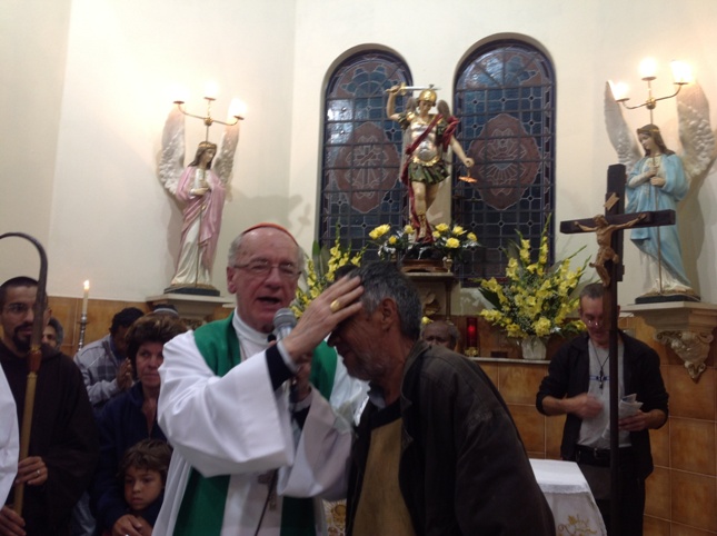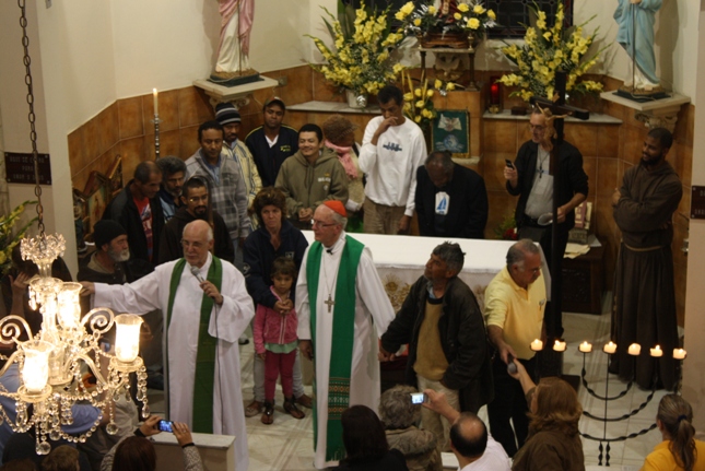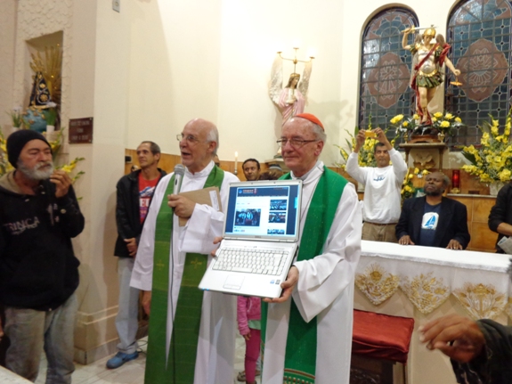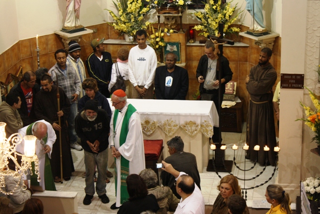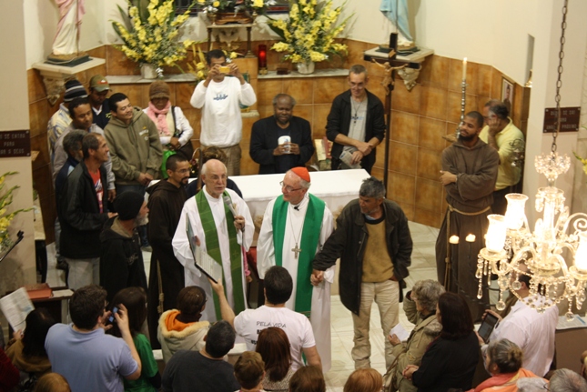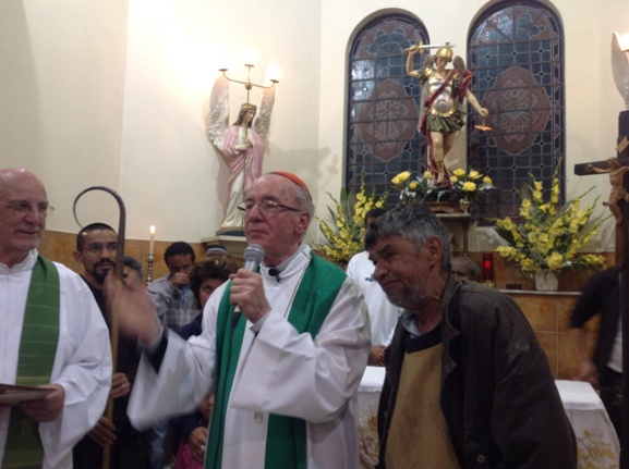 Na missa das 18hs, presidida por Dom Cláudio Hummes e concelebrada pelo Pe Júlio Lancellotti, a homília sobre a parábola do Senhor Jesus sobre o rico,  o pobre Lázaro e a vida eterna. A igreja mostrando o caminho. Por oportuno, chegaram moradores de rua e também aqueles acolhidos pela Casa de Oração do Povo da Rua, da Missão Belém, que deram um grande abraço do Arcebispo emérito de São Paulo. No final da missa, o Pe Julio pediu e Dom Cláudio aceitou levar cartas da Comunidade São Miguel e da Pastoral do Povo da Rua ao Papa Francisco.