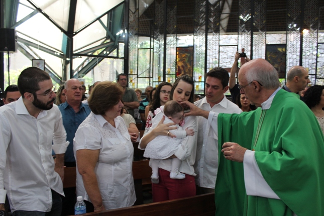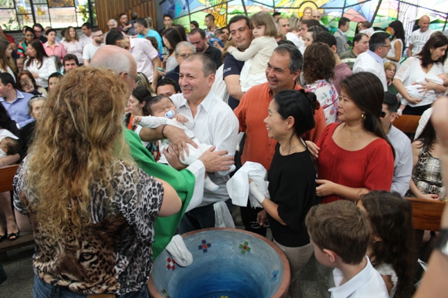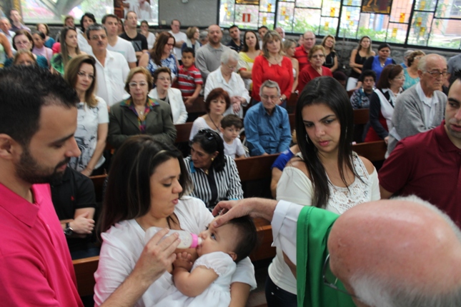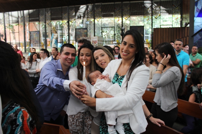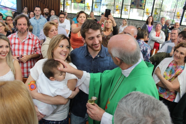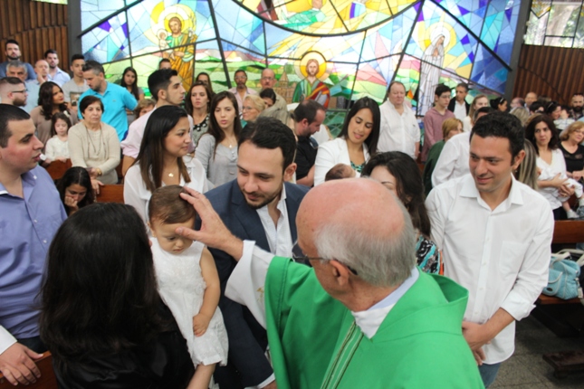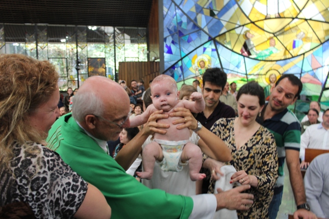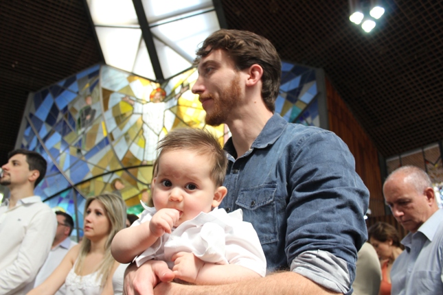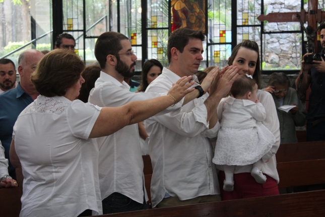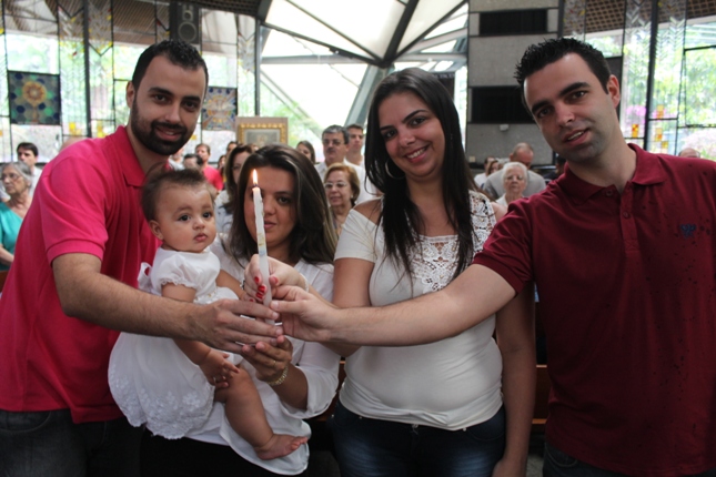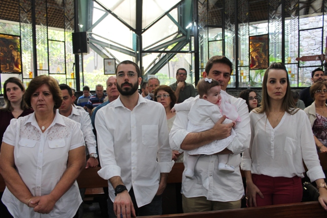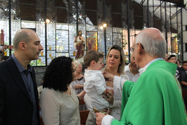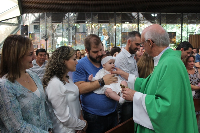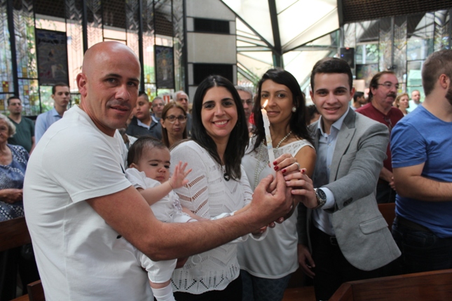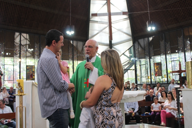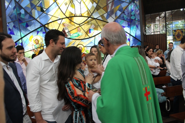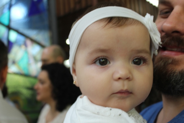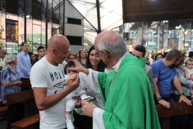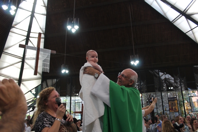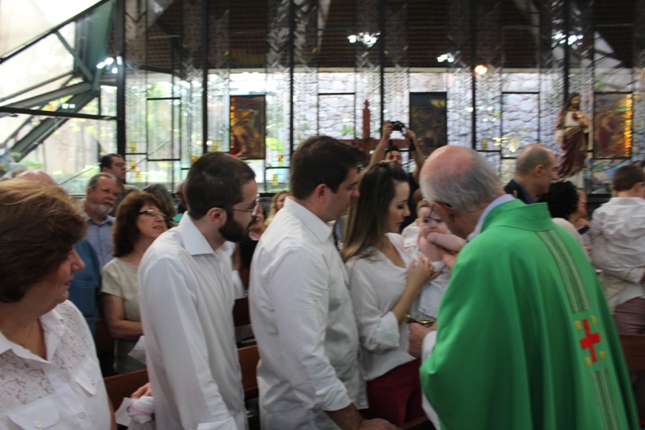 Mais 16 crianças foram batizadas na Comunidade São Miguel Arcanjo. Capela universitária São Judas Tadeu lotada desde as 9h30. Depois do batizado a celebração eucarística, onde a Marisa e o Tiago, papais da Manuela, também receberam o sacramento do casamento.