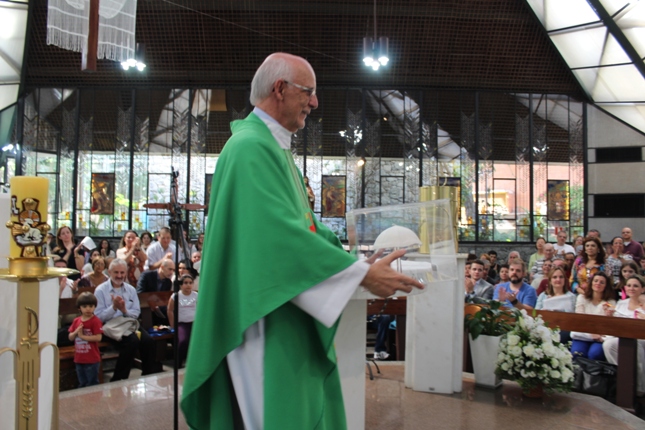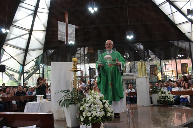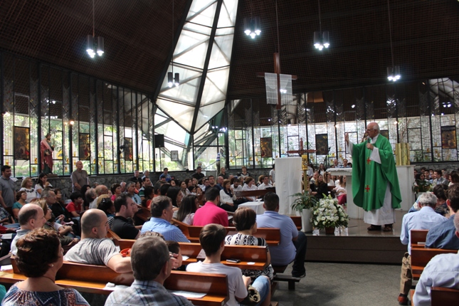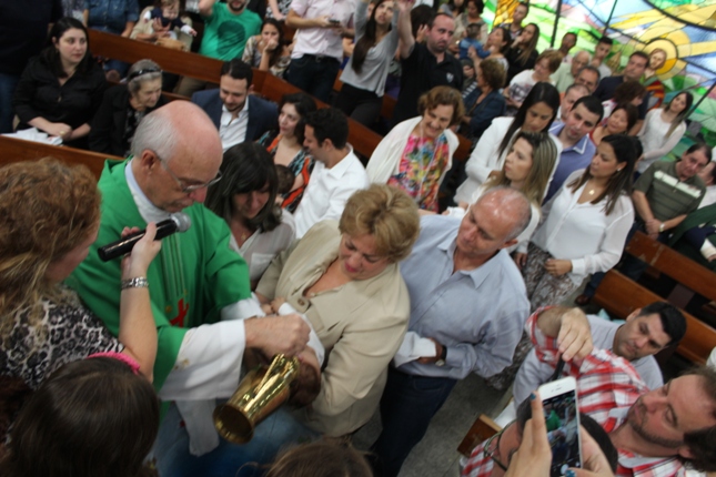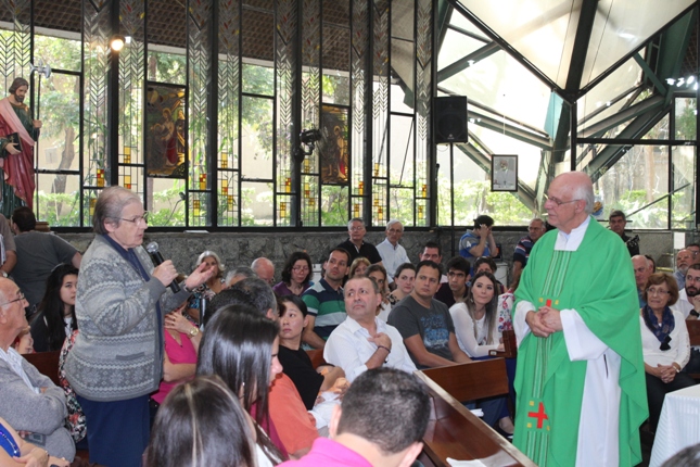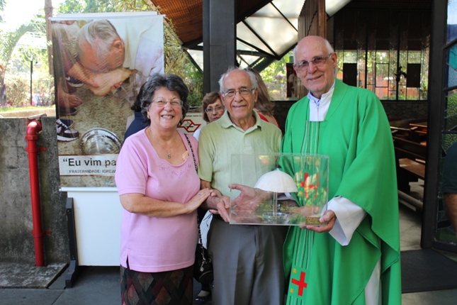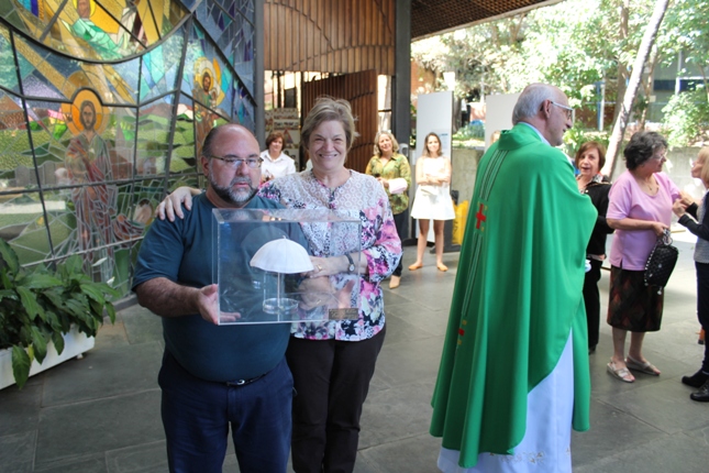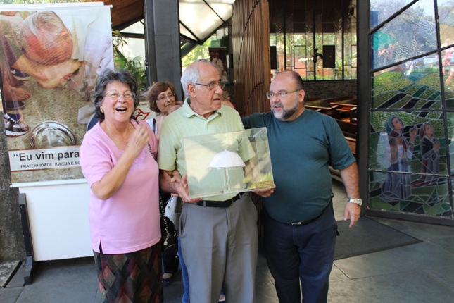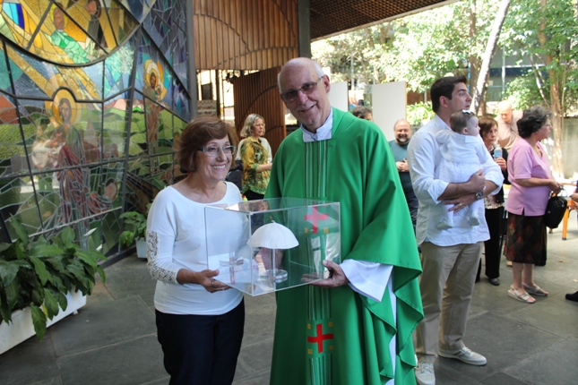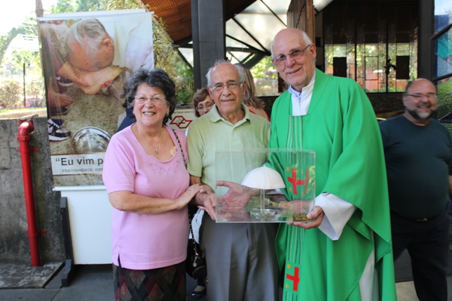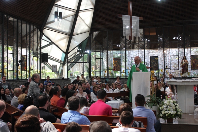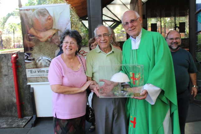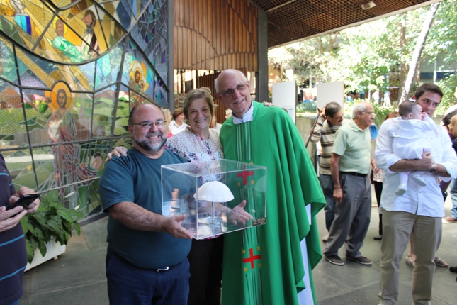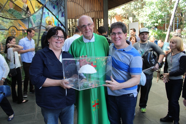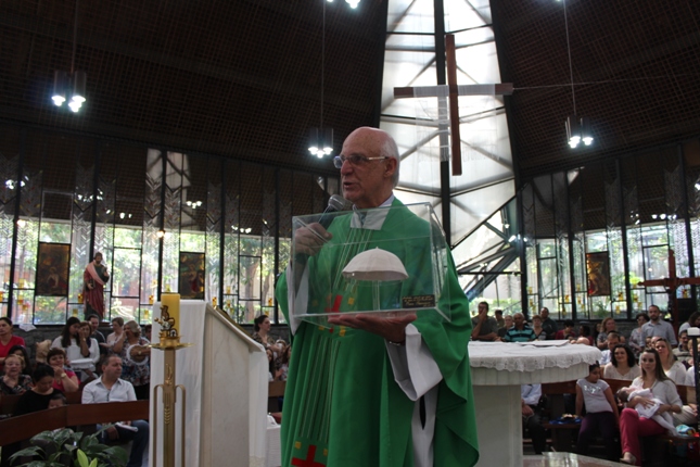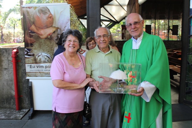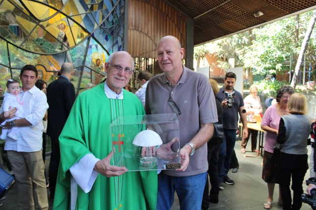No final da celebração, o Pe Julio mostrou o presente que o Papa Francisco enviou para a Pastoral do Povo da Rua. Ao receber presentes da Pastoral do Povo da Rua, o Papa Francisco imediatamente retribuiu com a entrega do solidéu que usava. Na ocasião mandou uma bonita mensagem. No segundo vídeo o Pe Julio fez a narrativa: http://www.oarcanjo.net/site/index.php/blog/video-homilia-do-pe-julio-em-23082015-21o-domingo-do-tempo-comum/