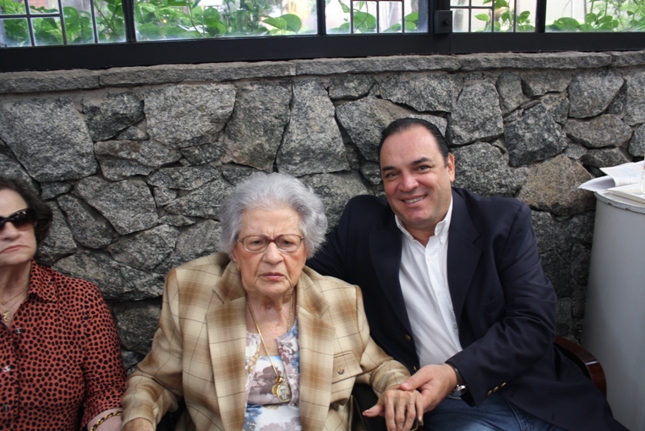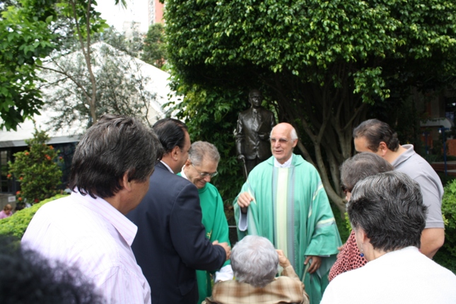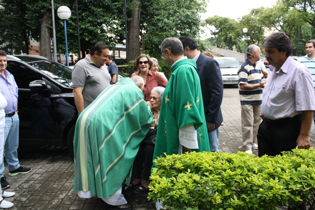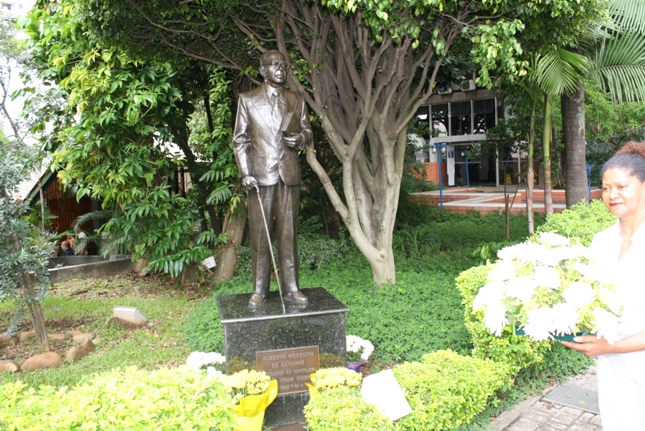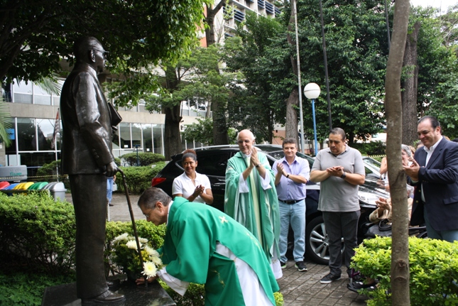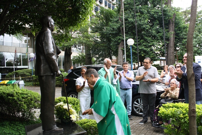 No final da missa, acompanhamos a Prof. Alzira na colocação de flores na estátua do Prof. Mesquita.