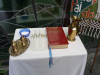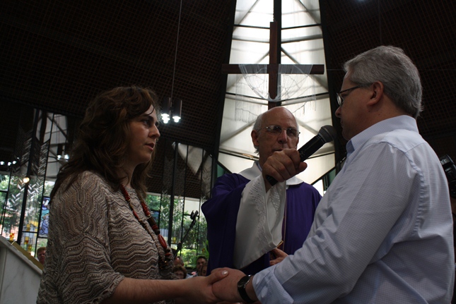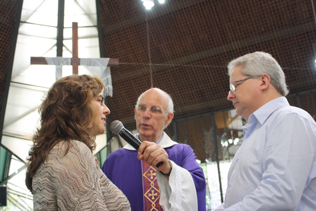 Receberam as bênçãos do casamento, os pais do Joaquim, a Elodimara Donata Correia e o José Roberto Agostini Valentini.