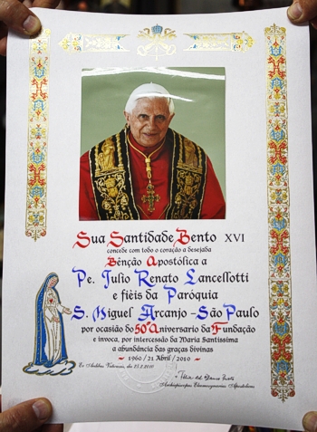 O Papa Bento XVI concedeu a Bênção Apostólica ao Pe. Julio Lancellotti, por ocasião de seu jubileu de prata, e à nossa paróquia e comunidade, por ocasião do jubileu de ouro da São Miguel Arcanjo.