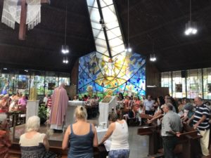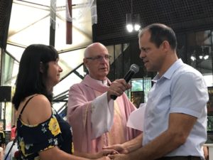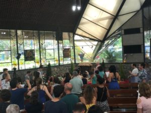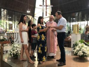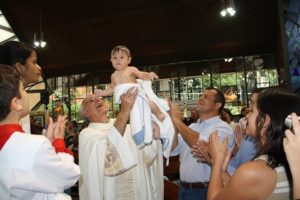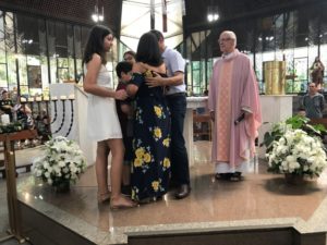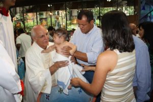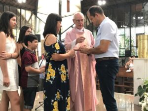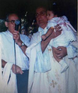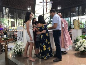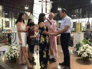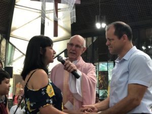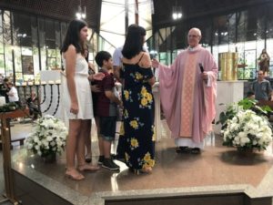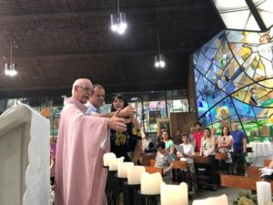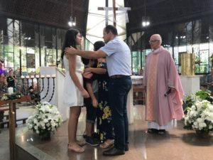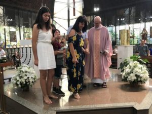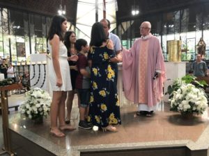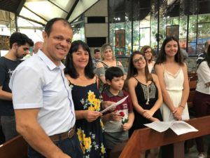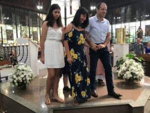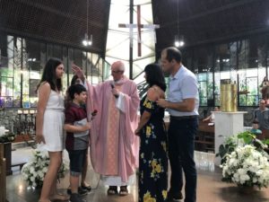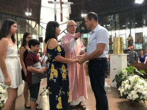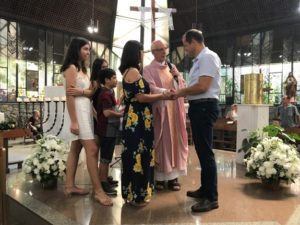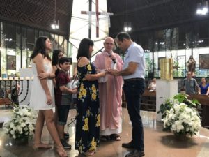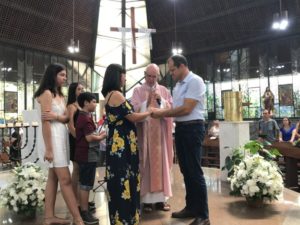 Casaram há 25 anos e vieram dizer que fizeram promessas e as estão cumprindo. Casamento que deu frutos, igualmente batizados na Comunidade São Miguel Arcano, a Amanda em 1997, a Alícia em 2003 e o André Luiz em 2009 (um domingo de páscoa).