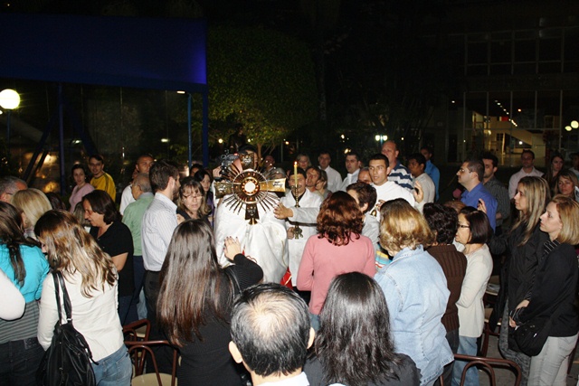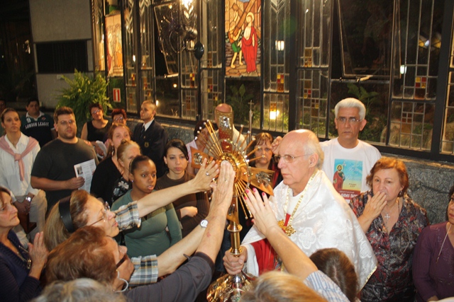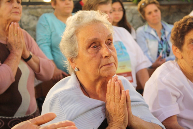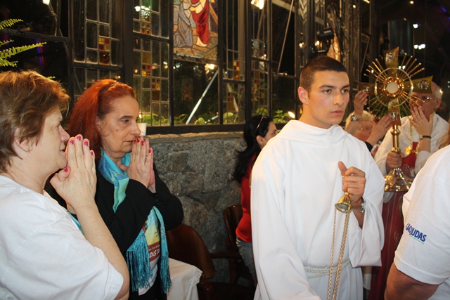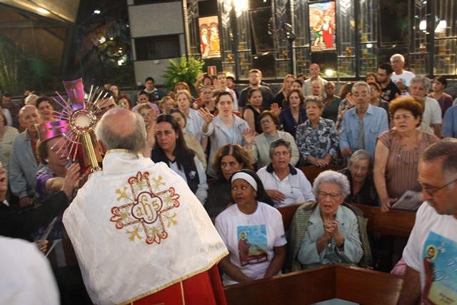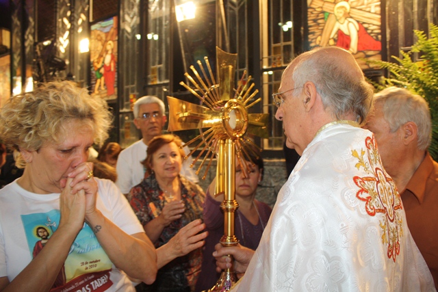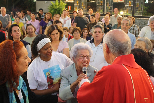 A foto da Dona Ana e Professora Liliam, juntas, lindas e queridas…. enquanto o Pe. Julio estava caminhando com o Santíssimo está comovente ! A da senhora, com blusa azul, com as mãos juntas , está perfeita também !