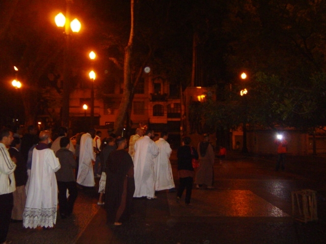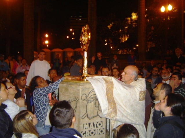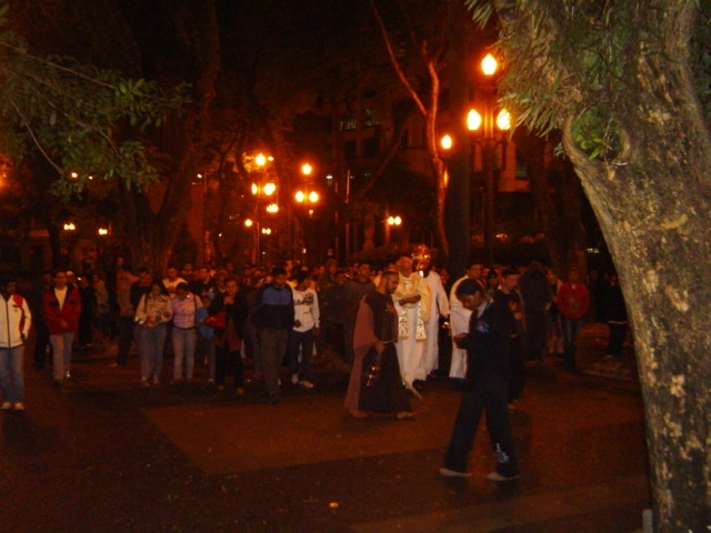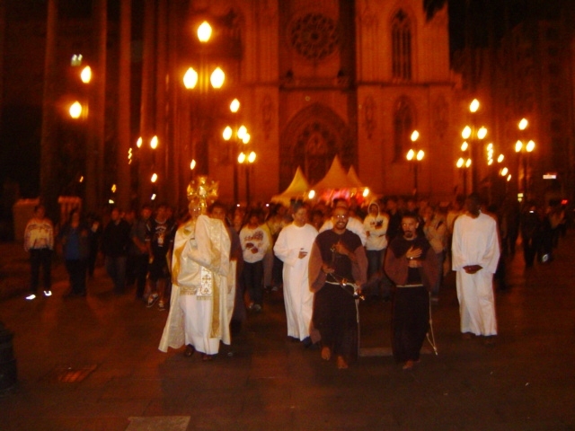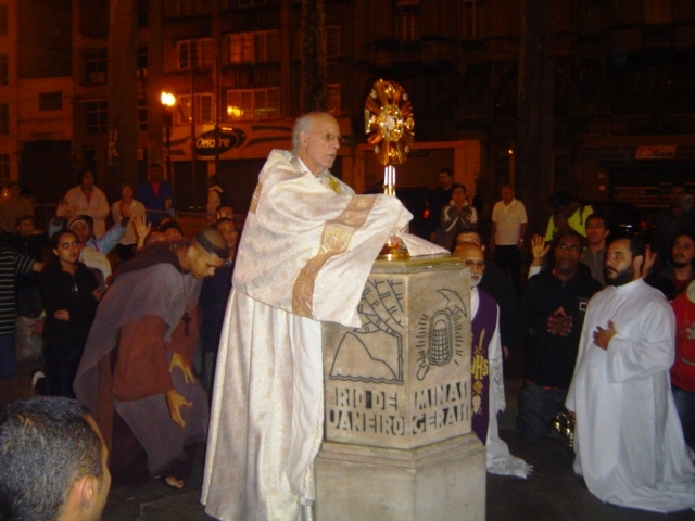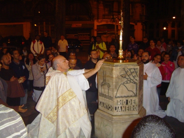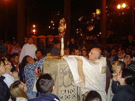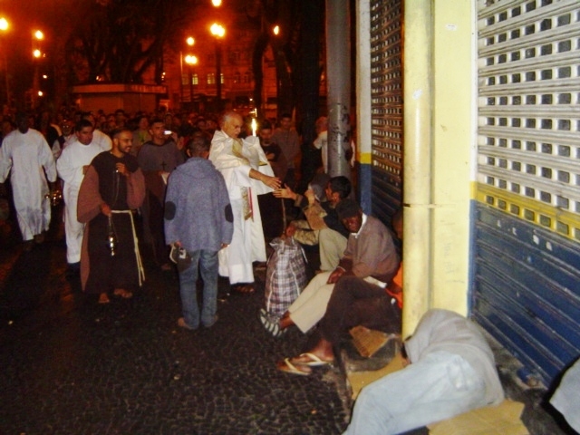 Nesta sexta-feira 04/12/08 o Padre Julio Lancellotti celebrou missa na Vigília da Praça da Sé com a Aliança de Misericórdia, os irmãos da Toca de Assim, muitos missionários e o Povo da Rua. Uma celebração que tocou o coração de todos. Aliás, estávamos no coração de São Paulo. O calor da oração irradiava, afastando o cansaço, o frio e a chuva.