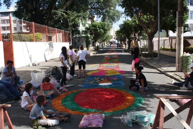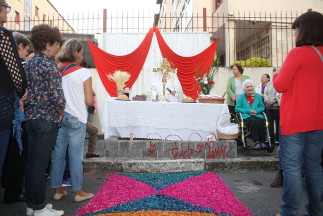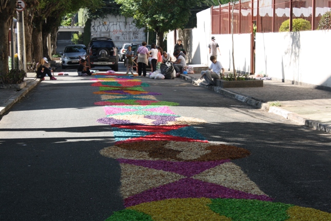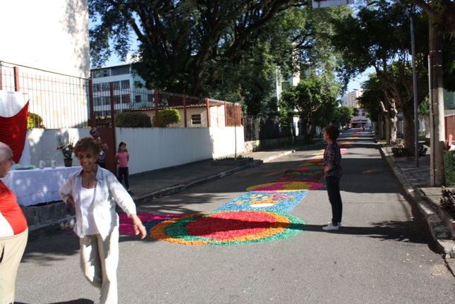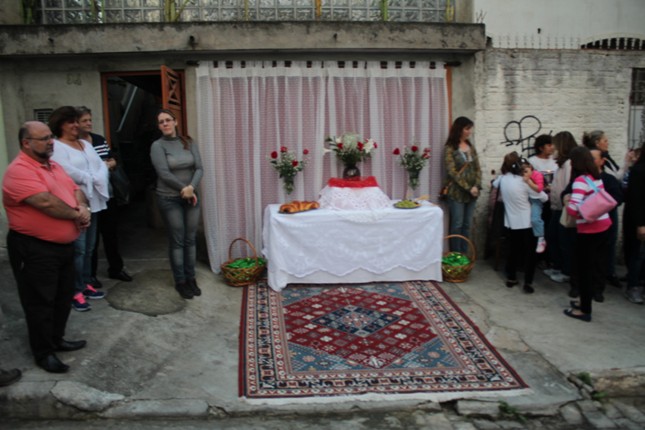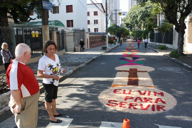 No Residencial IAPI, mais carinho e deferência com um lindo tapete, que foi preparado desde a madrugada. No início a parada sob o tapete que tinha a mensagem marcante. “Eu vim para servir”. Pe Julio de pés descalços, seguiu carregando o Senhor Eucarístico e abençoando as pessoas, como o fêz ao longo do caminho. Chegada mais que festiva, com fogos e um belíssimo altar. Mais orações e bênçãos e a partilha do pão. Momento sempre marcante de fé.