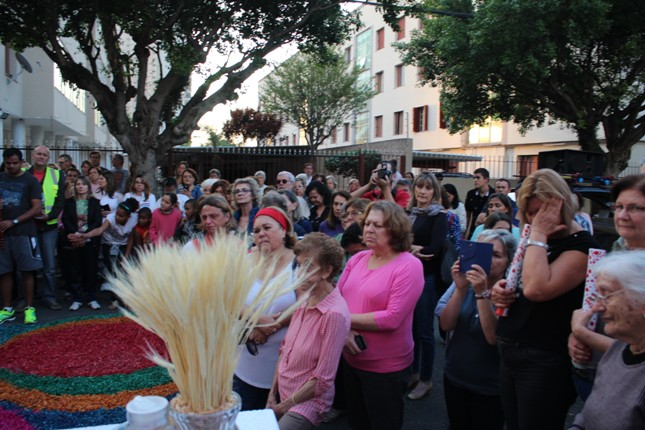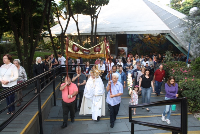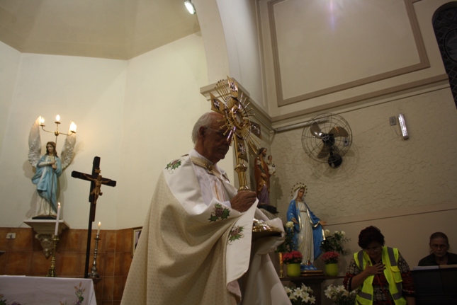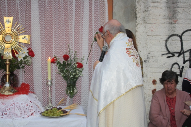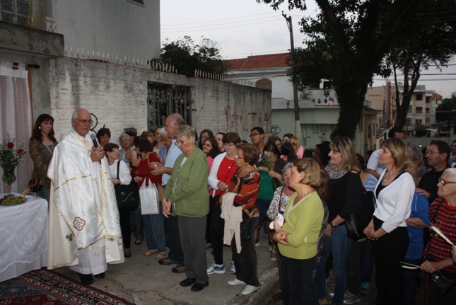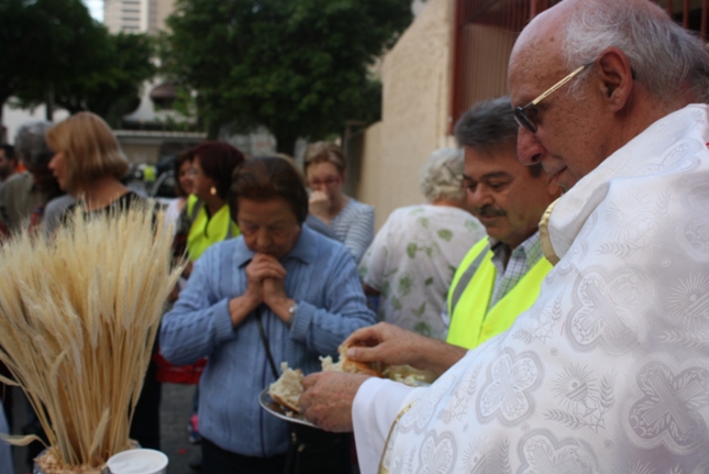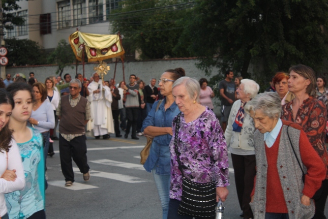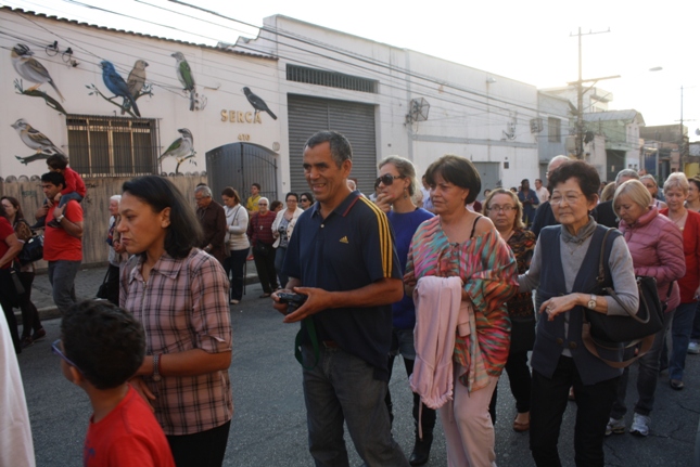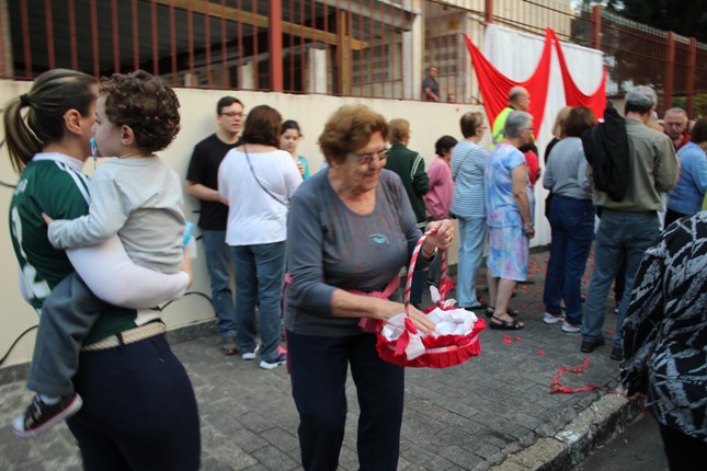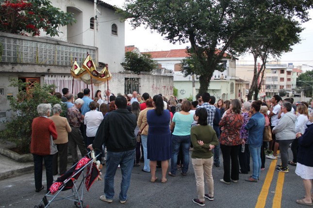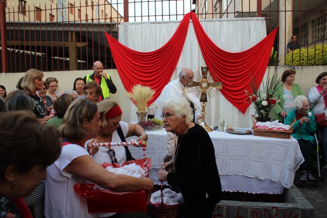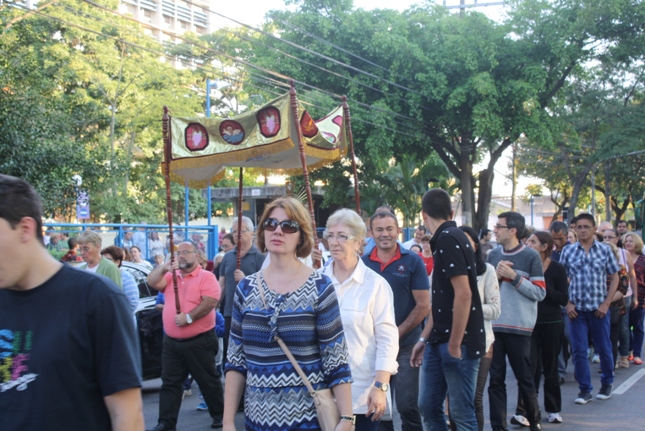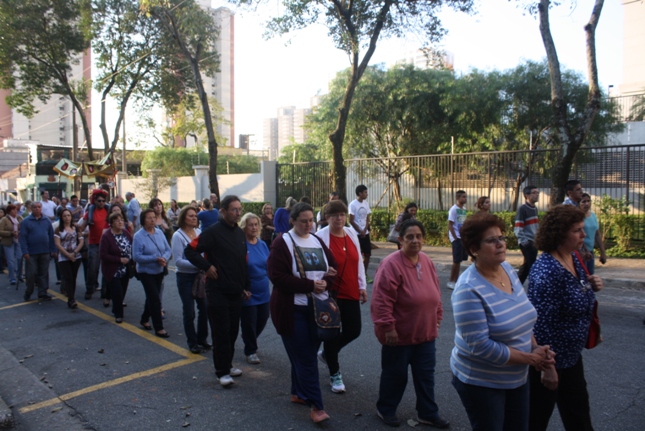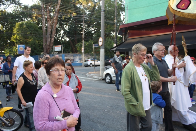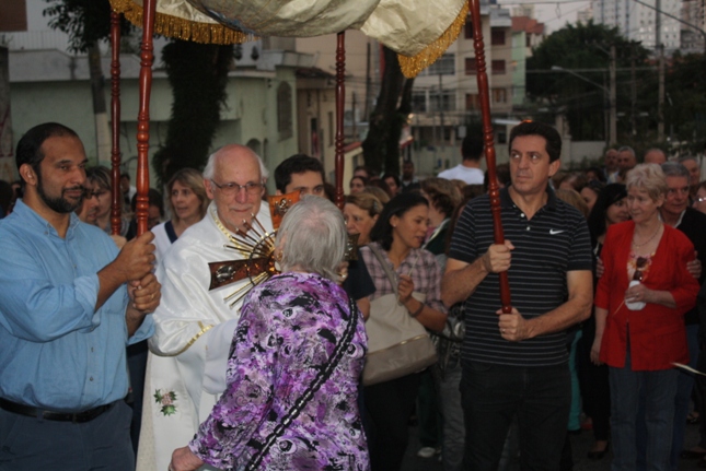 Tereza, que por 30 anos  foi secretária na Paróquia São Miguel foi destacadamente homenageada pelo Pe Julio, que também lhe deu lágrimas e uma rosa. Mais partilha, orações e bênçãos. A procissão seguiu com fé.