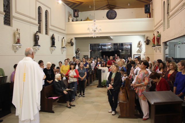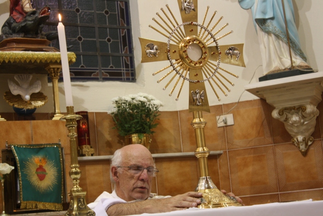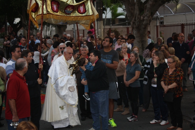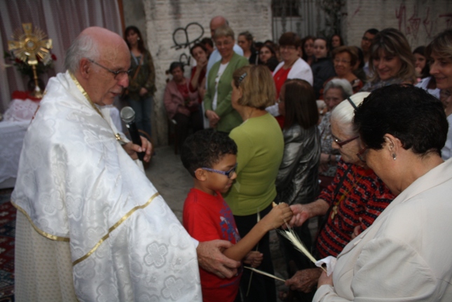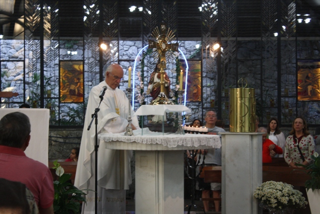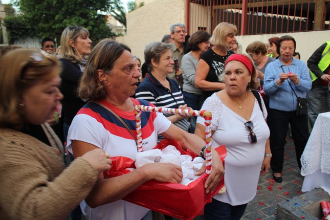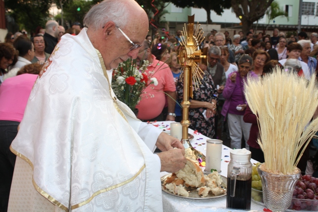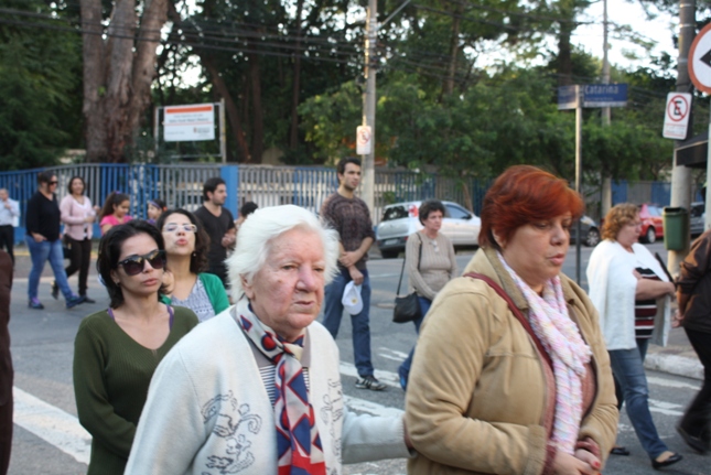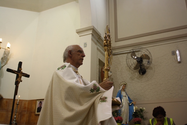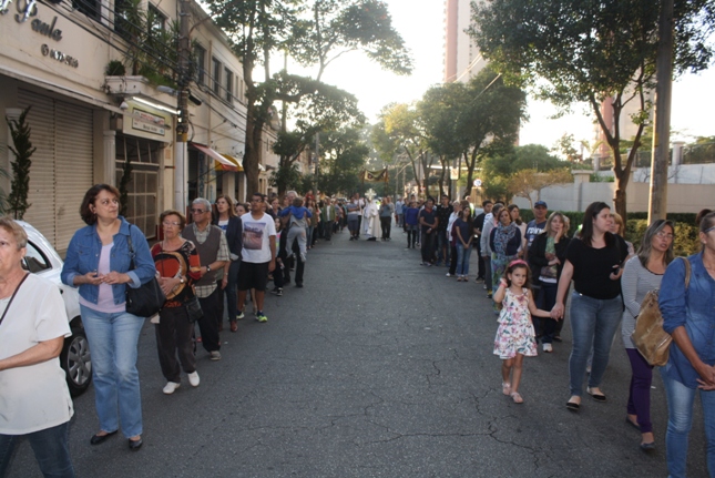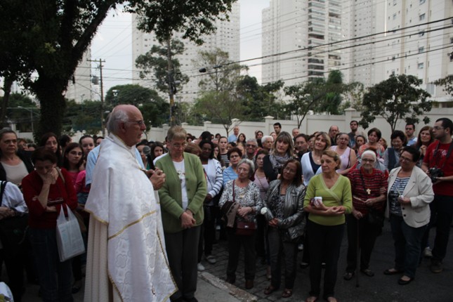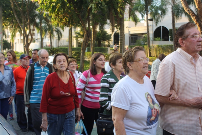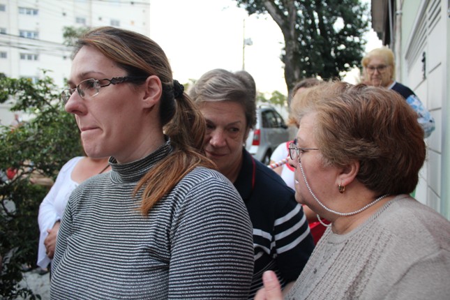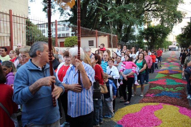 Tereza, que por 30 anos  foi secretária na Paróquia São Miguel foi destacadamente homenageada pelo Pe Julio, que também lhe deu lágrimas e uma rosa. Mais partilha, orações e bênçãos. A procissão seguiu com fé.