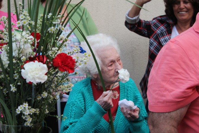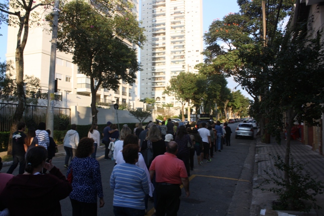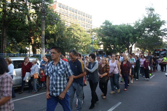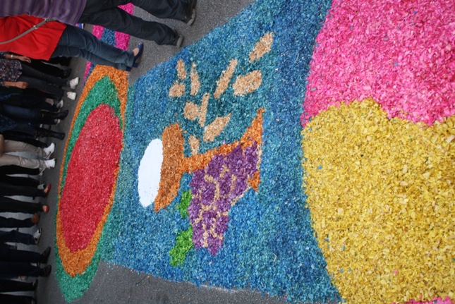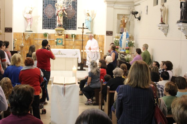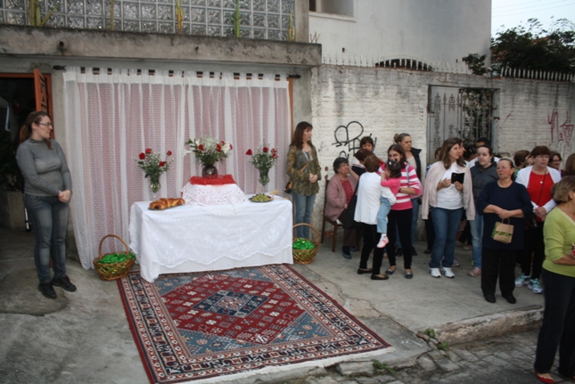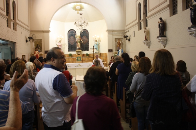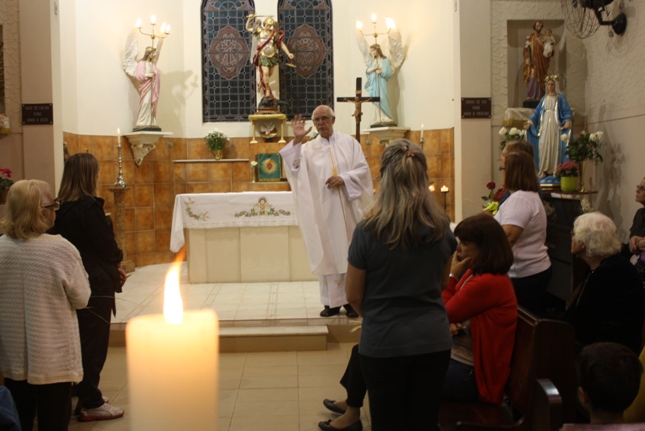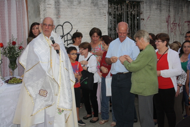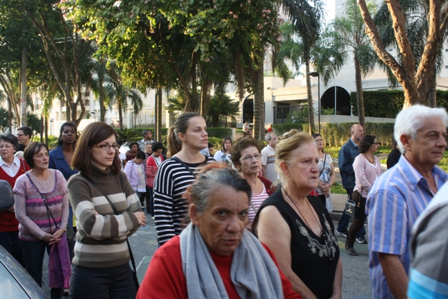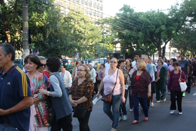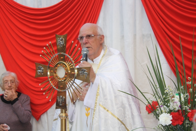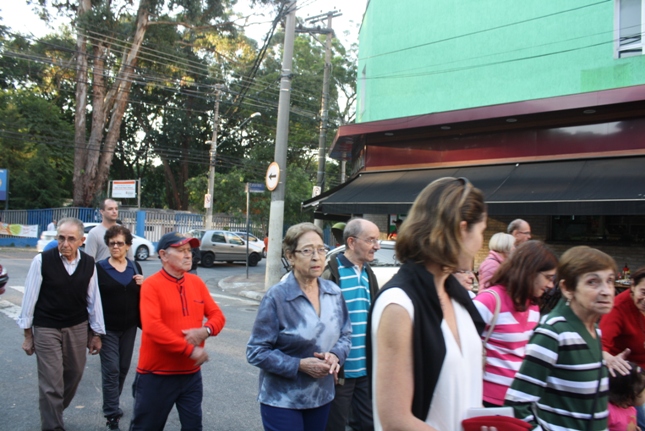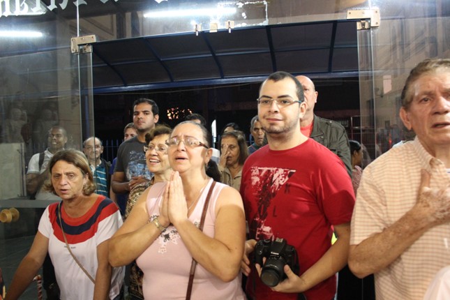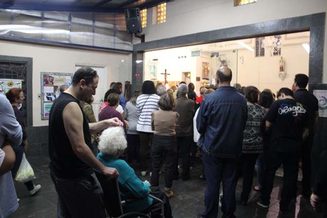 Tereza, que por 30 anos  foi secretária na Paróquia São Miguel foi destacadamente homenageada pelo Pe Julio, que também lhe deu lágrimas e uma rosa. Mais partilha, orações e bênçãos. A procissão seguiu com fé.