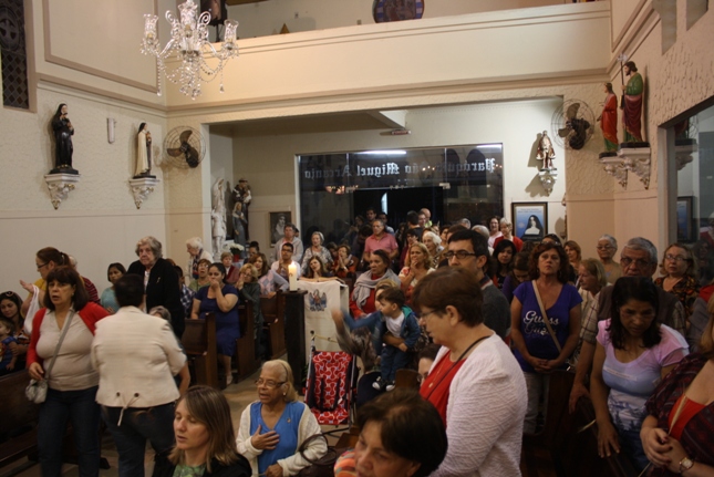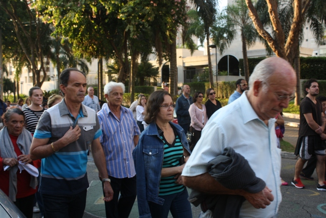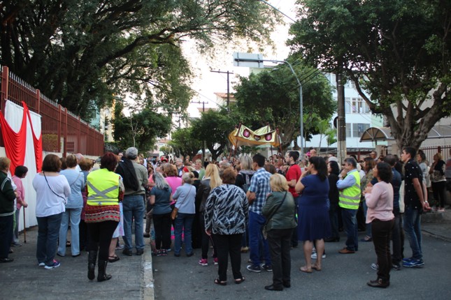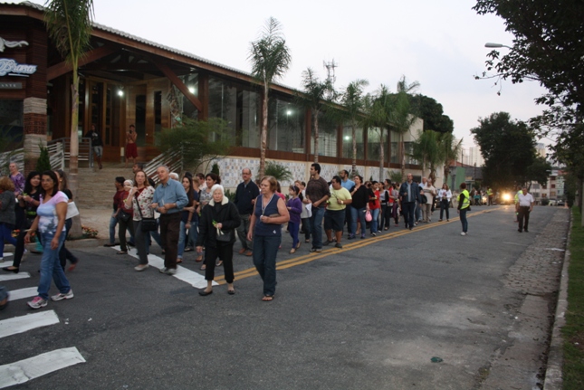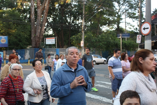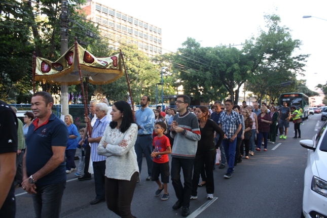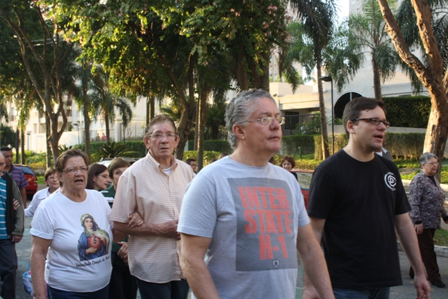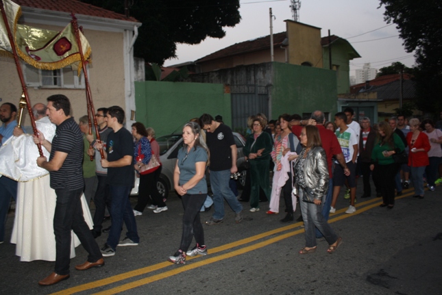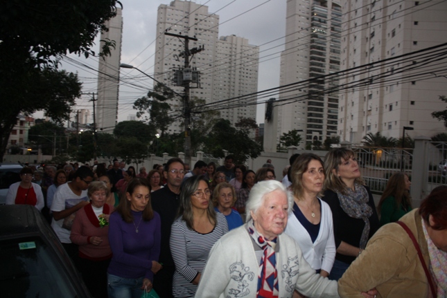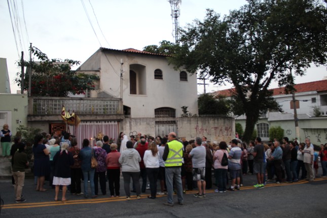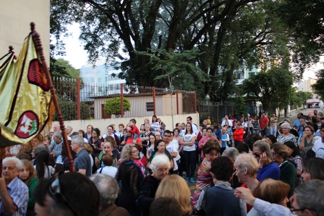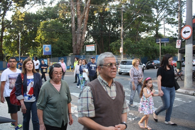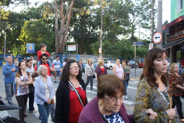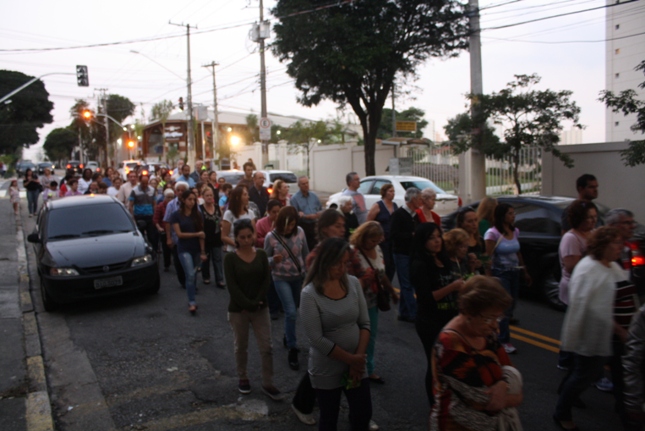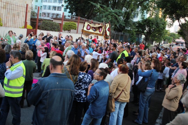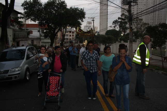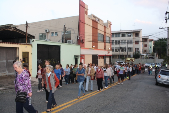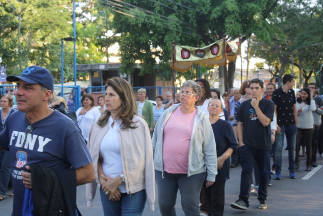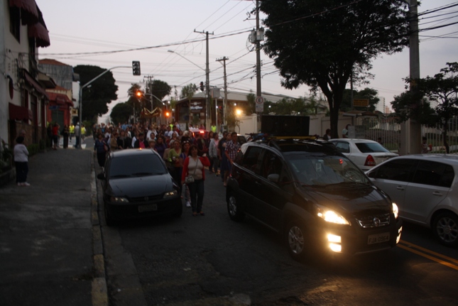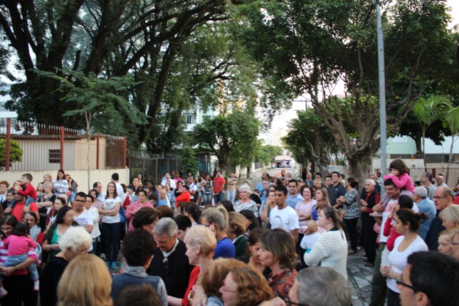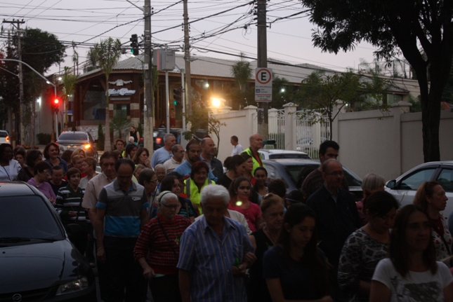 A noite foi chegando, com o povo perseverante caminhando, rezando e cantando em direção à Igreja São Miguel Arcanjo. Rua Sapucaia com Rua Taquari a chegada à Paróquia e o final da procissão. As expressões nos rostos das pessoas mostram a alegria e as emoções com fé da Comunidade.