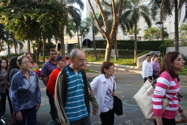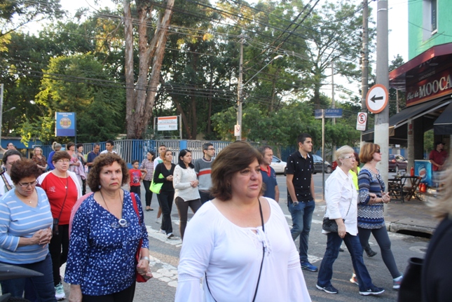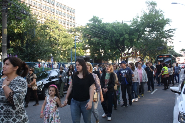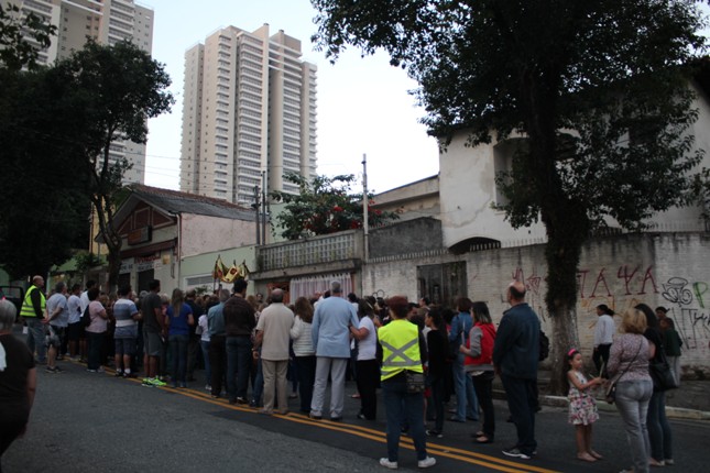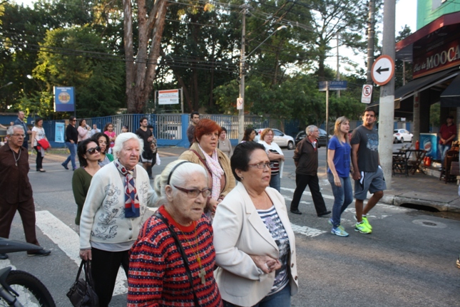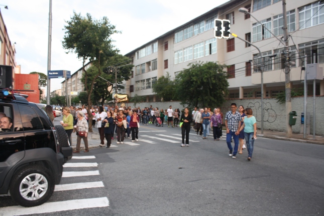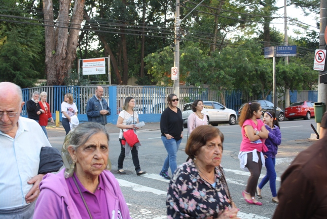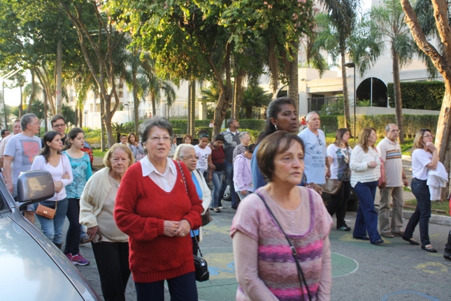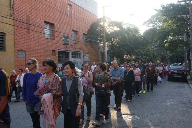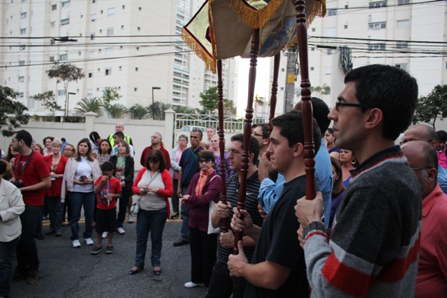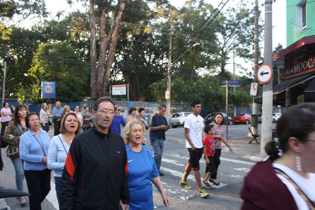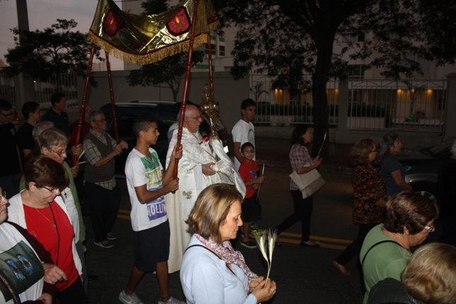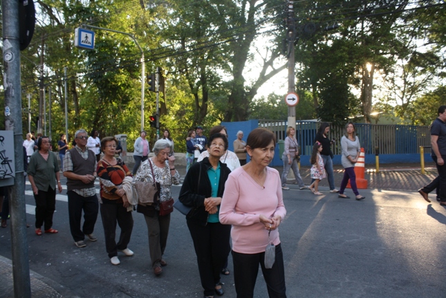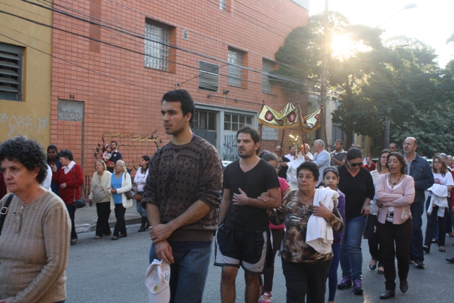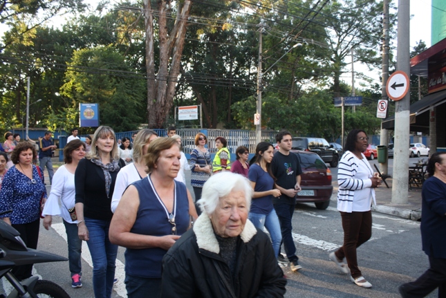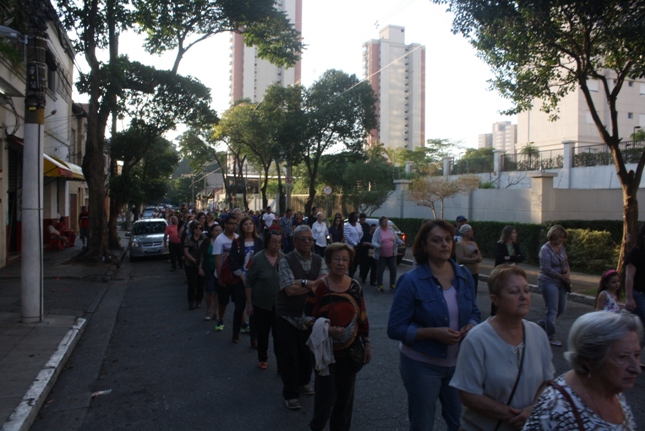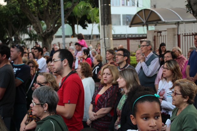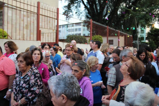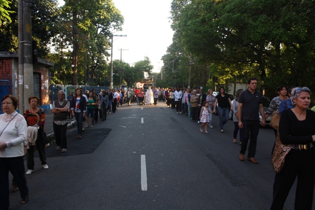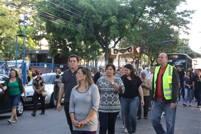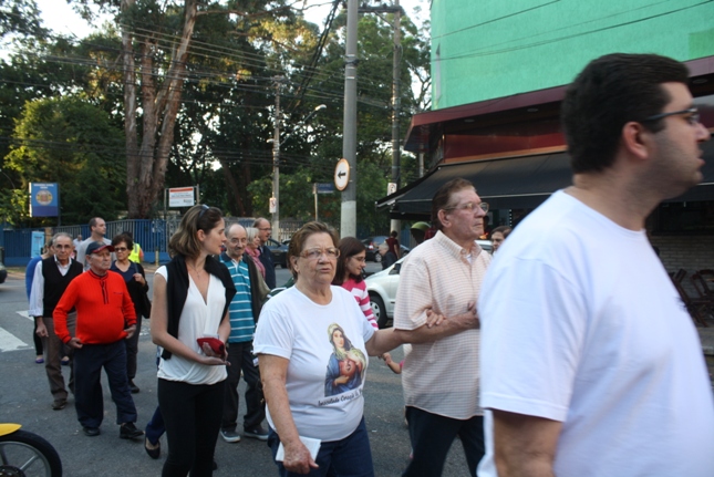 A noite foi chegando, com o povo perseverante caminhando, rezando e cantando em direção à Igreja São Miguel Arcanjo. Rua Sapucaia com Rua Taquari a chegada à Paróquia e o final da procissão. As expressões nos rostos das pessoas mostram a alegria e as emoções com fé da Comunidade.