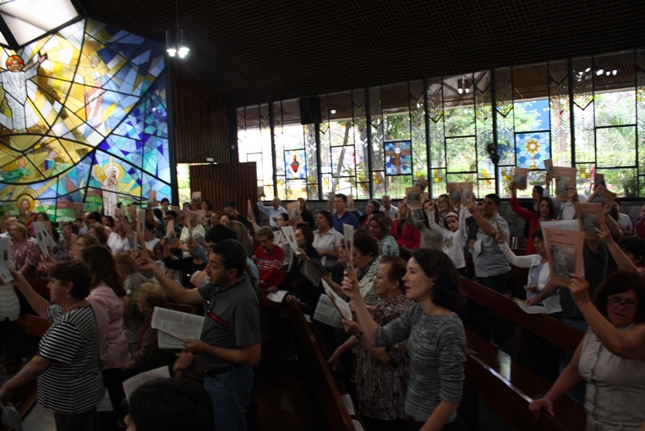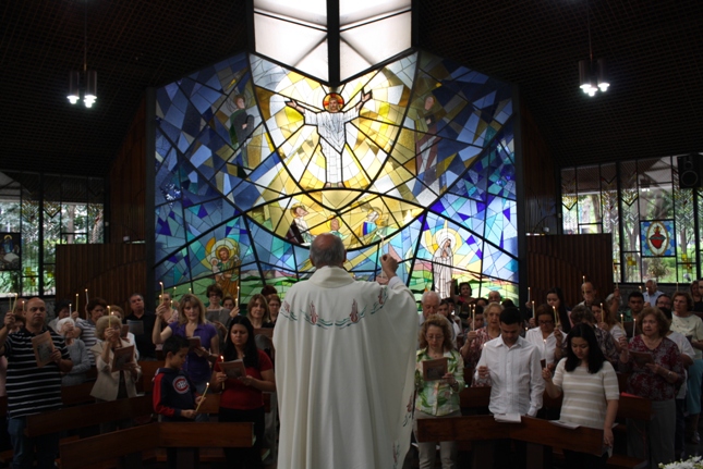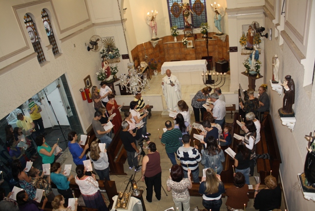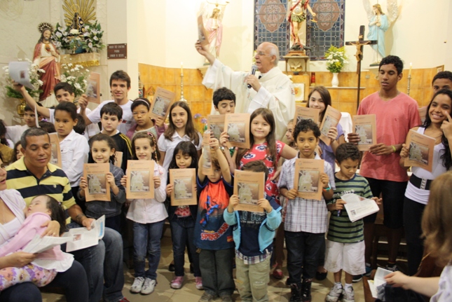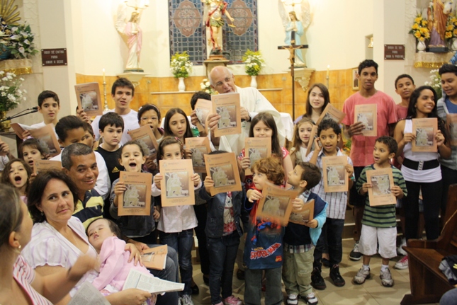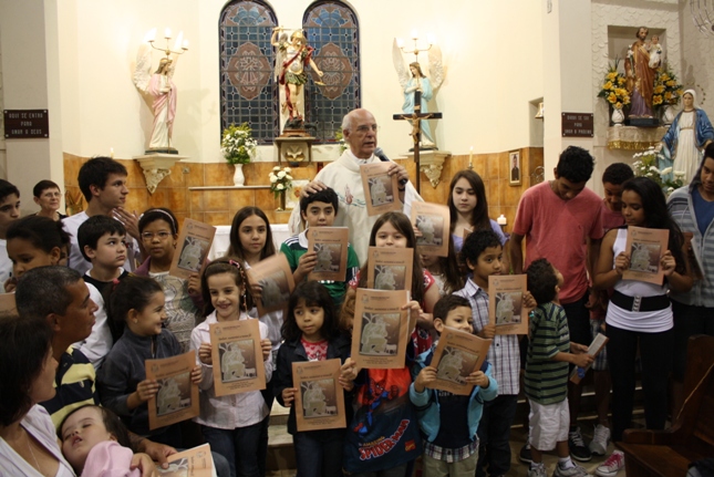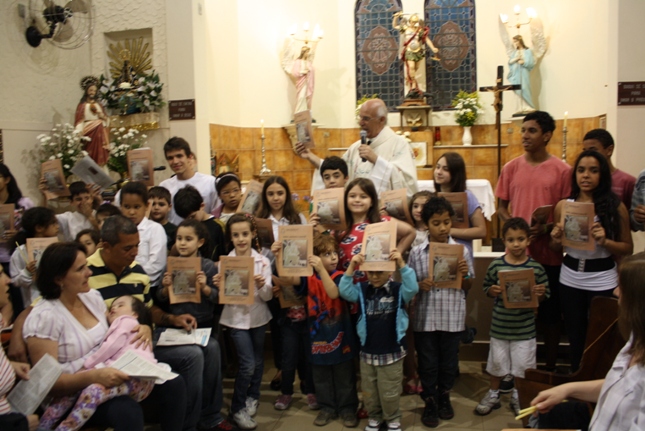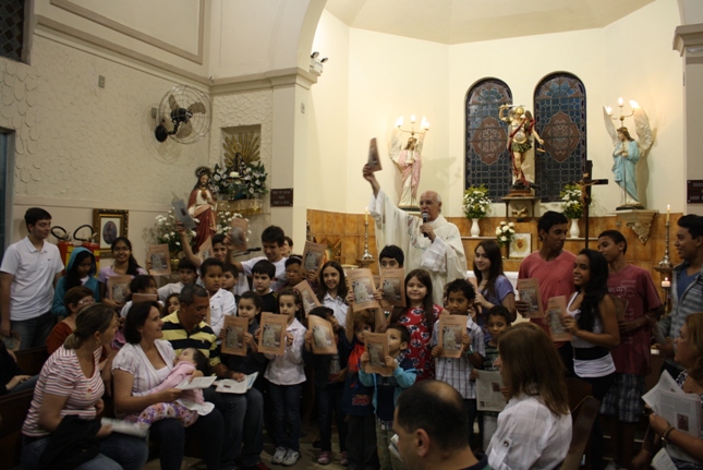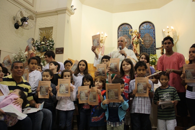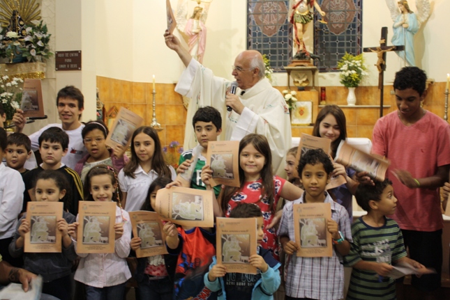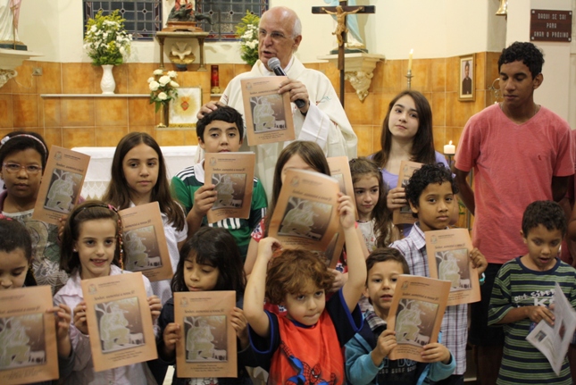 No final da missa das 18h, o Pe. Julio convidou as crianças, adolescentes e jovens a se reunirem na frente do altar com a Carta Pastoral de Dom Odilo e desafiou a comunidade a transmitir a fé. Ao fundo, o canto “Incendeia minha alma”, do Pe. Fabio de Melo: