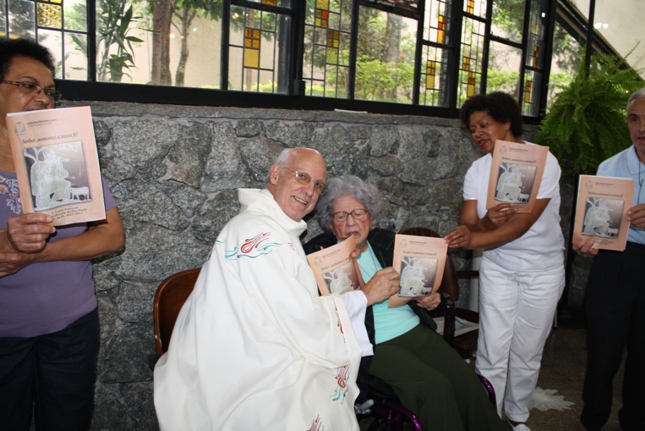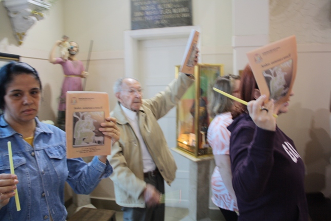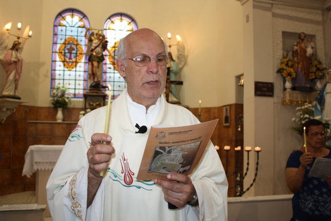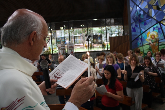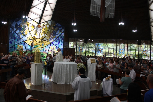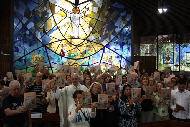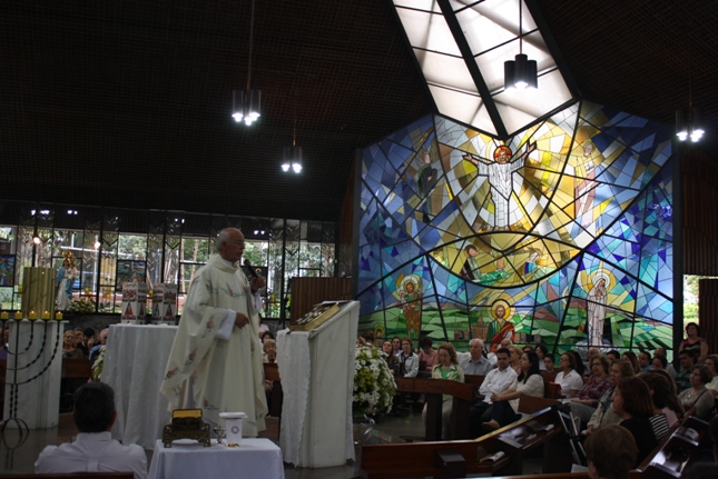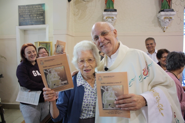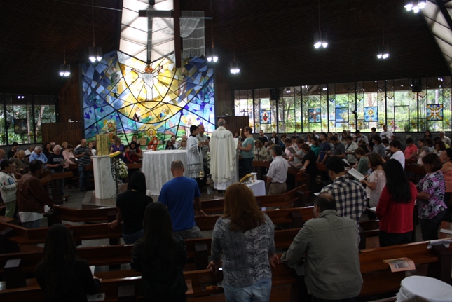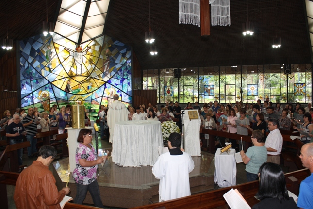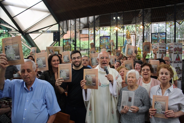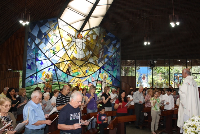 No final da missa das 18h, o Pe. Julio convidou as crianças, adolescentes e jovens a se reunirem na frente do altar com a Carta Pastoral de Dom Odilo e desafiou a comunidade a transmitir a fé. Ao fundo, o canto “Incendeia minha alma”, do Pe. Fabio de Melo: