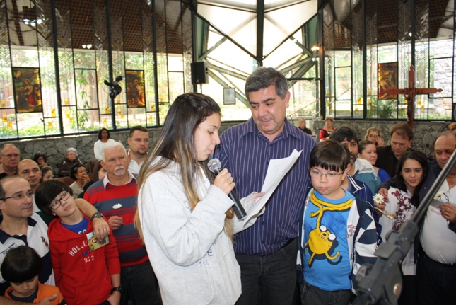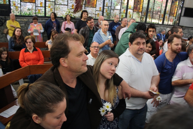 A Bruna representou os filhos, lendo a homenagem aos pais, que também receberam a especial bênção e uma flor.