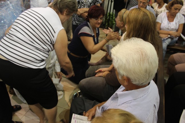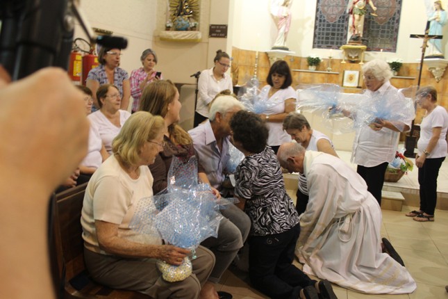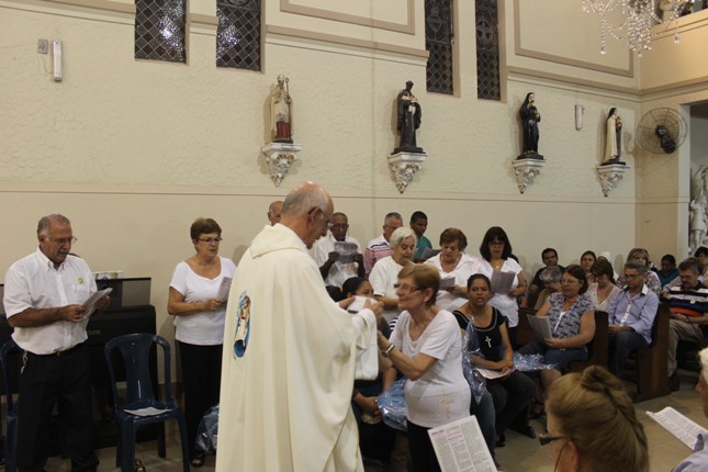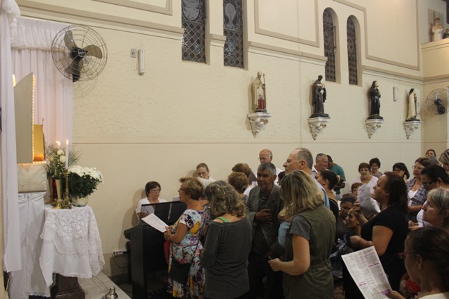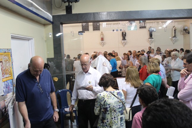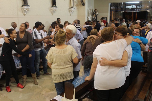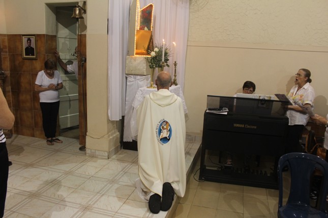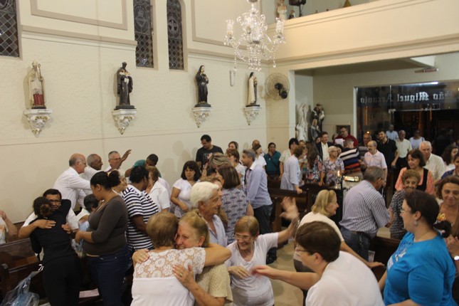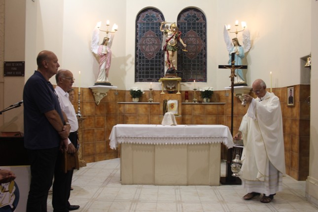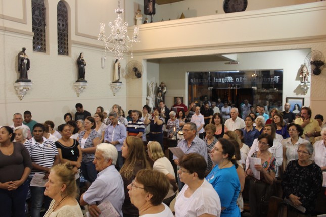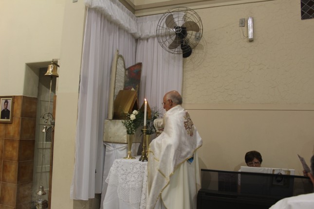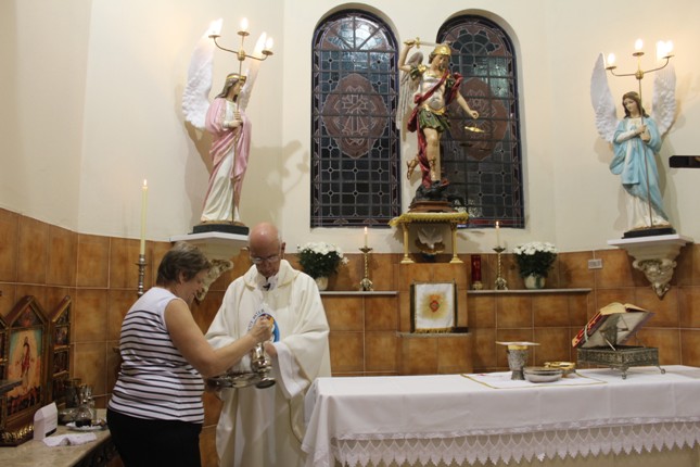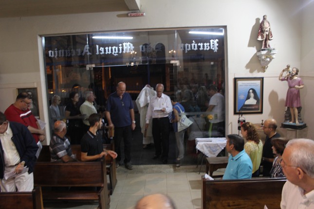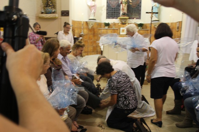 Quinta-feira Santa, 24/03/16 a Paróquia São Miguel estava lotada, como sempre, para a celebração eucarística, que nos lembrou a instituição da Eucaristia. O Pe Julio e a comunidade lavaram os pés das irmãs da Missão Belém e de pessoas da comunidade que passaram pelo problema da Dengue. No final da celebração o Santíssimo é retirado e levado em procissão para o altar da reposição. Na sequência a comunidade ficou em vigília.