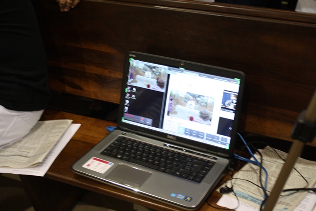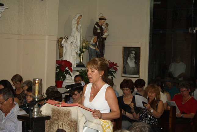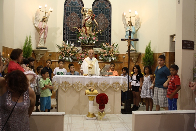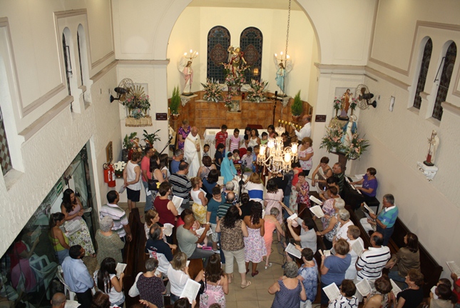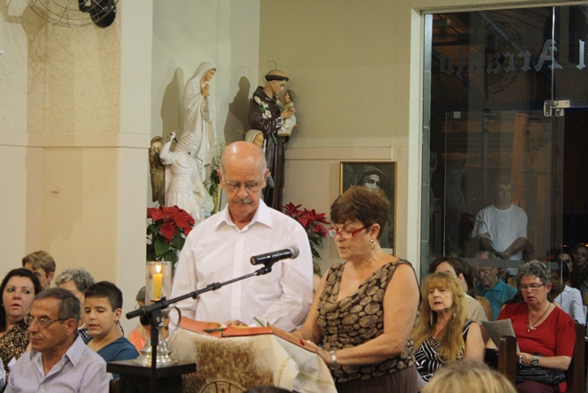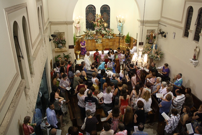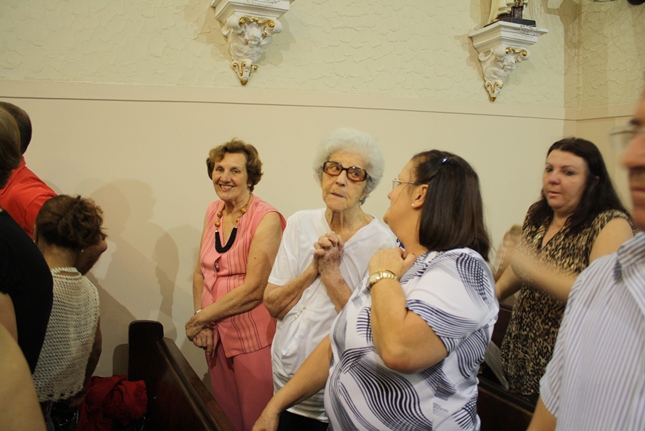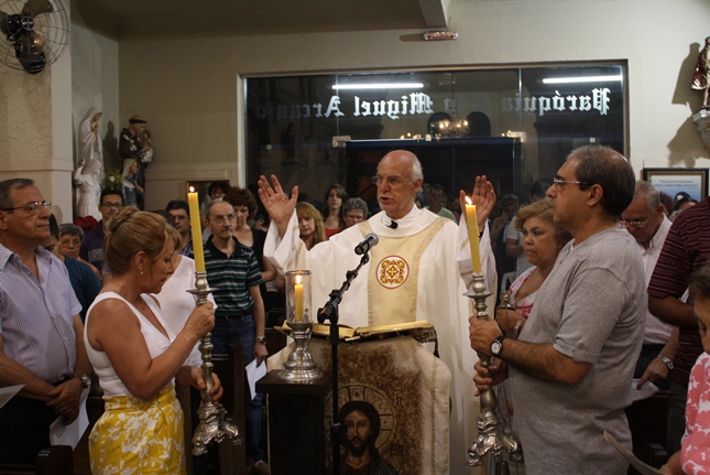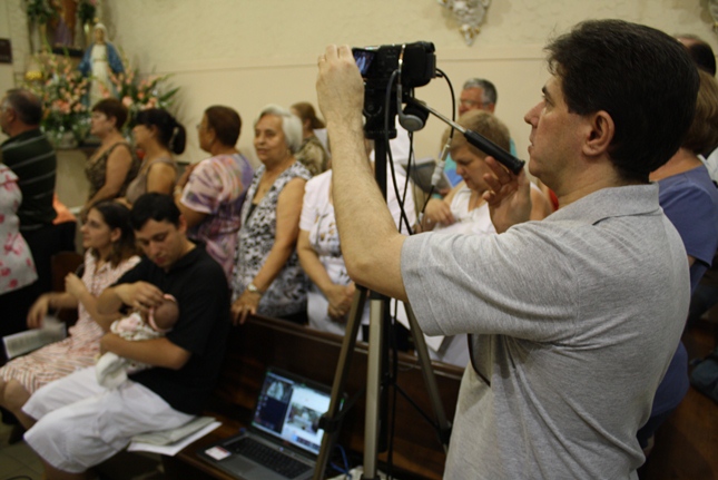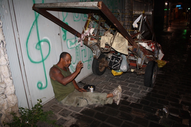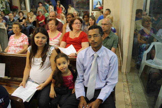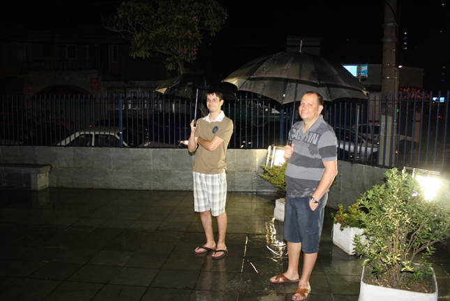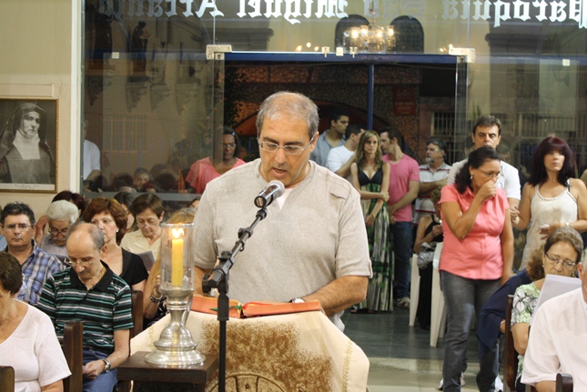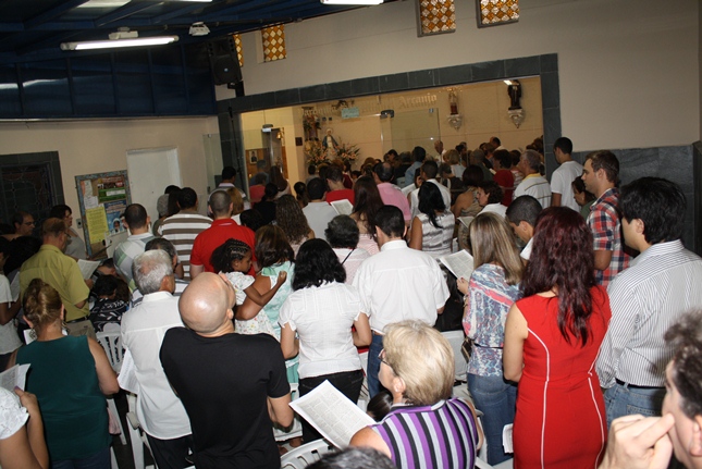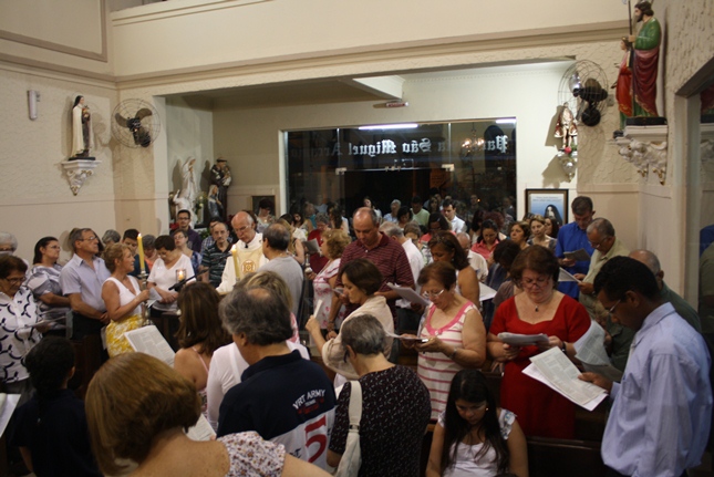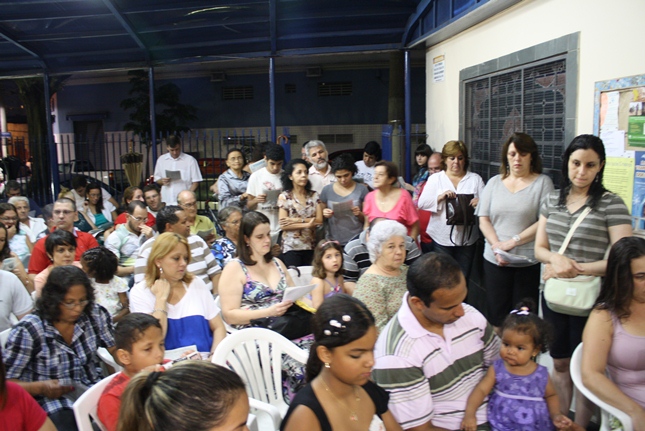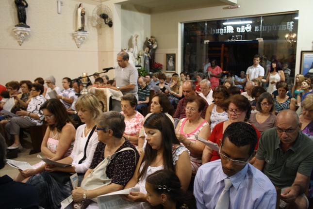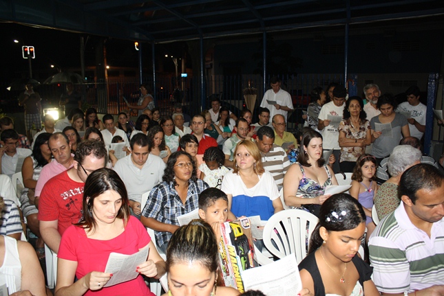 Noite de profunda fé. A Igreja São Miguel Arcanjo ficou lotada, inclusive nas suas dependências externas, mesmo com a chuva. Do outro lado da rua, um sofredor de rua também participava da celebração, rezando com fervor.