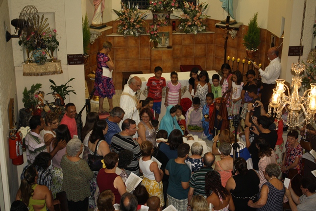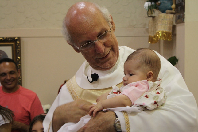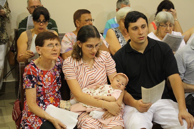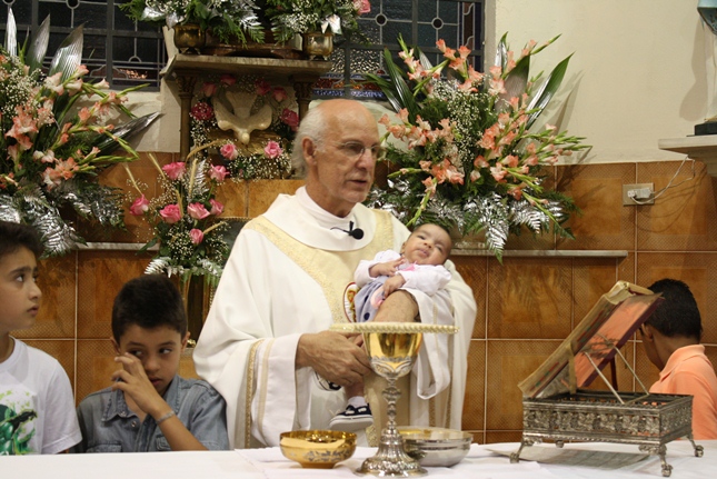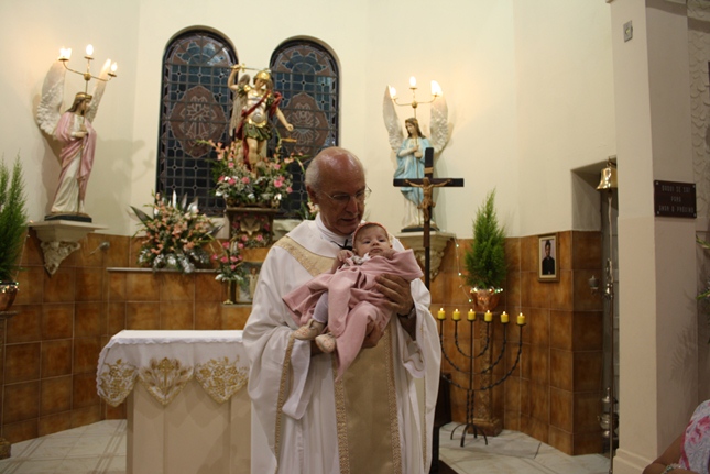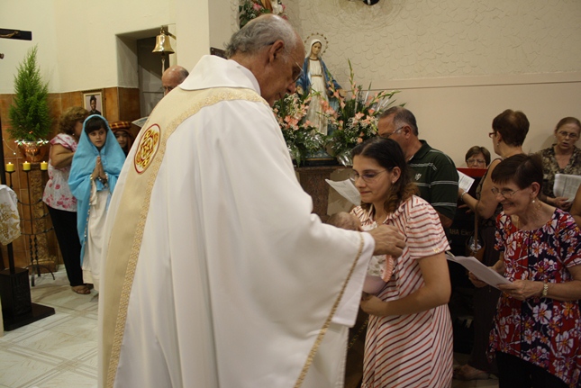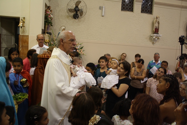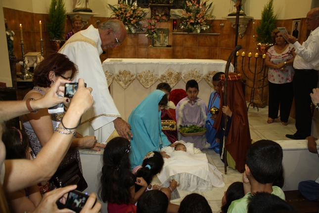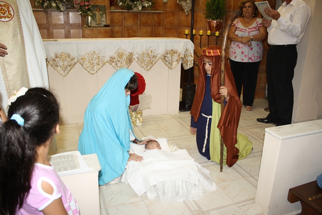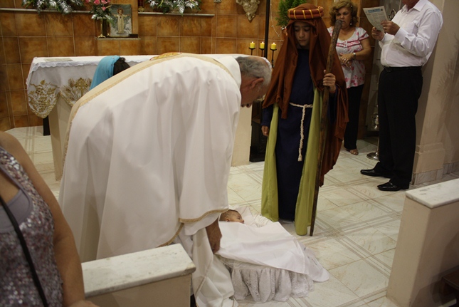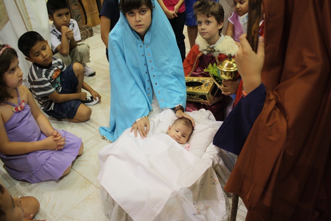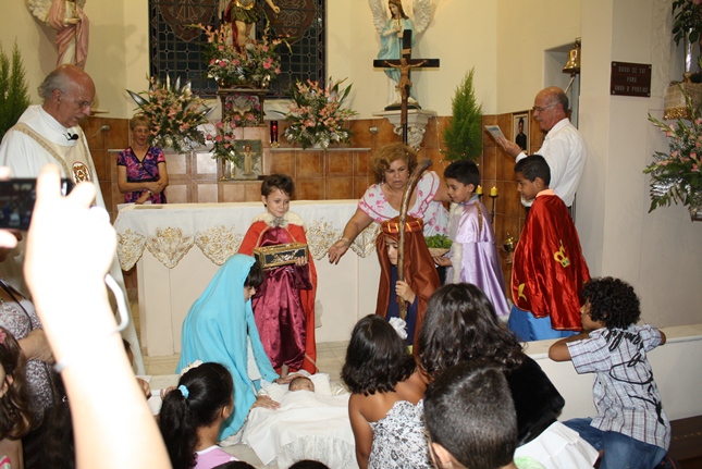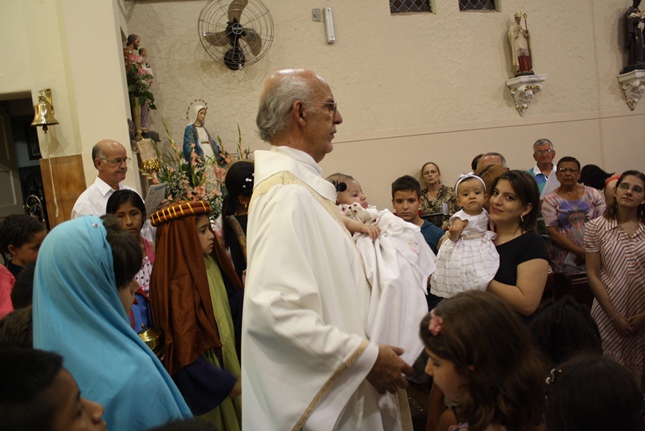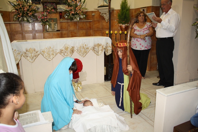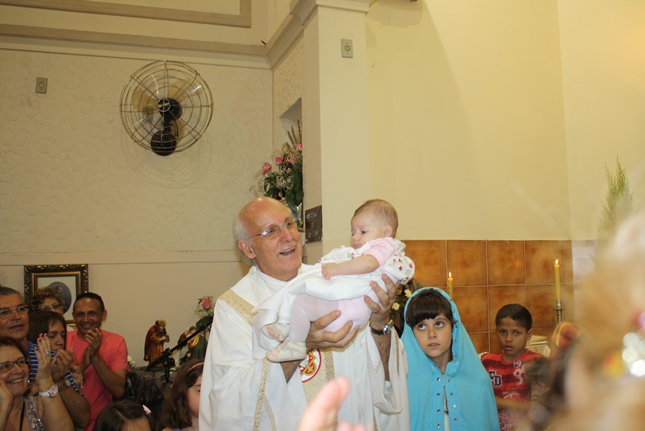 No final da missa, a encenação do nascimento de Jesus. Uma criança sempre é escolhida para compor a cena no nascimento, com Maria, José, pastores e os reis magos. A Camila, filha da Rosangela e neta da Roseli, representou Jesus no seu nascimento, com a mesma simplicidade.