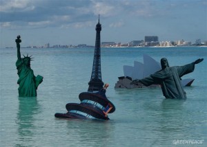 Ontem, o Greenpeace afundou ícones das civilizações no mar de Cancun, no México, onde acontece a 16ª Conferência do Clima (COP16), para lembrar os negociadores dos países presentes no paraíso tropical que o tempo para evitar mudanças climáticas perigosas está chegando ao fim.