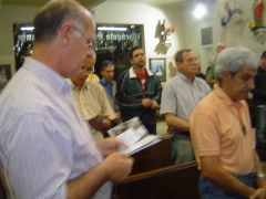 Terço dos Homens – Nossa Senhora do Líbano – Orações em aramaico. Os homens, como aqueles da cidade de Itabi-SE, continuam rezando o Terço. Nesta sexta-feira (08/05/09), tivemos também a companhia do Padre Emile Eddé. Ele nos contou sobre Nossa Senhora do Líbano, a caminhada dos maronitas ao longo da história e esclareceu muito, inclusive sobre as orações em aramaico. Presenteou o Luiz Carlos com um livro. Ao retornar, avistei o Bispo Dom Edgar Madi, que felicitou esse grupo que reza o Terço.