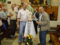 José Fabretti prepara esse momento com muito carinho e dedicação. Coloca a imagem de Nossa Senhora próxima do altar. Há flores e velas acessas como convém para expressar o carinho à Mãe de Jesus.