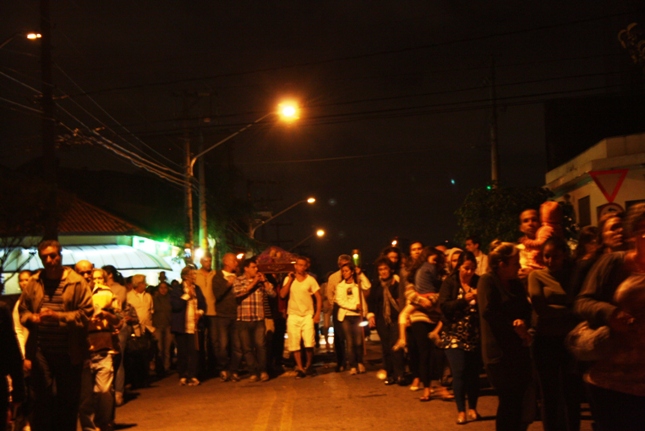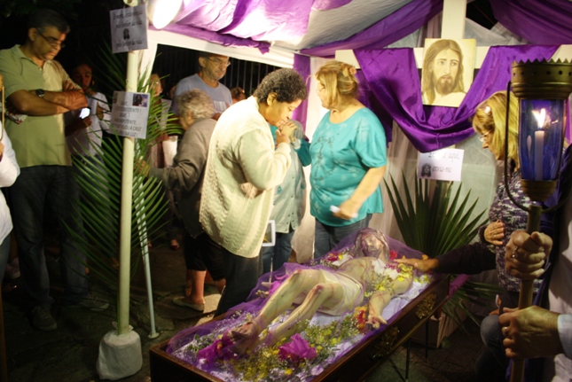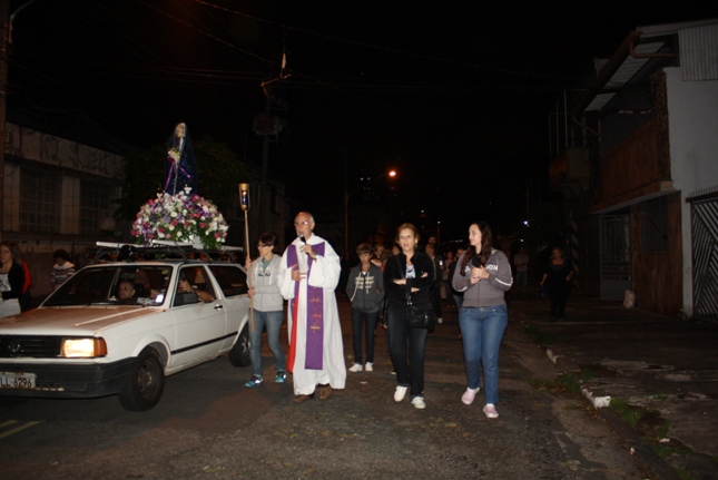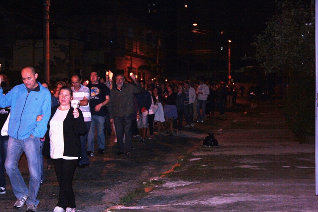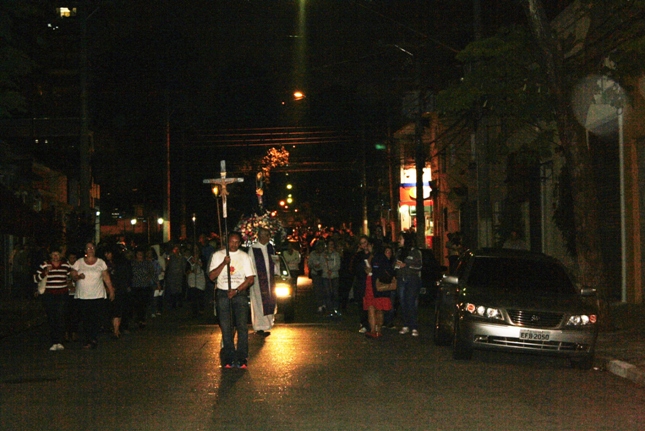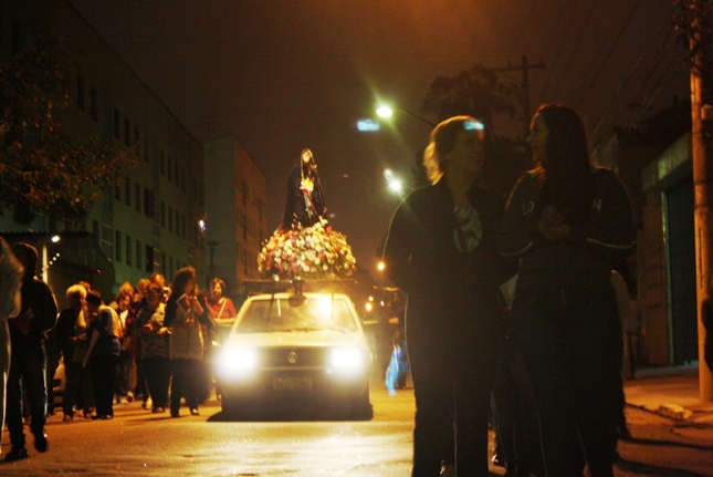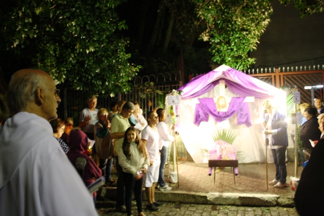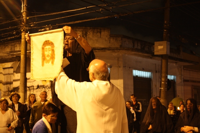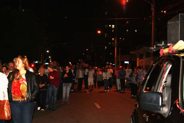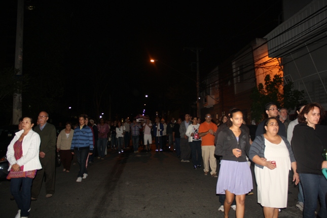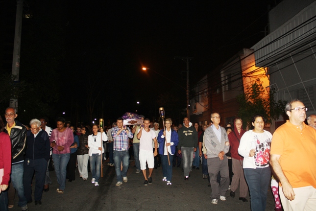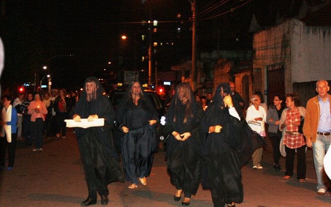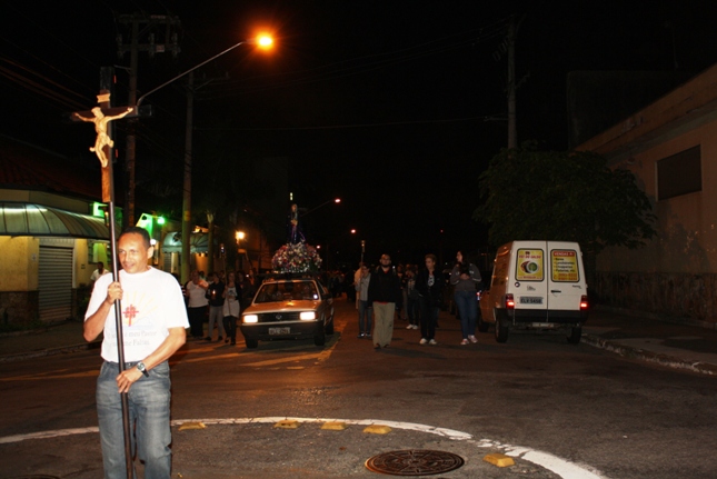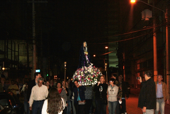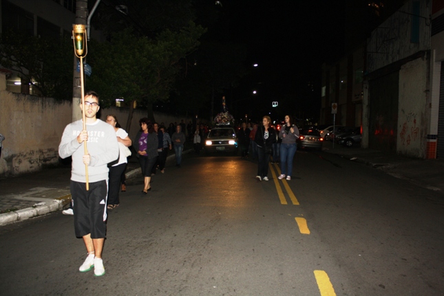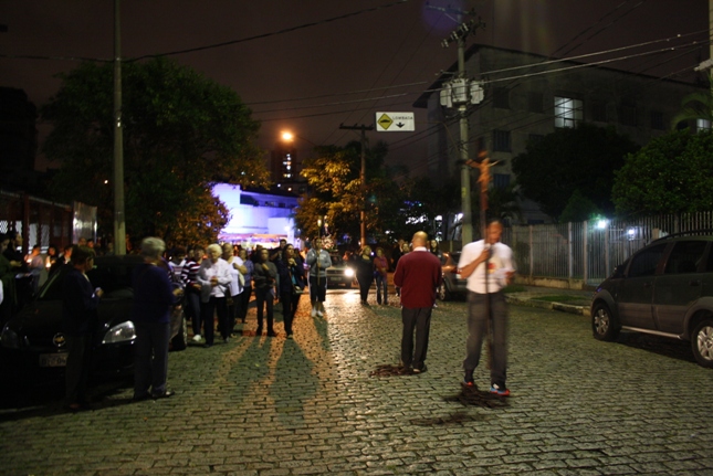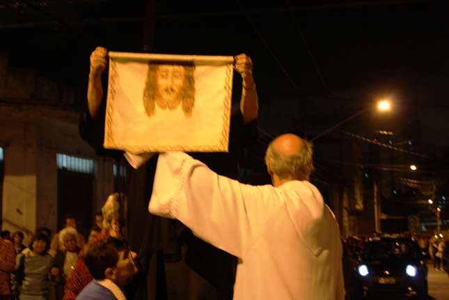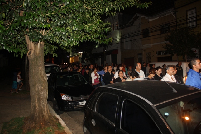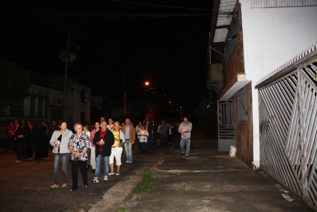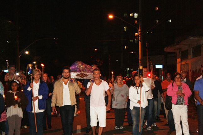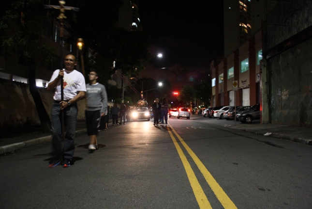 À noite a procissão pelas ruas do bairro. Mais e mais pessoas chegavam para acompanhar, rezando e cantando. Seguia à frente a Cruz de Nosso Senhor, a imagem de Nossa Senhora das Dores, as mulheres e o canto da Verônica e, ao final, o esquife do Senhor Martirizado. Na caminhada, as famílias saiam aos portões para sua reverência de fé. No conjunto do IAPI, um altar preparando a chegada do Senhor. Uma multidão se reuniu ali. Uma folha caiu sobre o esquife, e o Pe Julio nos disse que era um sinal em face da questão envolvendo a Praça vizinha que está em litígio com empresários, que certamente terá resultado favorável para a população. No retorno à Paróquia São Miguel, já próximos, as mulheres levaram o andor de Nossa Senhora das Dores.
