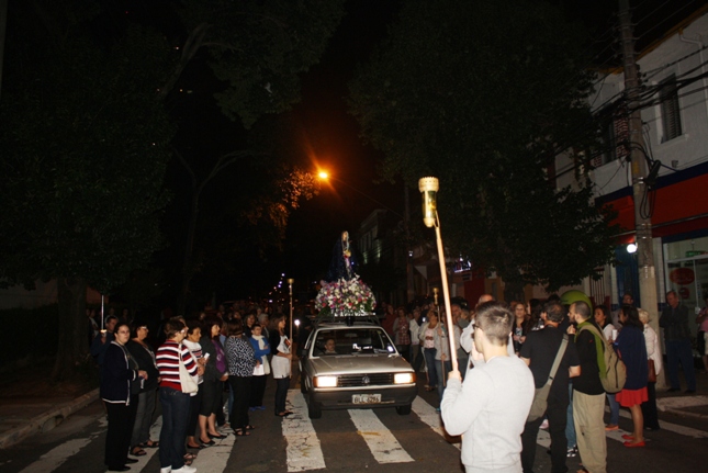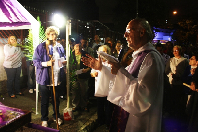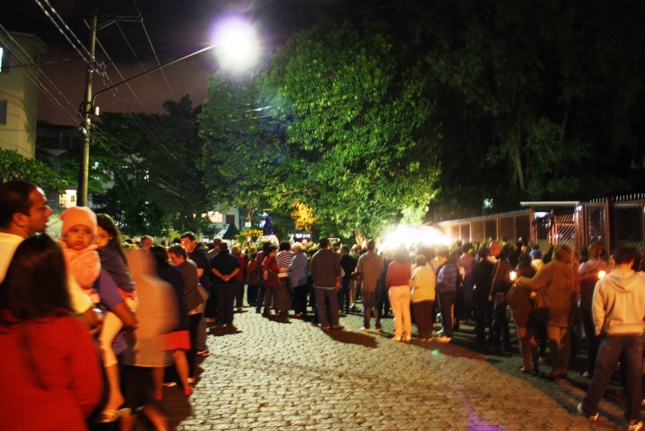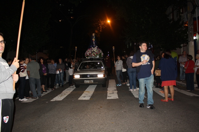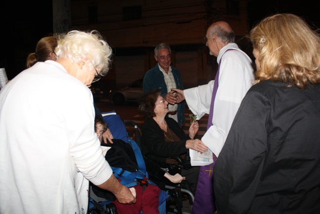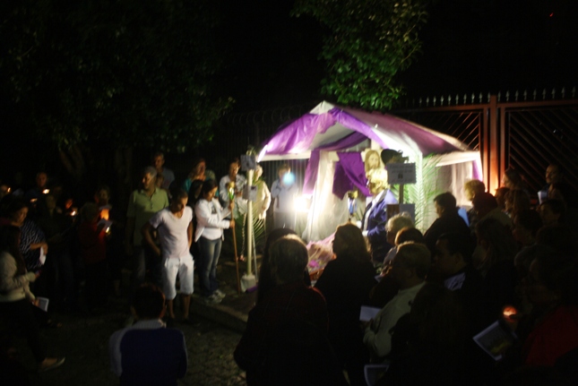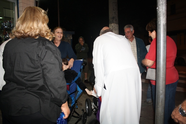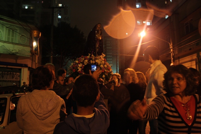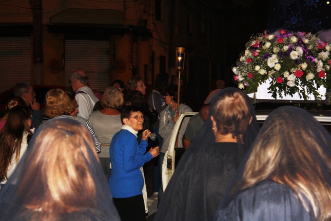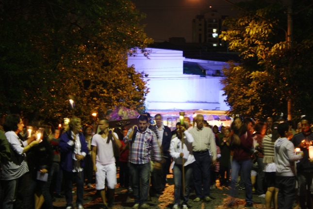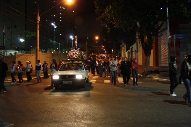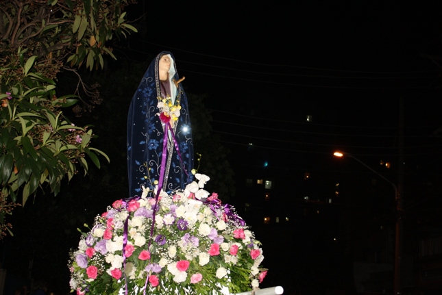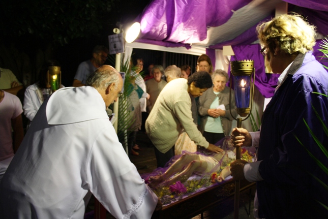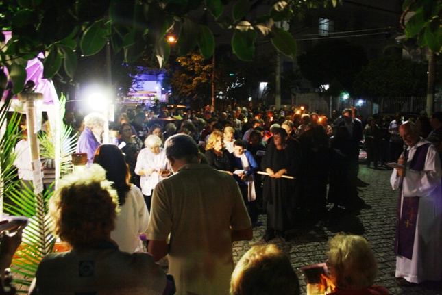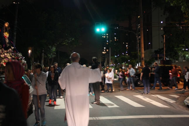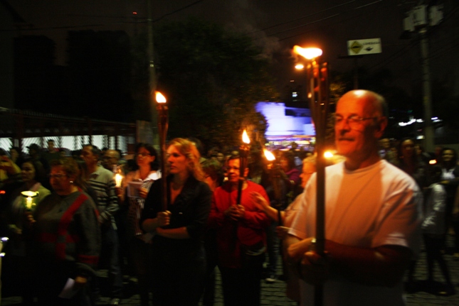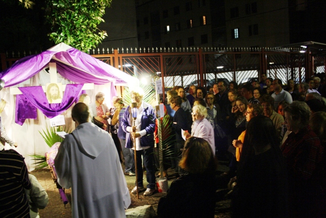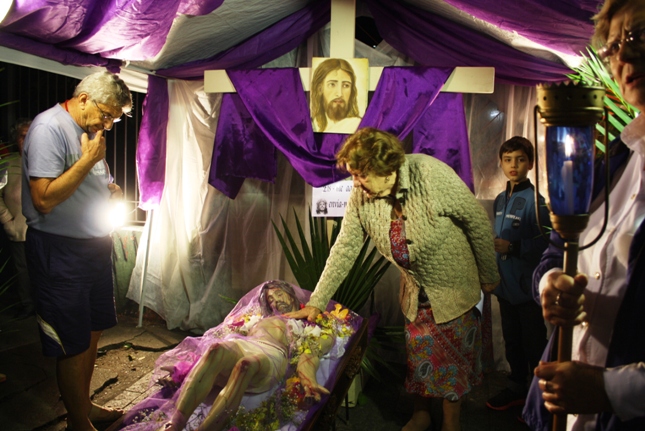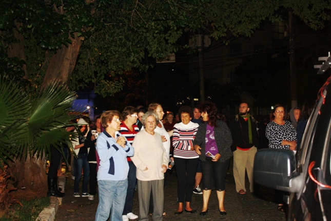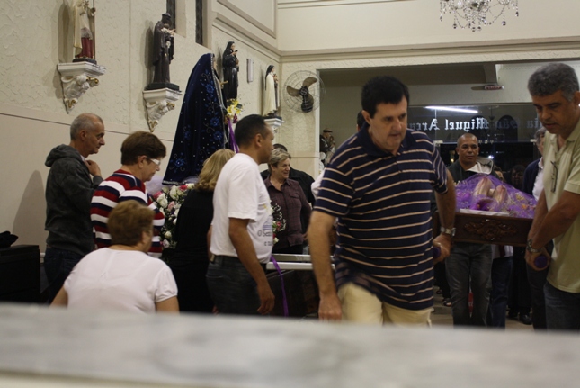 À noite a procissão pelas ruas do bairro. Mais e mais pessoas chegavam para acompanhar, rezando e cantando. Seguia à frente a Cruz de Nosso Senhor, a imagem de Nossa Senhora das Dores, as mulheres e o canto da Verônica e, ao final, o esquife do Senhor Martirizado. Na caminhada, as famílias saiam aos portões para sua reverência de fé. No conjunto do IAPI, um altar preparando a chegada do Senhor. Uma multidão se reuniu ali. Uma folha caiu sobre o esquife, e o Pe Julio nos disse que era um sinal em face da questão envolvendo a Praça vizinha que está em litígio com empresários, que certamente terá resultado favorável para a população. No retorno à Paróquia São Miguel, já próximos, as mulheres levaram o andor de Nossa Senhora das Dores.