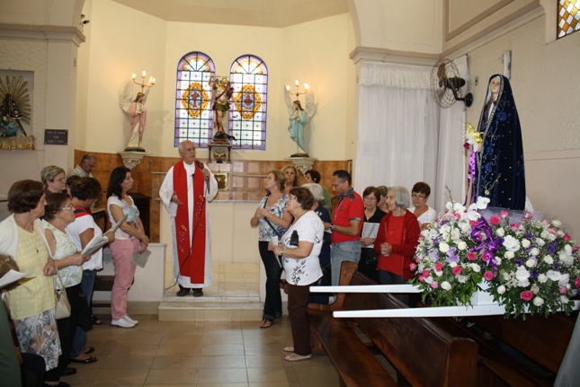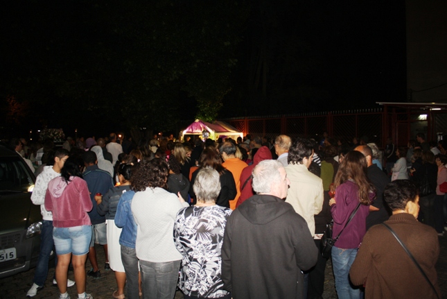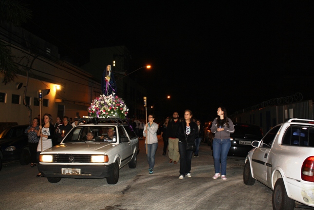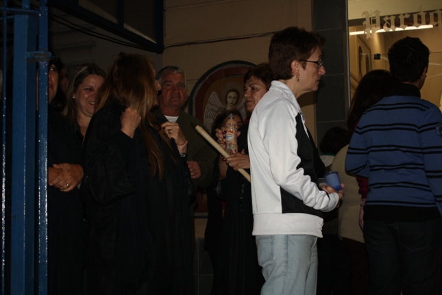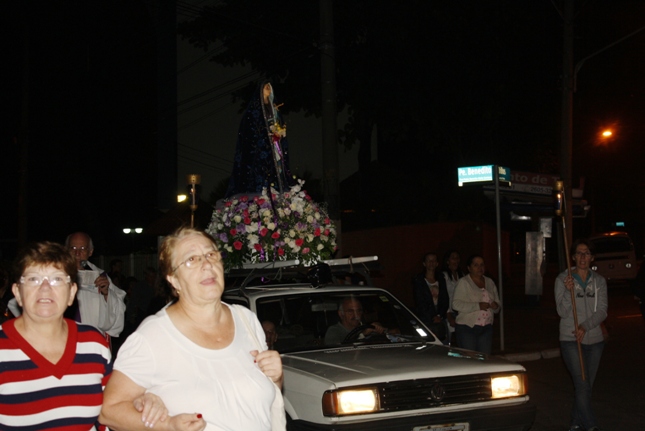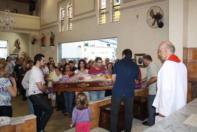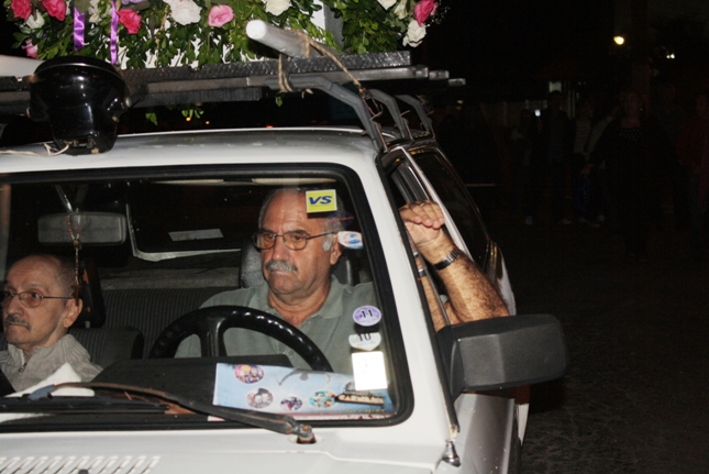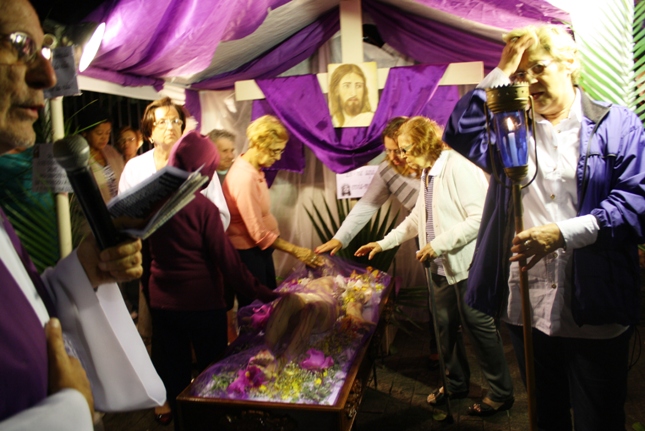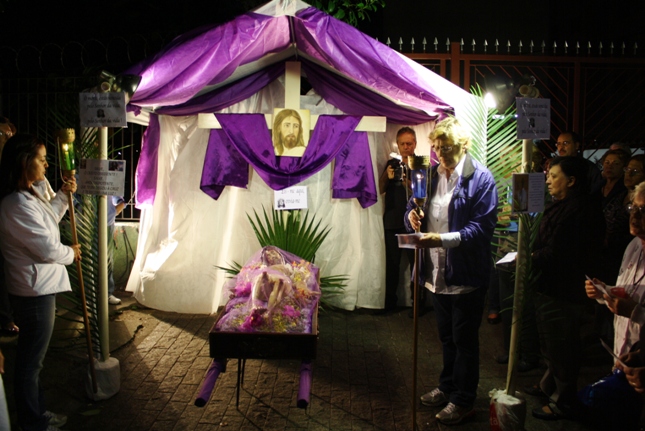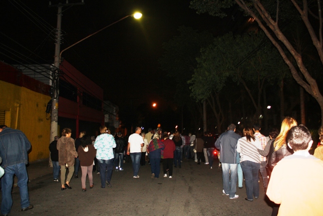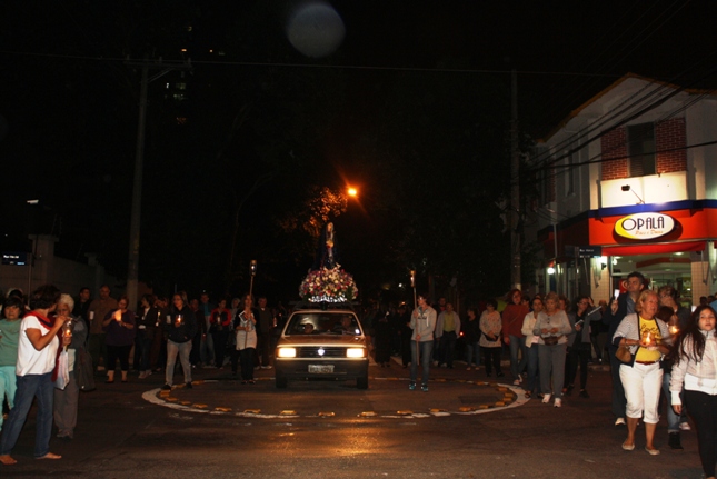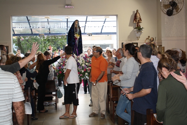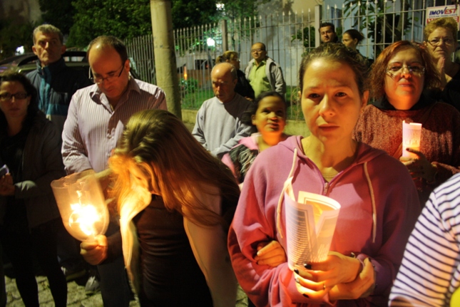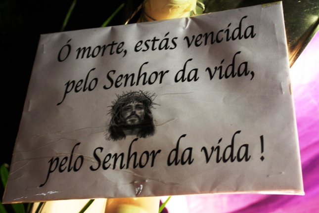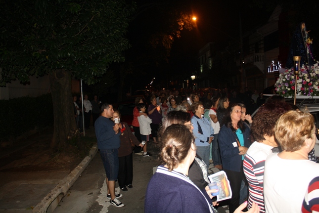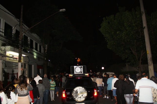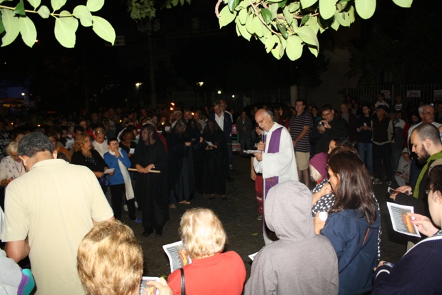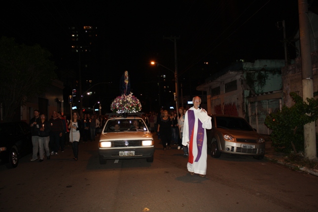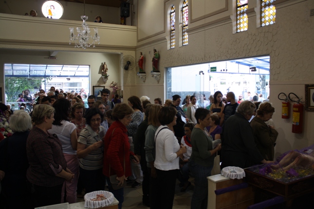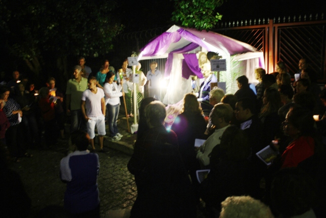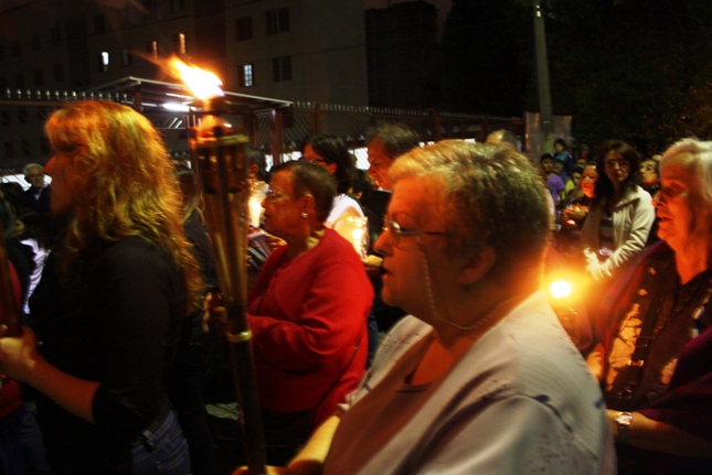À noite a procissão pelas ruas do bairro. Mais e mais pessoas chegavam para acompanhar, rezando e cantando. Seguia à frente a Cruz de Nosso Senhor, a imagem de Nossa Senhora das Dores, as mulheres e o canto da Verônica e, ao final, o esquife do Senhor Martirizado. Na caminhada, as famílias saiam aos portões para sua reverência de fé. No conjunto do IAPI, um altar preparando a chegada do Senhor. Uma multidão se reuniu ali. Uma folha caiu sobre o esquife, e o Pe Julio nos disse que era um sinal em face da questão envolvendo a Praça vizinha que está em litígio com empresários, que certamente terá resultado favorável para a população. No retorno à Paróquia São Miguel, já próximos, as mulheres levaram o andor de Nossa Senhora das Dores.
