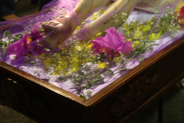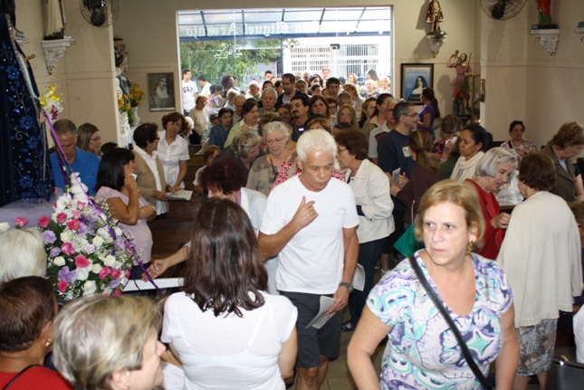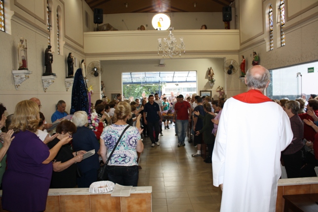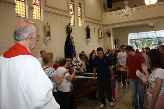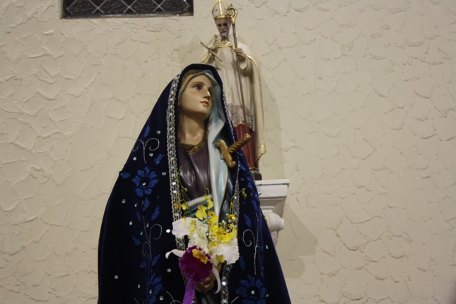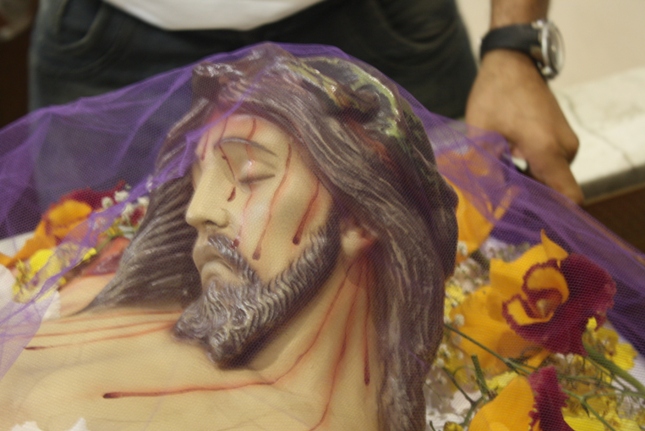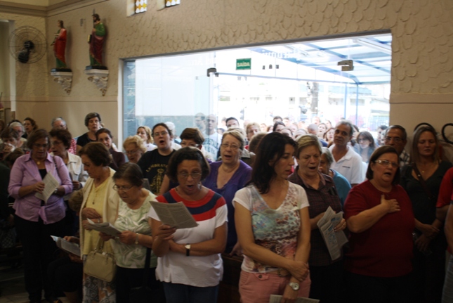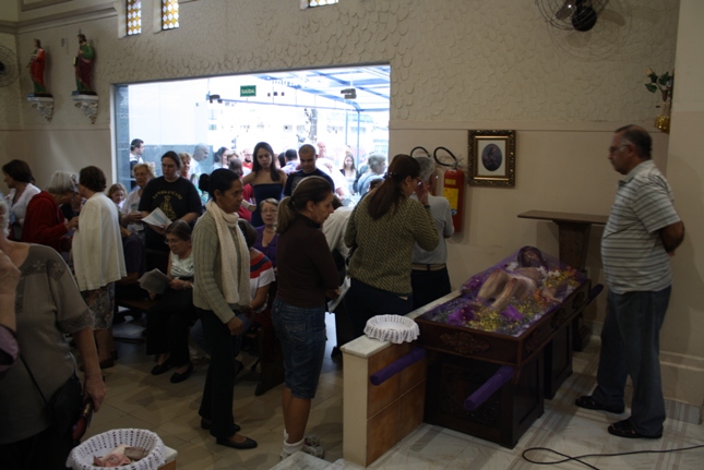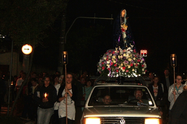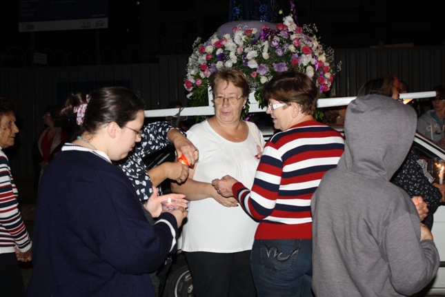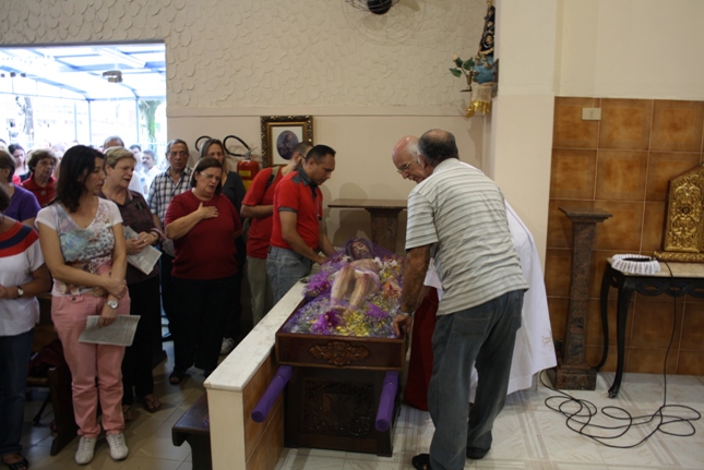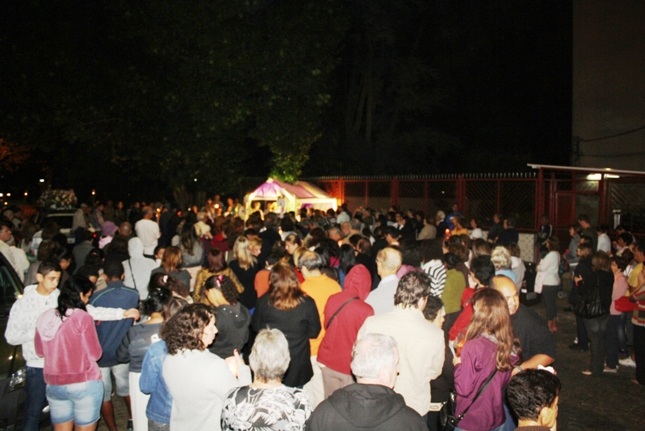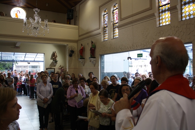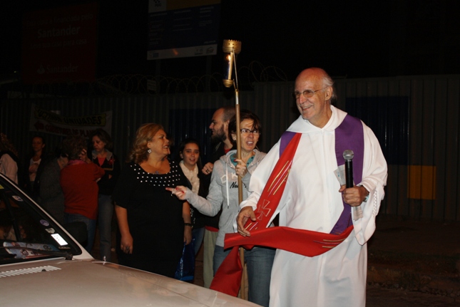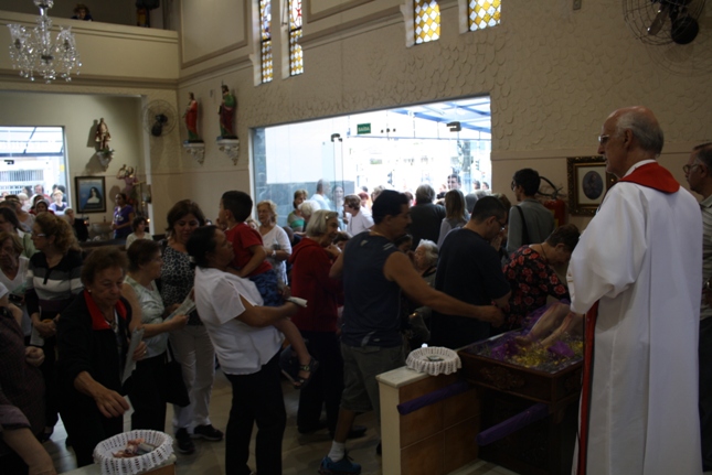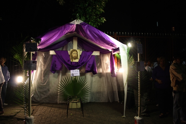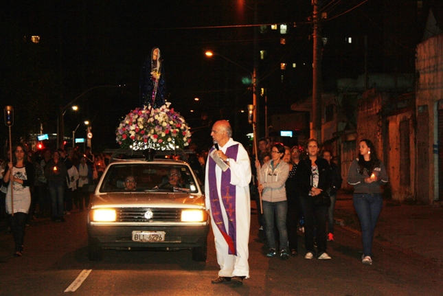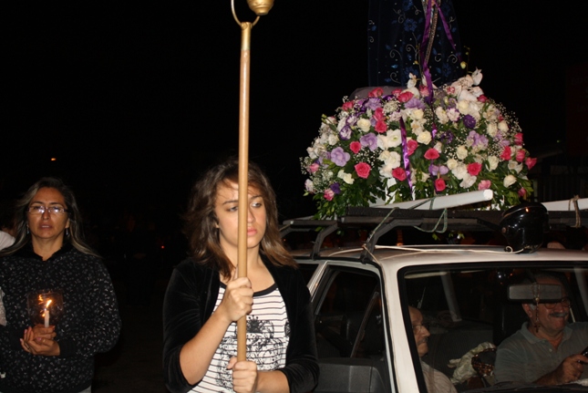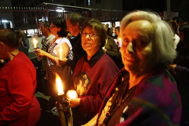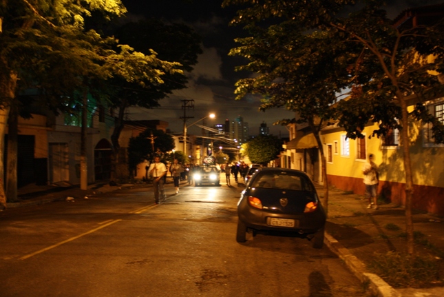 À noite a procissão pelas ruas do bairro. Mais e mais pessoas chegavam para acompanhar, rezando e cantando. Seguia à frente a Cruz de Nosso Senhor, a imagem de Nossa Senhora das Dores, as mulheres e o canto da Verônica e, ao final, o esquife do Senhor Martirizado. Na caminhada, as famílias saiam aos portões para sua reverência de fé. No conjunto do IAPI, um altar preparando a chegada do Senhor. Uma multidão se reuniu ali. Uma folha caiu sobre o esquife, e o Pe Julio nos disse que era um sinal em face da questão envolvendo a Praça vizinha que está em litígio com empresários, que certamente terá resultado favorável para a população. No retorno à Paróquia São Miguel, já próximos, as mulheres levaram o andor de Nossa Senhora das Dores.