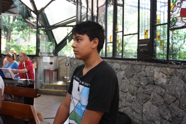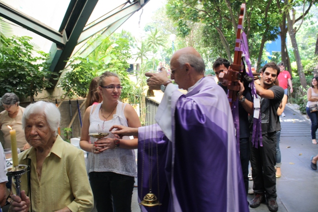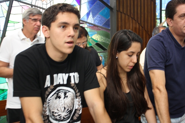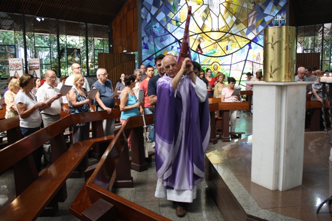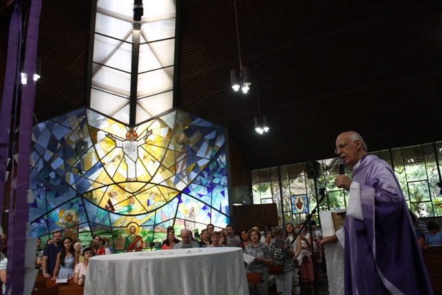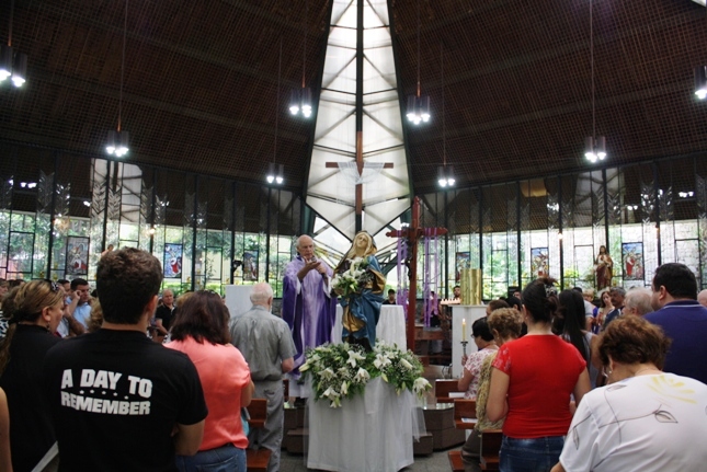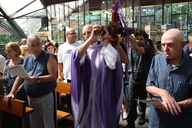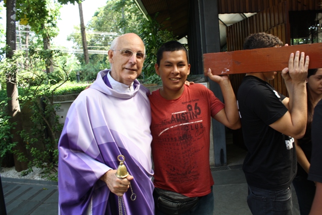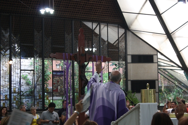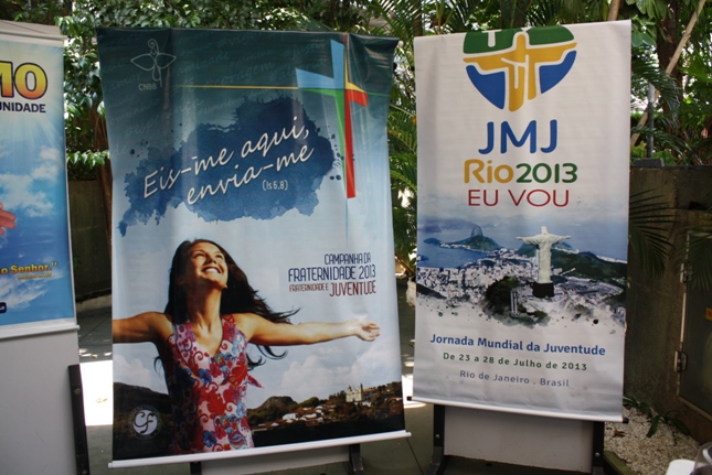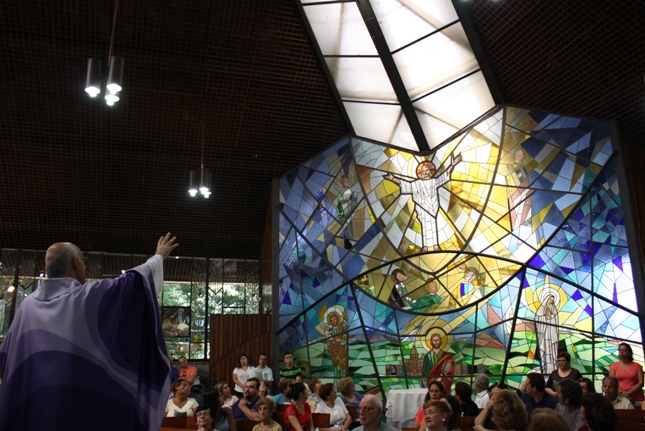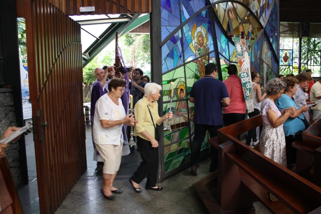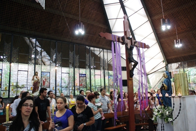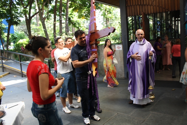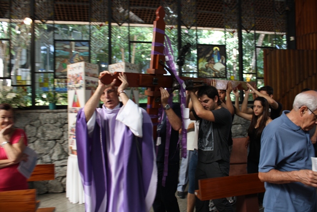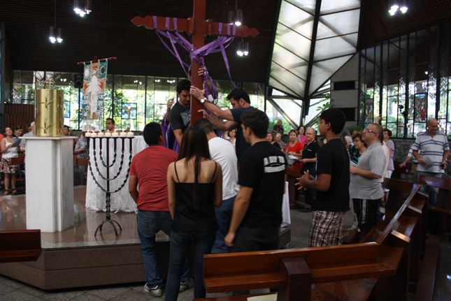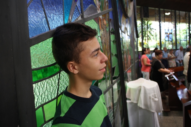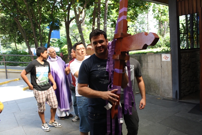 Os jovens carregam a Cruz e participam ativamente das celebrações. É o Ano da Fé e nele toda a preparação para a Jornada Mundial da Juventude. Também nas fotos o destaque para o vitral da Capela da Universidade São Judas Tadeu, que traz a Transfiguração.