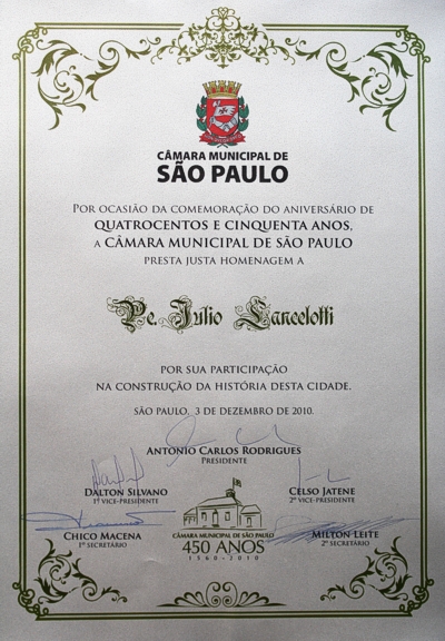Em Sessão Solene realizada na sexta-feira (03/12), o padre Júlio Lancellotti, foi homenageado pela Câmara Municipal de São Paulo, em ato relativo às comemorações dos 450 anos do Poder Legislativo Municipal, celebrados neste ano de 2010.