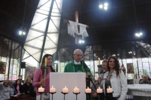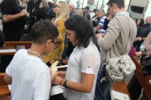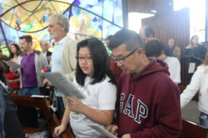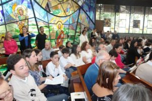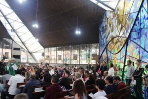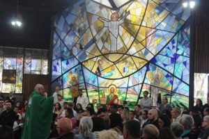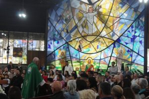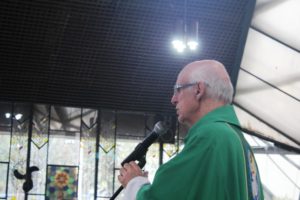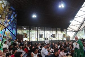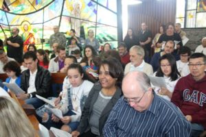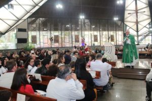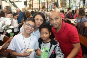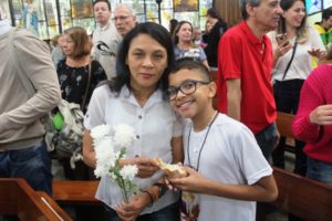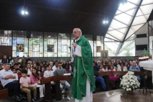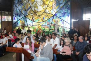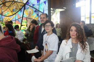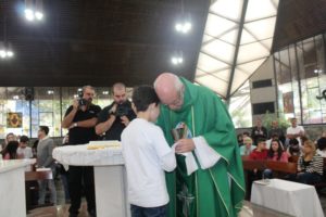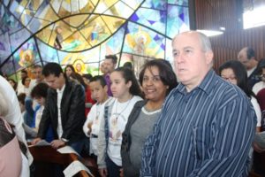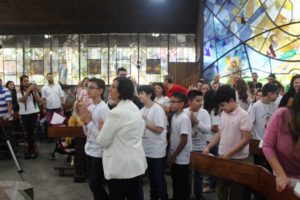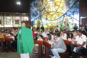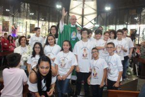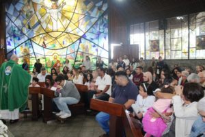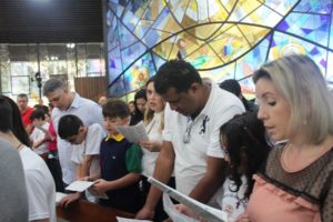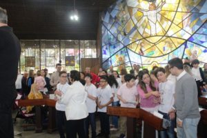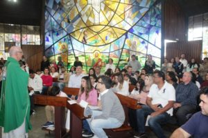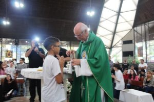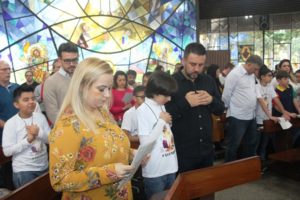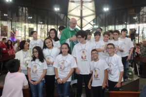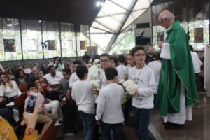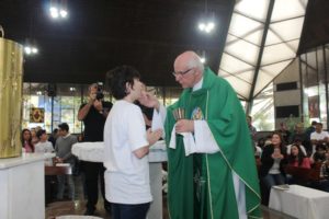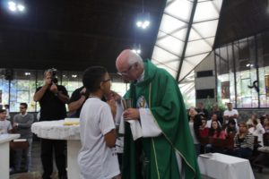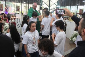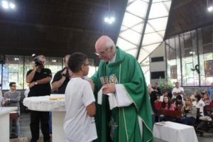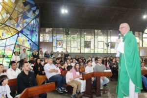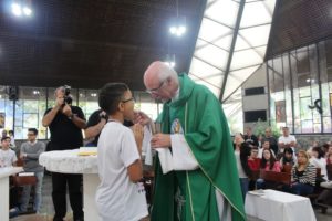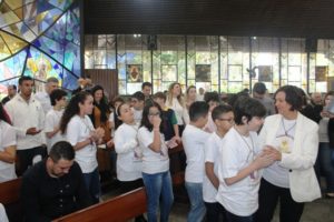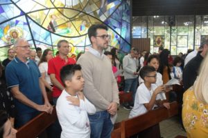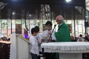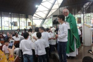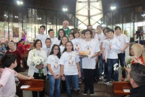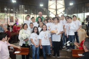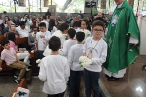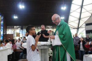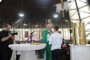 Depois a missa prosseguiu e os jovens primeiro ouviram as leituras e o Evangelho. Meditaram com a homilia do Pe Julio. Depois receberam a primeira Eucaristia, com a alegria do recebimento desse sacramento.