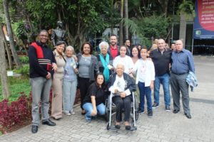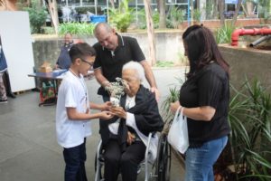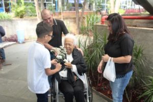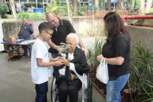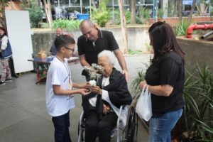 O Pe Julio pediu que as crianças levassem uma flor do altar para uma pessoa idosa, exercitando a partilha. Nas fotos o exercício do carinho a uma idoso, com destaque.