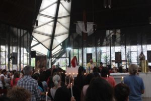 No final da missa a capela iluminada pelas velas e o carinho a Nossa Senhora com as orações e cantos. O Pedrinho fez uma bonita homenagem às mães.