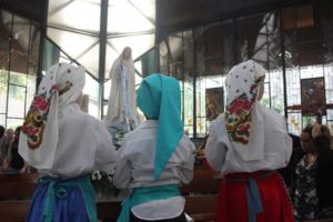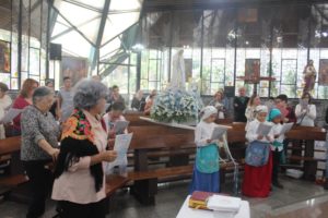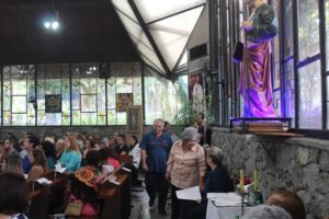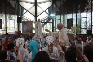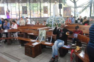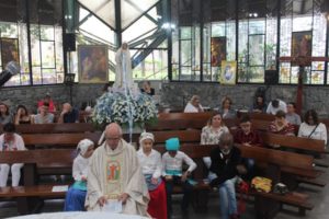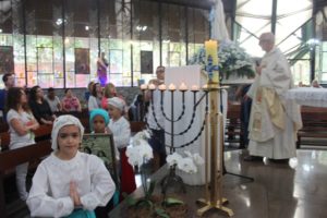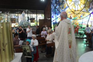 No final da missa a capela iluminada pelas velas e o carinho a Nossa Senhora com as orações e cantos. O Pedrinho fez uma bonita homenagem às mães.
