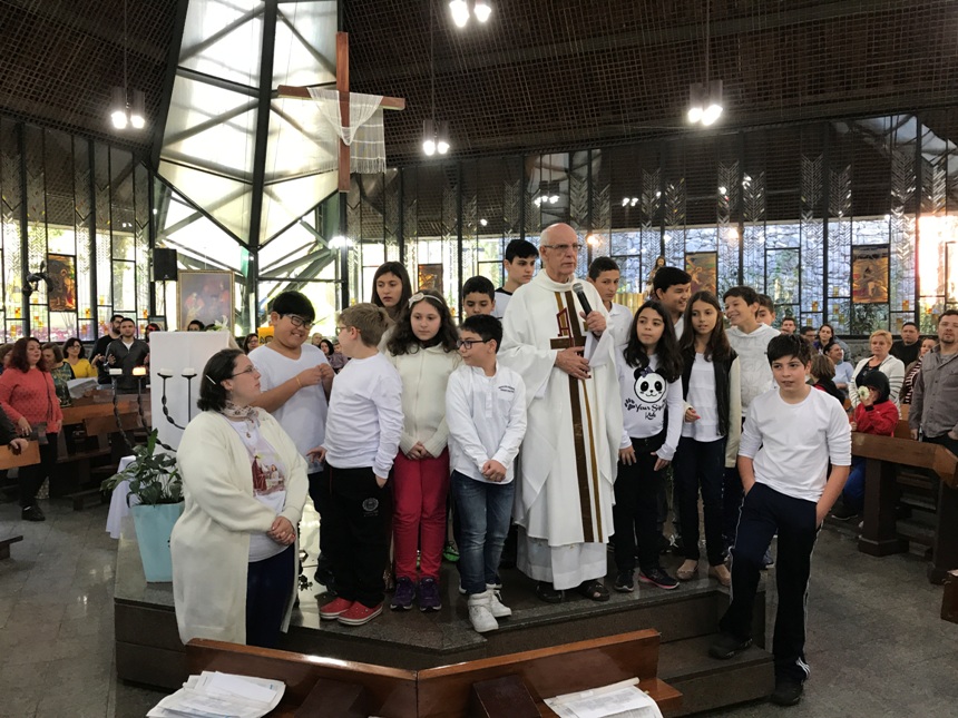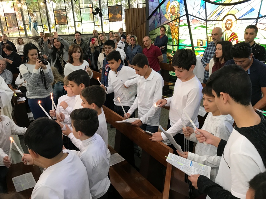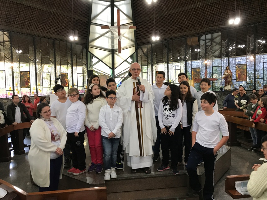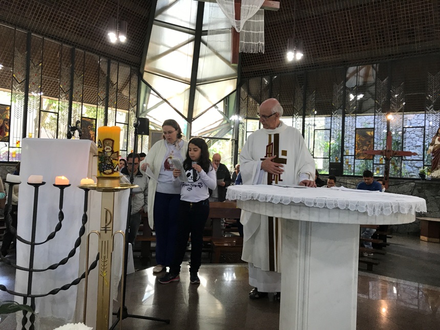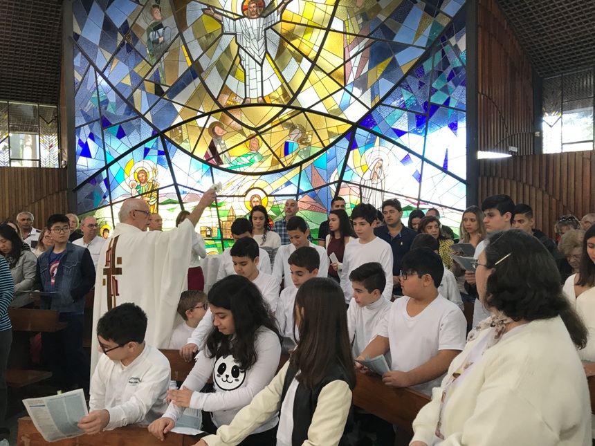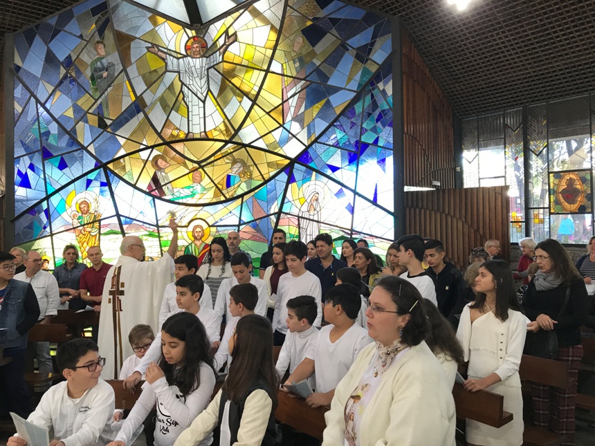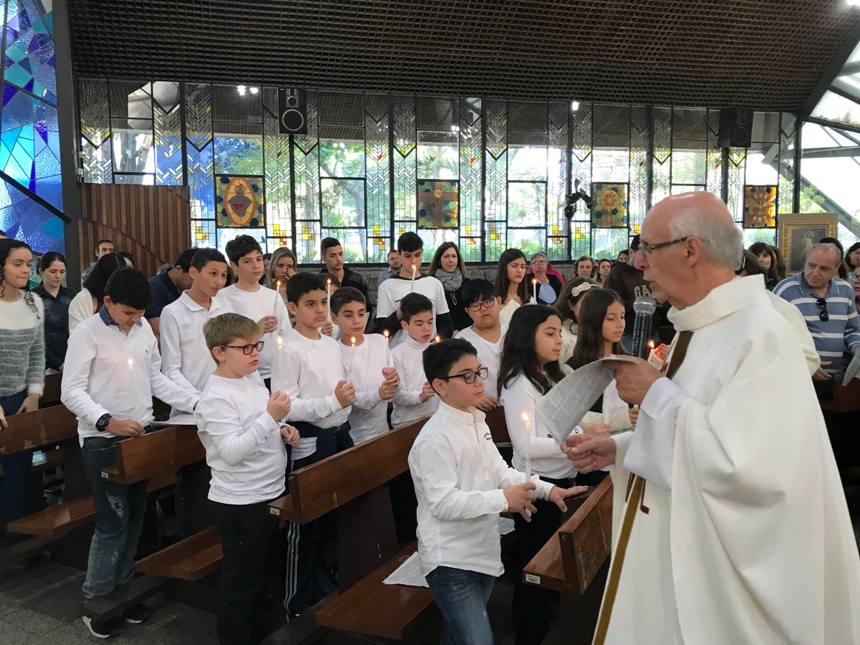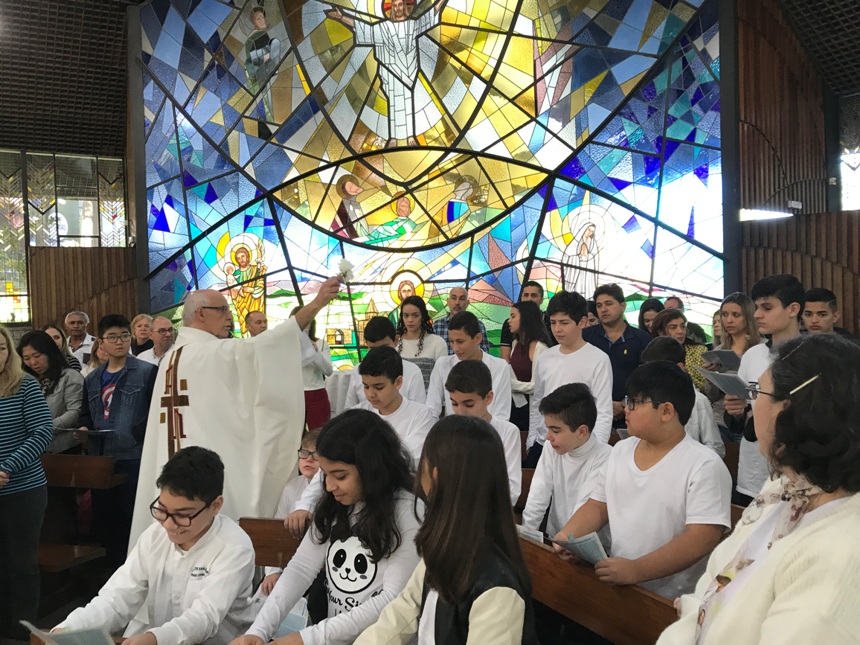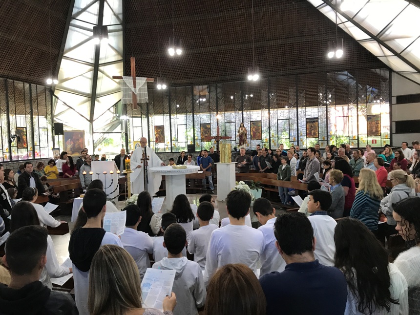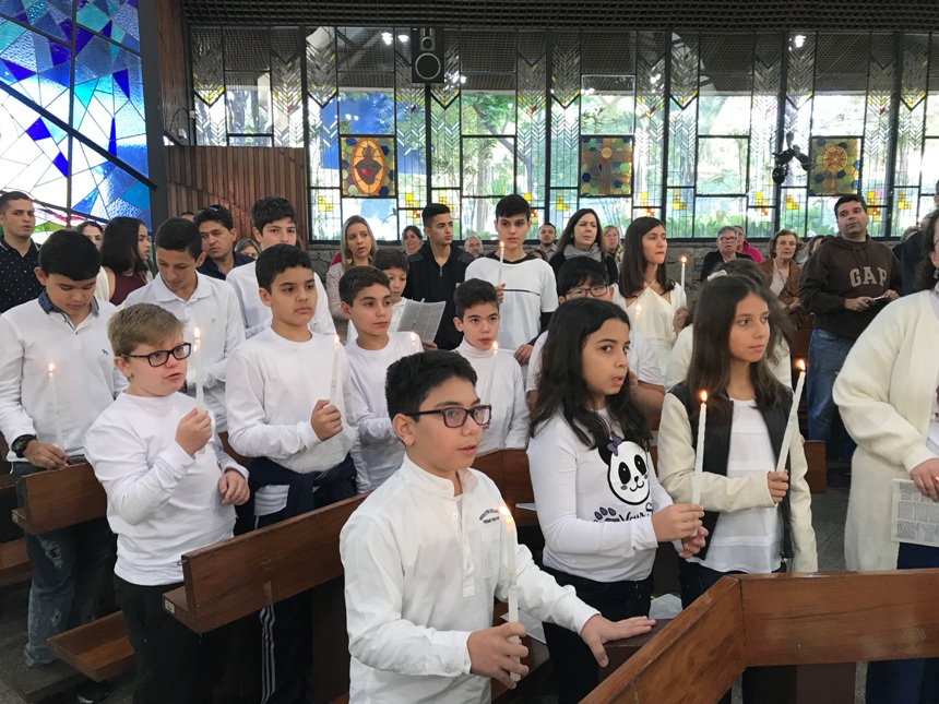 Crianças e adolescentes da Comunidade São Miguel Arcanjo, na preparação para a Primeira Eucaristia, renovaram as promessas do batismo neste domingo, 11/06/17 na missa das 10h, que aconteceu na Capela universitária São Miguel Arcanjo.