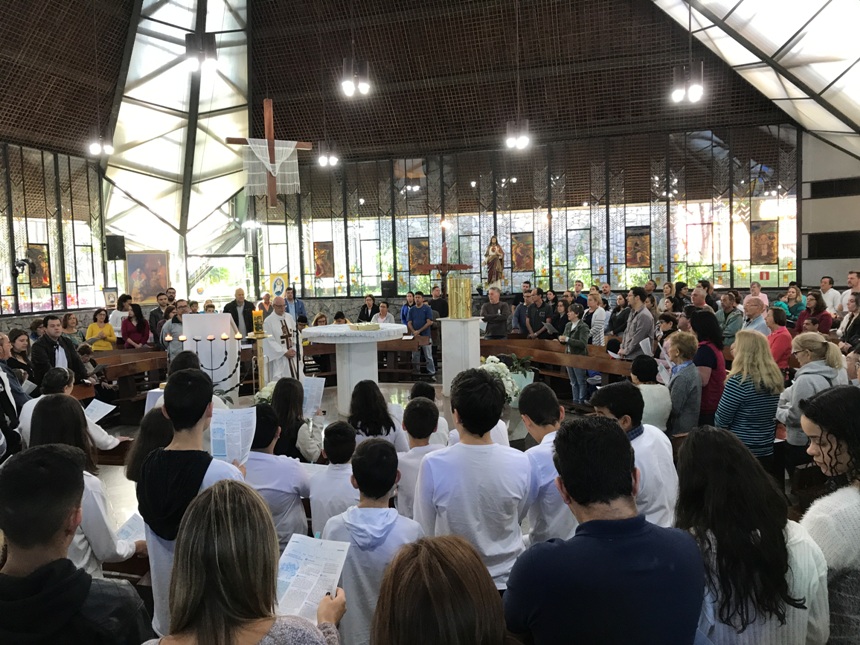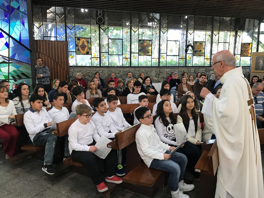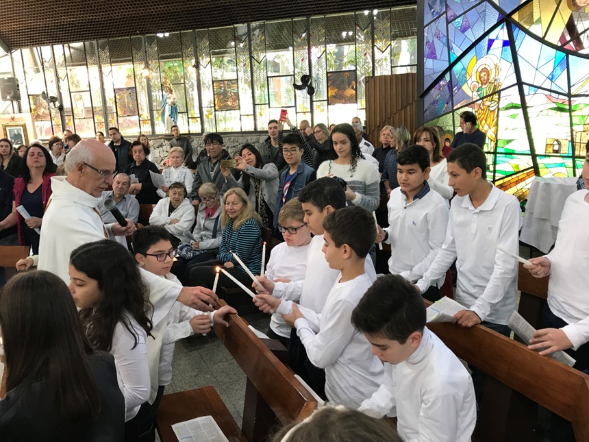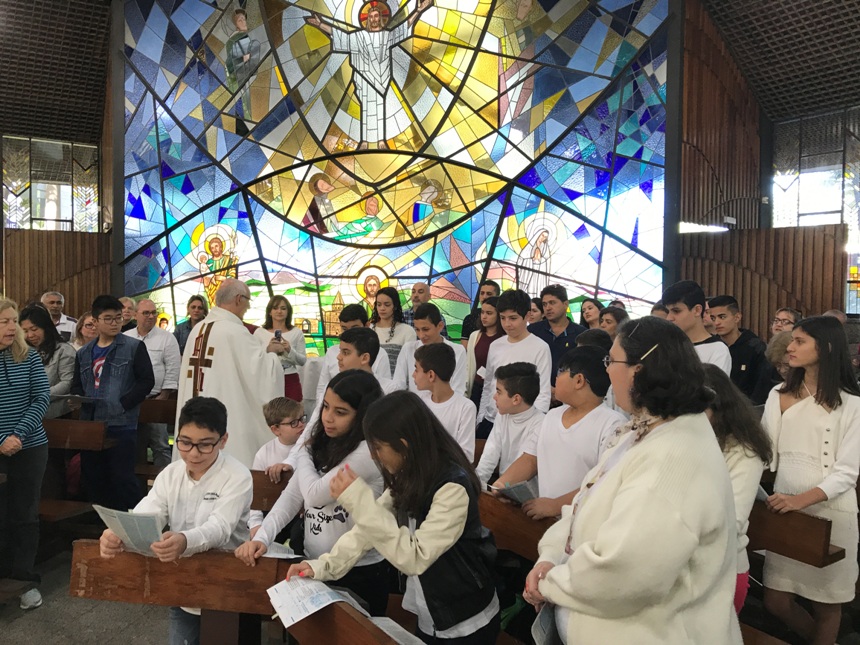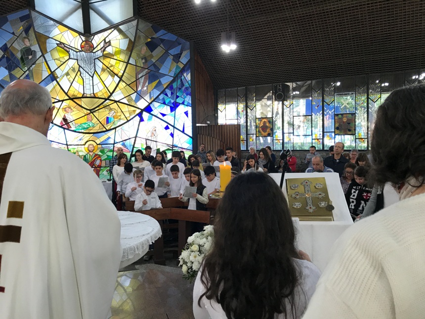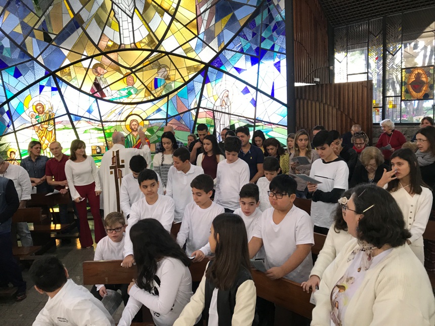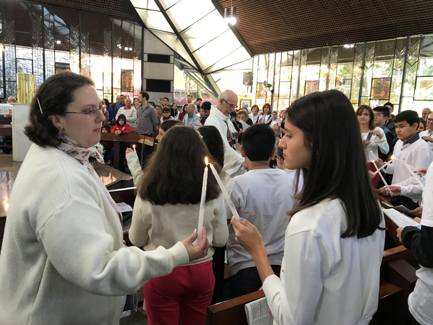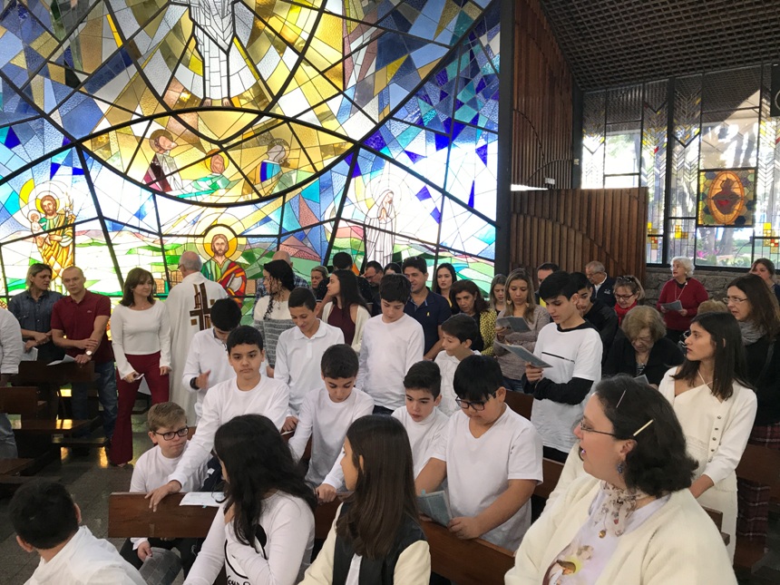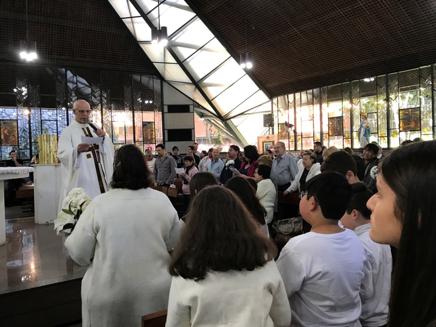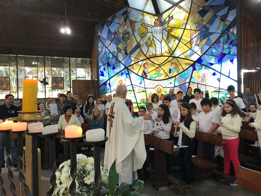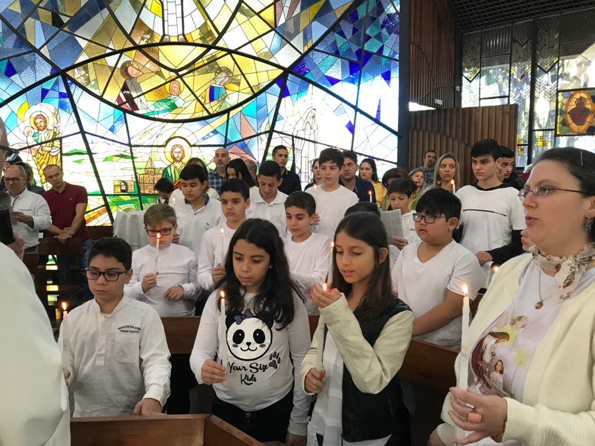 Crianças e adolescentes da Comunidade São Miguel Arcanjo, na preparação para a Primeira Eucaristia, renovaram as promessas do batismo neste domingo, 11/06/17 na missa das 10h, que aconteceu na Capela universitária São Miguel Arcanjo.