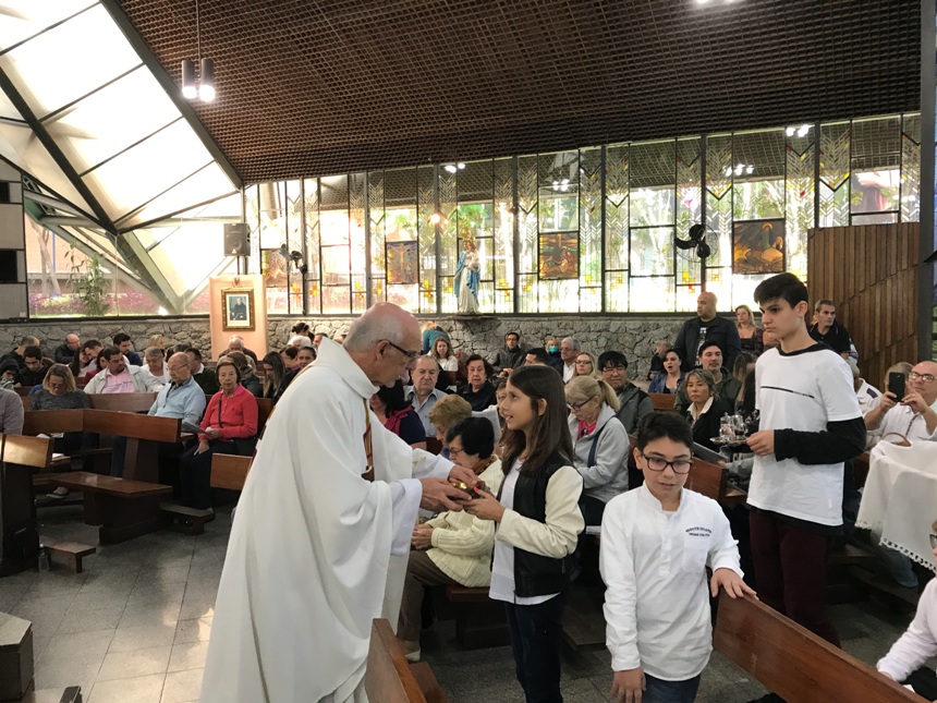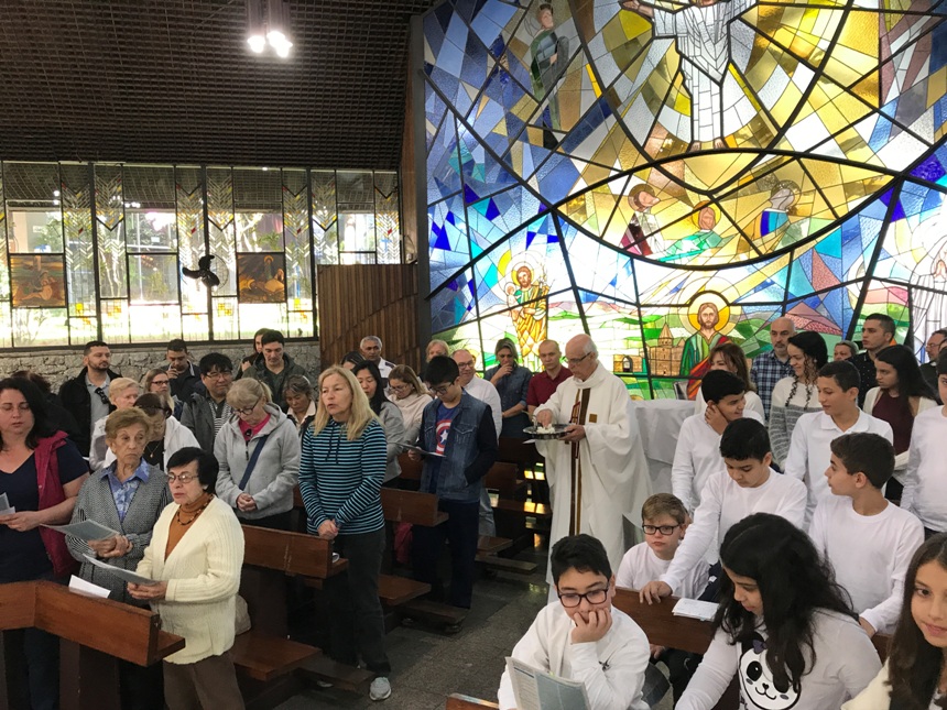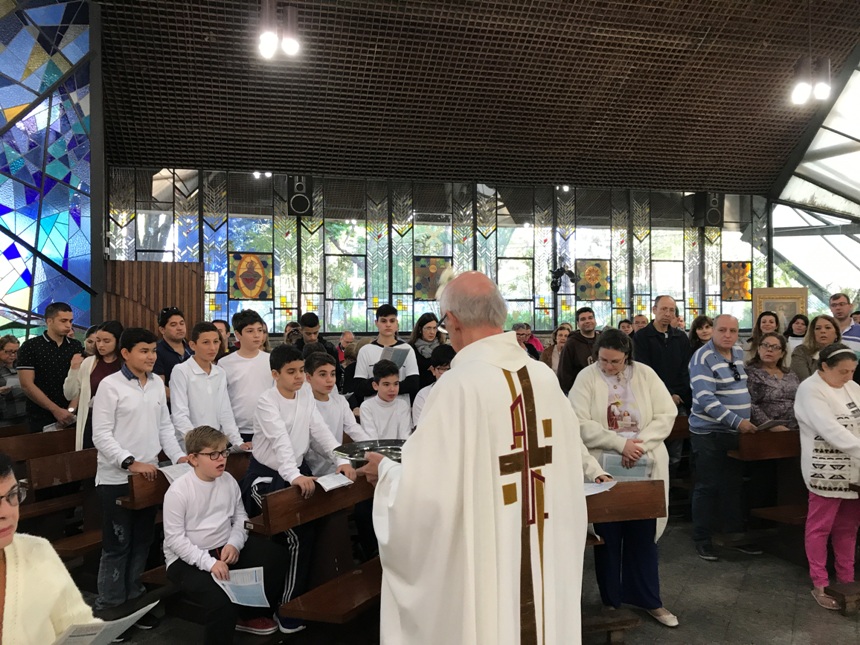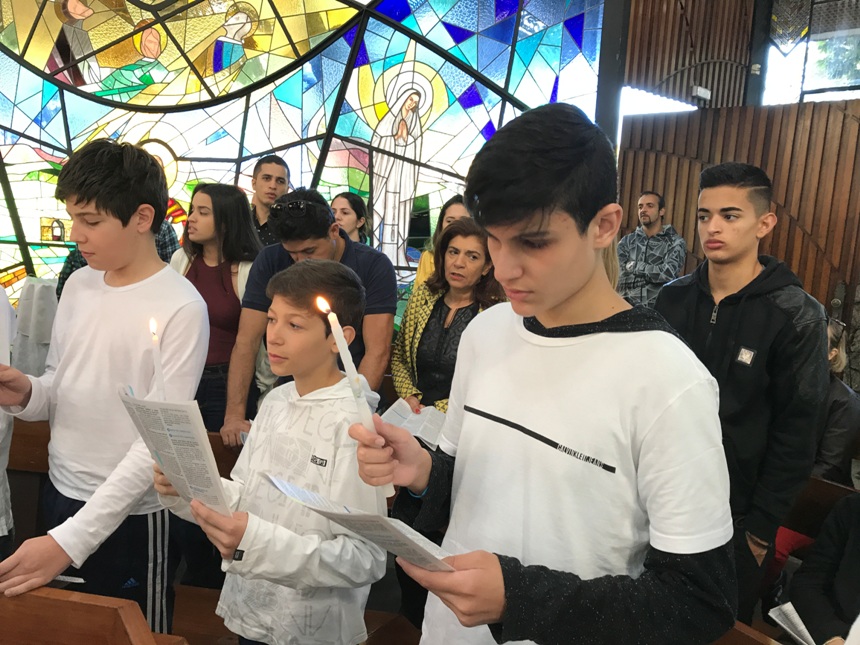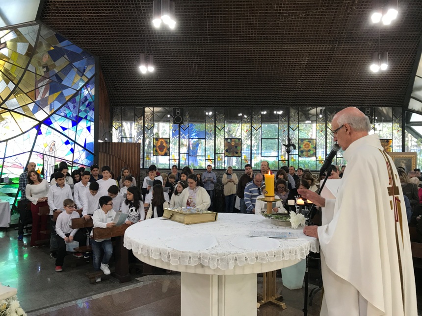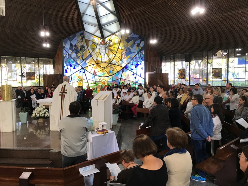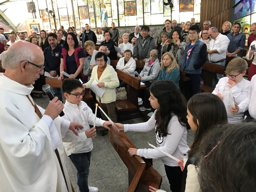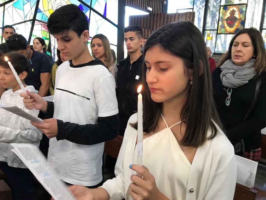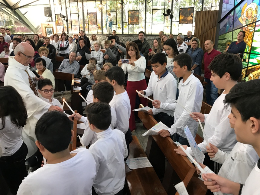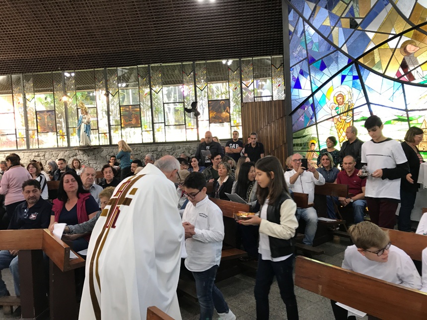 Crianças e adolescentes da Comunidade São Miguel Arcanjo, na preparação para a Primeira Eucaristia, renovaram as promessas do batismo neste domingo, 11/06/17 na missa das 10h, que aconteceu na Capela universitária São Miguel Arcanjo.