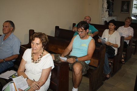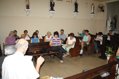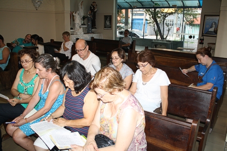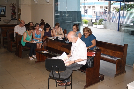A primeira etapa da reunião foi para tratar da liturgia. Como acontece uma vez por mês, a comunidade se reuniu para aprender um pouco mais com o Pe. Júlio como participar melhor da liturgia, como toná-la mais bonita e funcional.