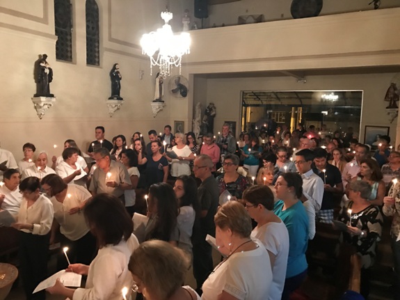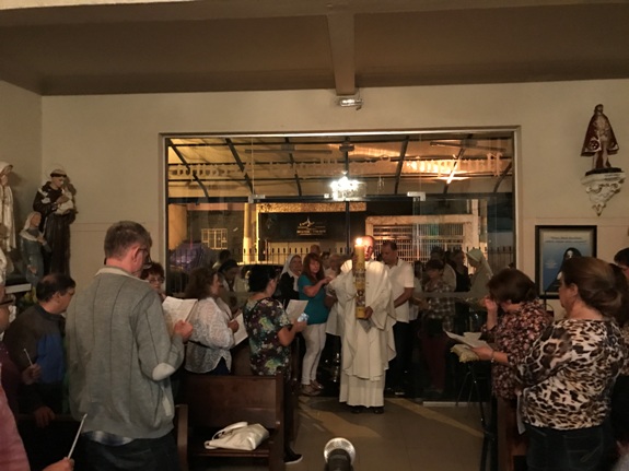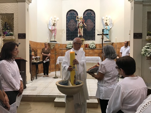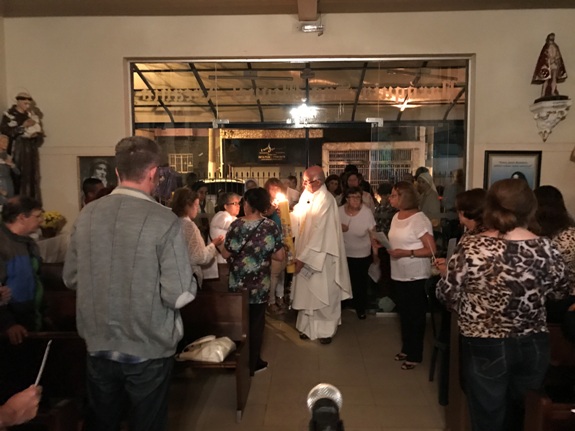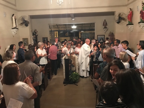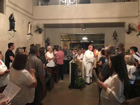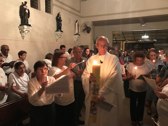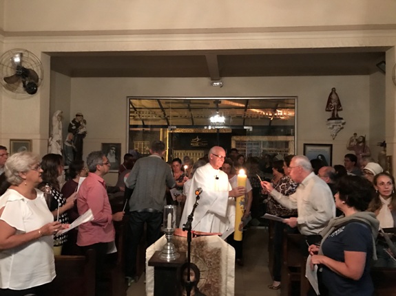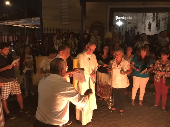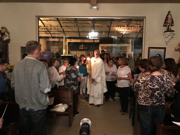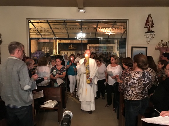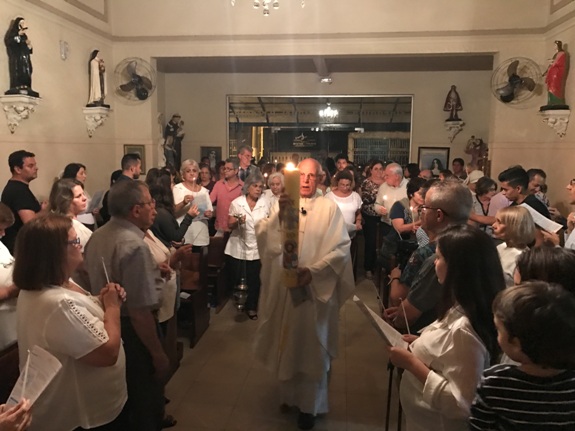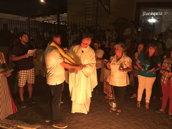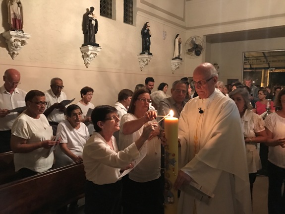 Seguiu-se à BÊNÇÃO DO FOGO. Depois, levando o Círio nas mãos, entramos na igreja, cujas lâmpadas foram apagadas. Dirigiu-se ao altar, enquanto cantou, por três vezes, a aclamação: Eis a luz de Cristo.  Depois da segunda vez, as pessoas acenderam as velas a partir do Círio. Novmente o Pe Julio disse: Eis a luz de Cristo! E todos repetiram:. Demos graças a Deus!