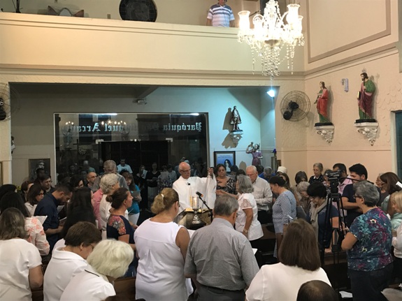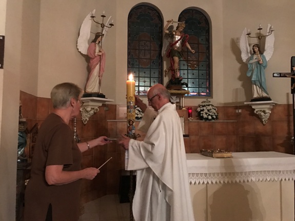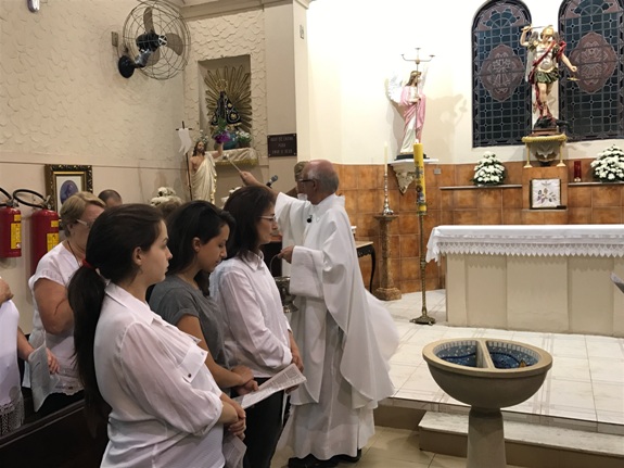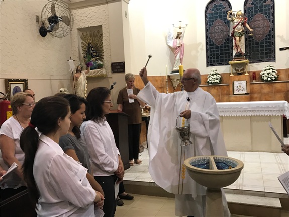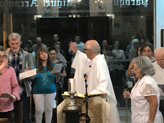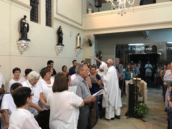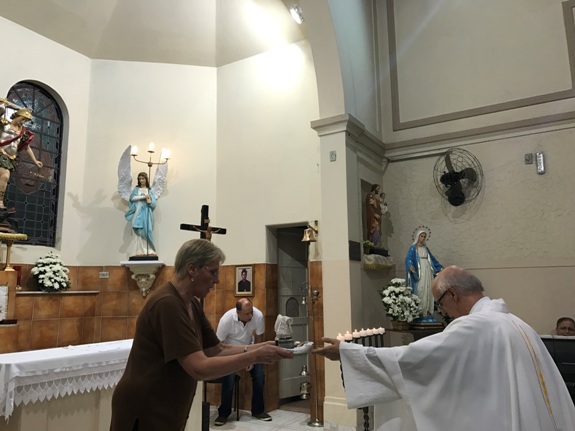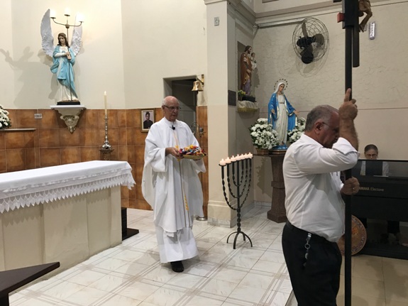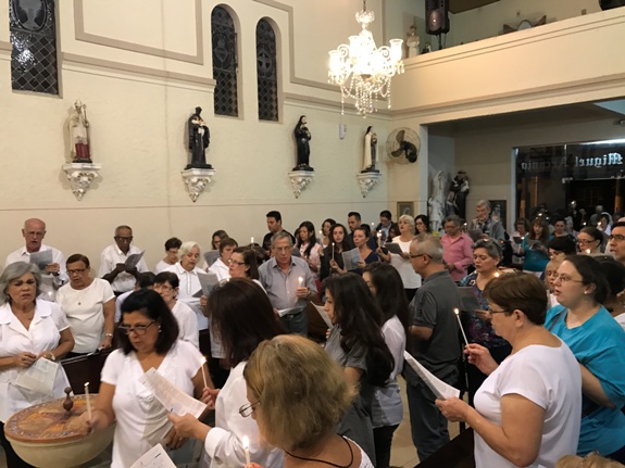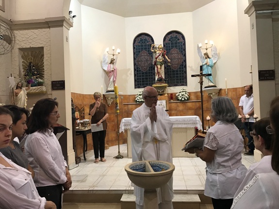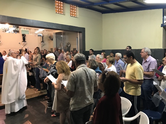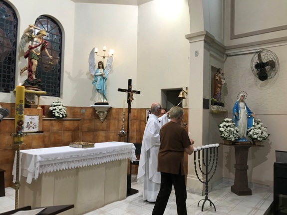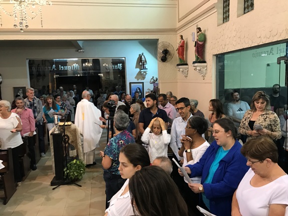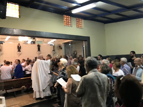 Seguiu-se à BÊNÇÃO DO FOGO. Depois, levando o Círio nas mãos, entramos na igreja, cujas lâmpadas foram apagadas. Dirigiu-se ao altar, enquanto cantou, por três vezes, a aclamação: Eis a luz de Cristo.  Depois da segunda vez, as pessoas acenderam as velas a partir do Círio. Novmente o Pe Julio disse: Eis a luz de Cristo! E todos repetiram:. Demos graças a Deus!
