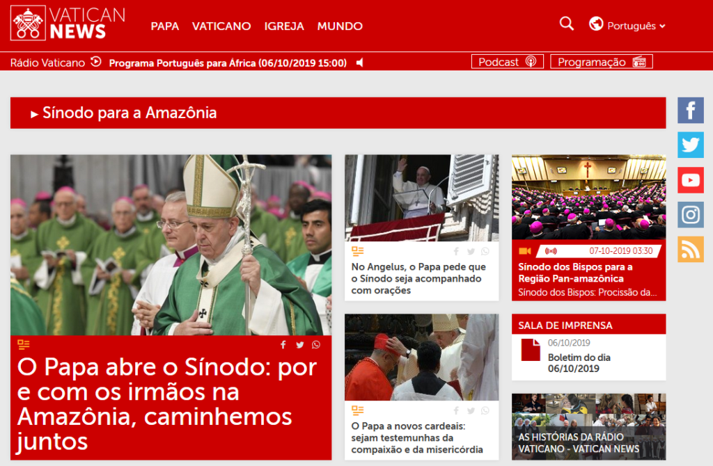 Começou no domingo, 06/10, a assembleia do Sínodo para Amazônia. Evento convocado pelo Papa Francisco, o Sínodo tem enfrentado resistências e gerado informações distorcidas. Por isso, o Pe. Julio recomenda: “não acompanhem pela Globo, pela Record nem pelo SBT… Precisamos acompanhar nas fontes corretas”. Mais detalhes nos avisos paroquiais da semana, gravados no final da missa das 10h na capela da Universidade São Judas Tadeu: