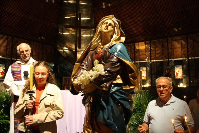 No final, os homens da Comunidade São Miguel Arcanjo se colocaram ao lado de Nossa Senhora das Dores e rezaram uma dezena do Terço, acompanhados pelas mulheres. Depois de termos feito a reflexão de todo o sofrimento de Jesus até o Calvário, a imagem de Nossa Senhora emocionou a todos.