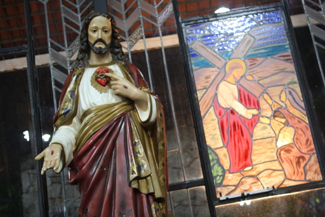 2ª Estação – Jesus carrega a Cruz. Colocaram a cruz sobe os seus ombros. Ele não apenas aceitou a imposição da cruz, mas abraçou-a livremente por amor. No peso da sua cruz assumiu e carregou todos os sofrimentos, lágrimas e tristezas da humanidade.