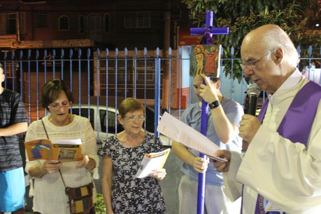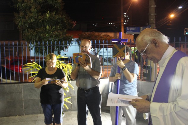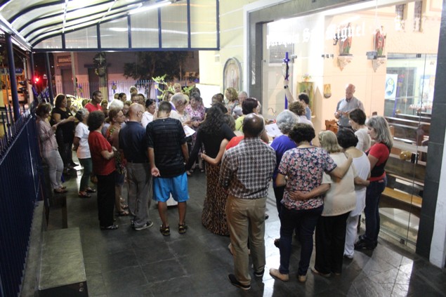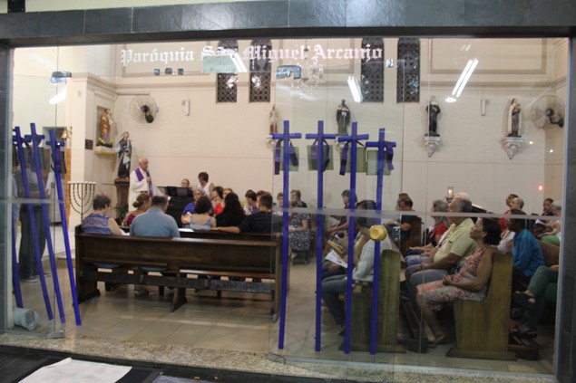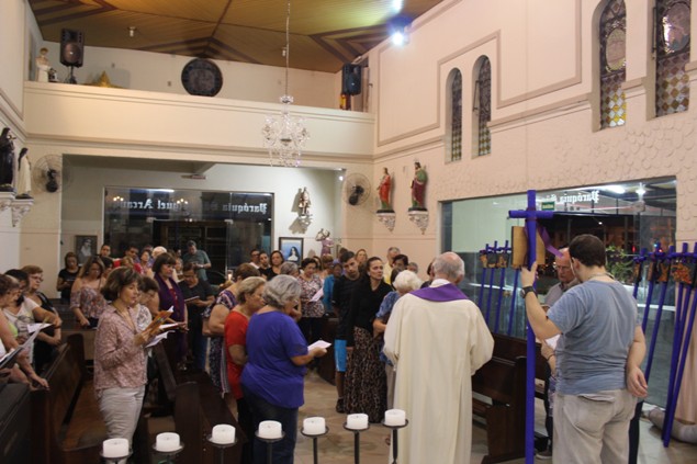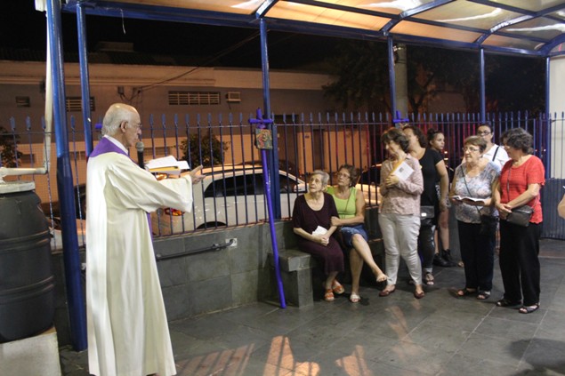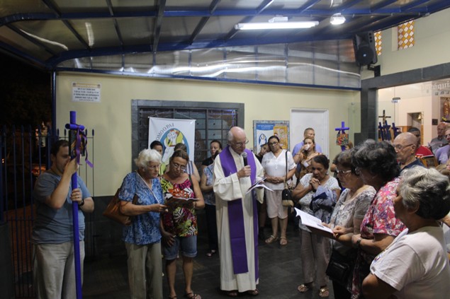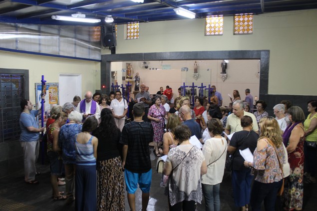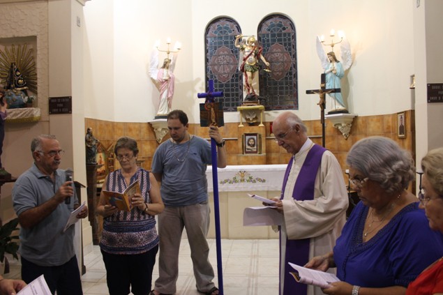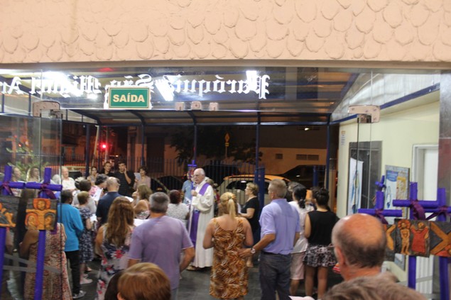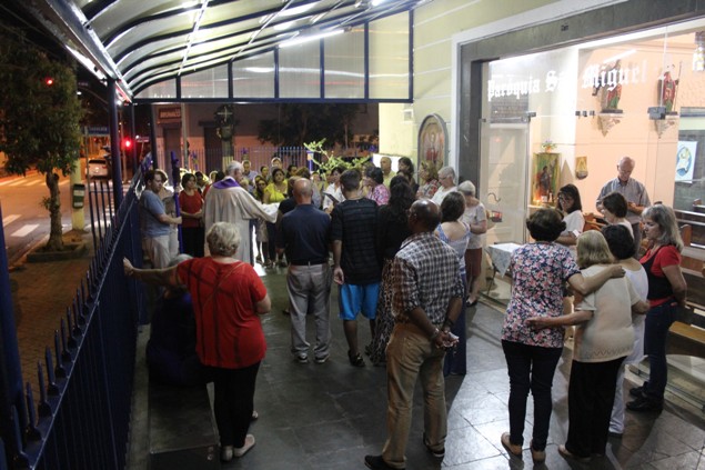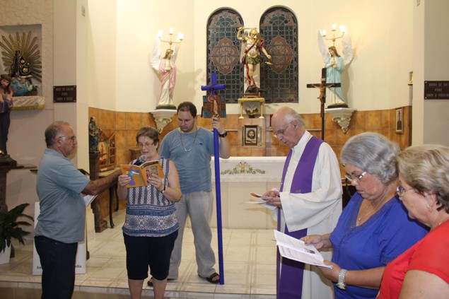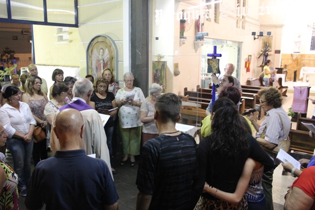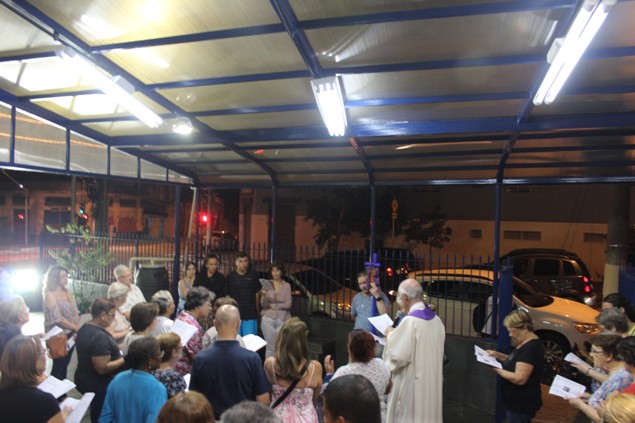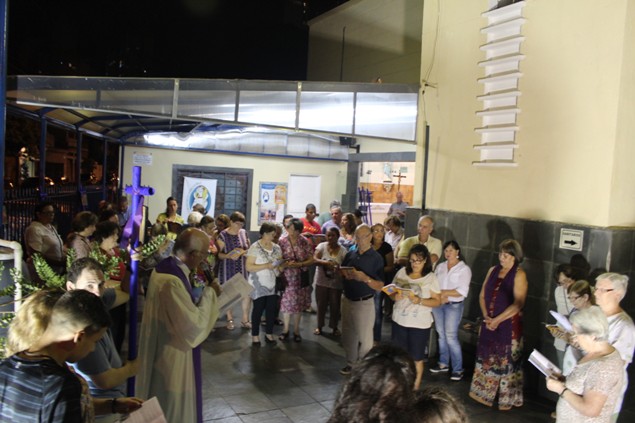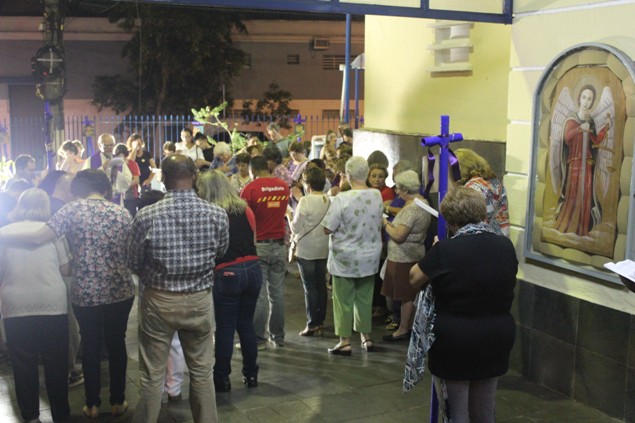 Na sexta-feira, 26/02/16 às 20h, foi celebrada a Via Sacra na Igreja São Miguel Arcanjo. O Fabretti e a Cidinha preparam com carinho os quadros das 15 estações. O Pe Julio dirigiu cada estação, com os leitores utilizando o subsídio da Região Episcopal Belém, Casa Comum – nossa responsabilidade. A caminhada, seguindo os passos de Jesus, iniciou dentro da Igreja e prosseguiu pela lateral até a porta principal. Momento destacado dentro da Quaresma.
