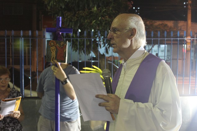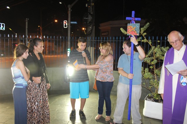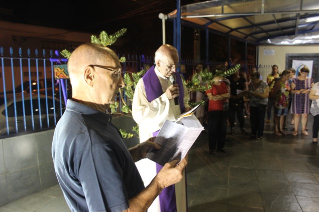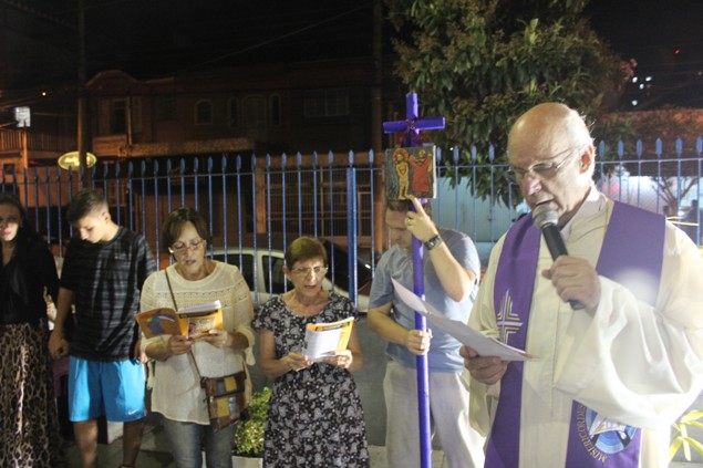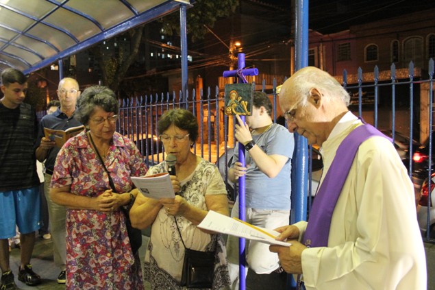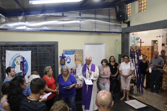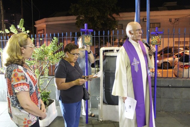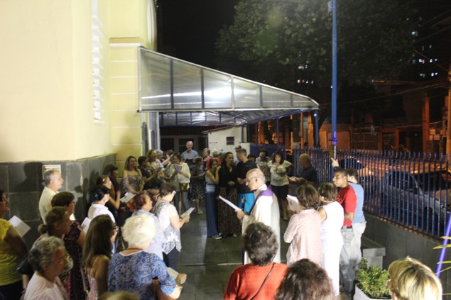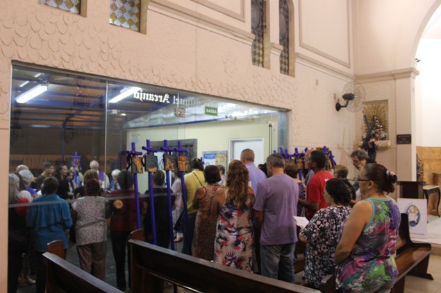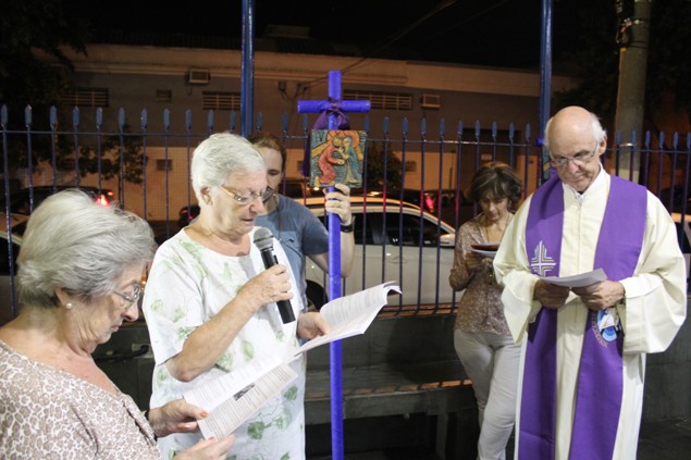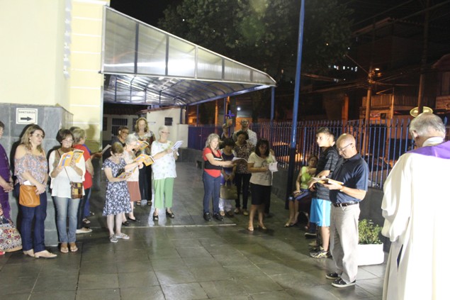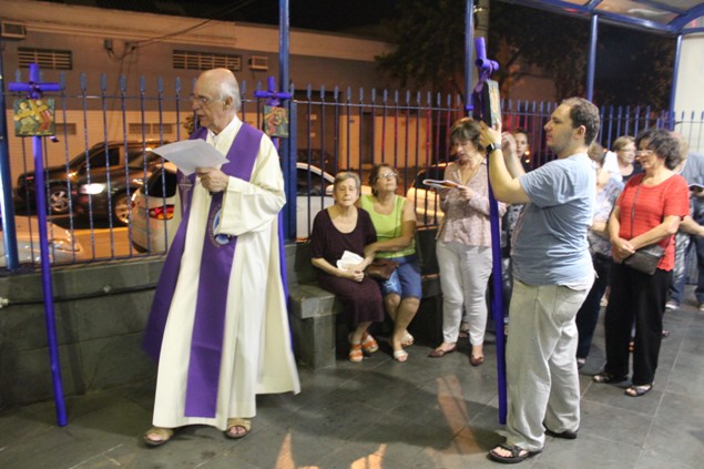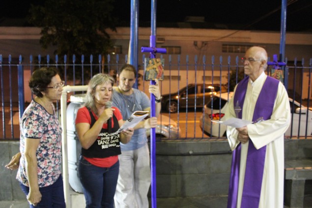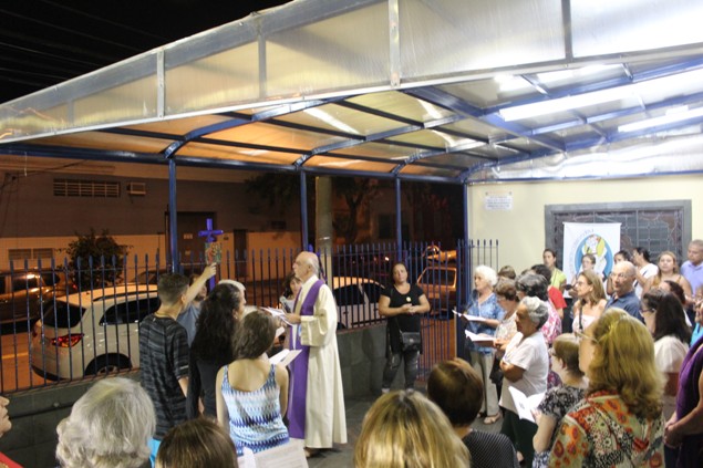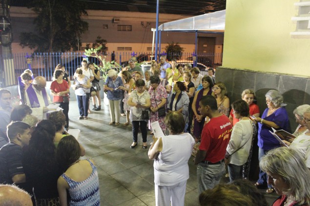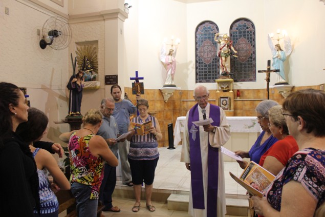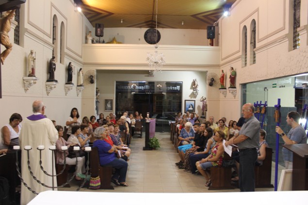 Na sexta-feira, 26/02/16 às 20h, foi celebrada a Via Sacra na Igreja São Miguel Arcanjo. O Fabretti e a Cidinha preparam com carinho os quadros das 15 estações. O Pe Julio dirigiu cada estação, com os leitores utilizando o subsídio da Região Episcopal Belém, Casa Comum – nossa responsabilidade. A caminhada, seguindo os passos de Jesus, iniciou dentro da Igreja e prosseguiu pela lateral até a porta principal. Momento destacado dentro da Quaresma.